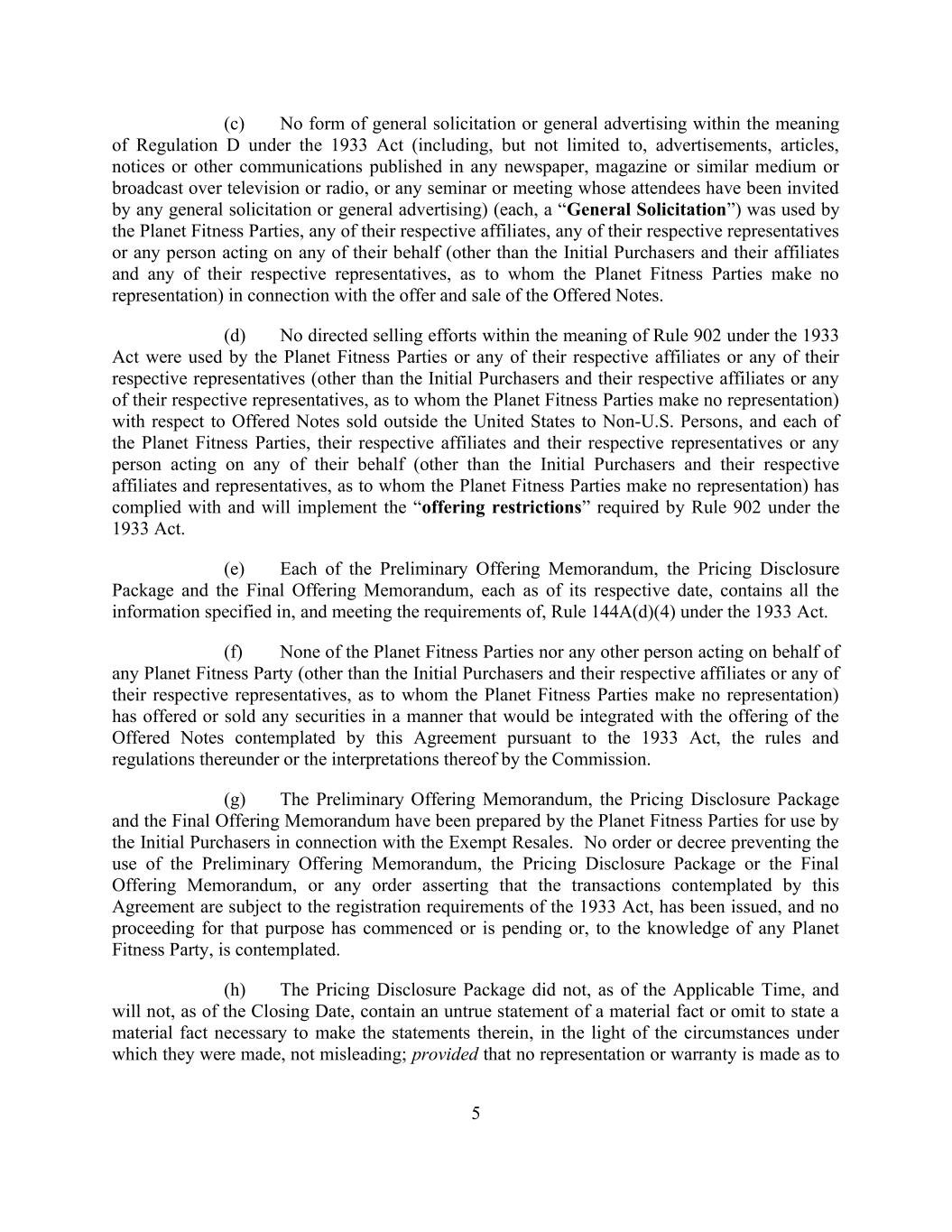 5 (c) No form of general solicitation or general advertising within the meaning of Regulation D under the 1933 Act (including, but not limited to, advertisements, articles, notices or other communications published in any newspaper, magazine or similar medium or broadcast over television or radio, or any seminar or meeting whose attendees have been invited by any general solicitation or general advertising) (each, a “General Solicitation”) was used by the Planet Fitness Parties, any of their respective affiliates, any of their respective representatives or any person acting on any of their behalf (other than the Initial Purchasers and their affiliates and any of their respective representatives, as to whom the Planet Fitness Parties make no representation) in connection with the offer and sale of the Offered Notes. (d) No directed selling efforts within the meaning of Rule 902 under the 1933 Act were used by the Planet Fitness Parties or any of their respective affiliates or any of their respective representatives (other than the Initial Purchasers and their respective affiliates or any of their respective representatives, as to whom the Planet Fitness Parties make no representation) with respect to Offered Notes sold outside the United States to Non-U.S. Persons, and each of the Planet Fitness Parties, their respective affiliates and their respective representatives or any person acting on any of their behalf (other than the Initial Purchasers and their respective affiliates and representatives, as to whom the Planet Fitness Parties make no representation) has complied with and will implement the “offering restrictions” required by Rule 902 under the 1933 Act. (e) Each of the Preliminary Offering Memorandum, the Pricing Disclosure Package and the Final Offering Memorandum, each as of its respective date, contains all the information specified in, and meeting the requirements of, Rule 144A(d)(4) under the 1933 Act. (f) None of the Planet Fitness Parties nor any other person acting on behalf of any Planet Fitness Party (other than the Initial Purchasers and their respective affiliates or any of their respective representatives, as to whom the Planet Fitness Parties make no representation) has offered or sold any securities in a manner that would be integrated with the offering of the Offered Notes contemplated by this Agreement pursuant to the 1933 Act, the rules and regulations thereunder or the interpretations thereof by the Commission. (g) The Preliminary Offering Memorandum, the Pricing Disclosure Package and the Final Offering Memorandum have been prepared by the Planet Fitness Parties for use by the Initial Purchasers in connection with the Exempt Resales. No order or decree preventing the use of the Preliminary Offering Memorandum, the Pricing Disclosure Package or the Final Offering Memorandum, or any order asserting that the transactions contemplated by this Agreement are subject to the registration requirements of the 1933 Act, has been issued, and no proceeding for that purpose has commenced or is pending or, to the knowledge of any Planet Fitness Party, is contemplated. (h) The Pricing Disclosure Package did not, as of the Applicable Time, and will not, as of the Closing Date, contain an untrue statement of a material fact or omit to state a material fact necessary to make the statements therein, in the light of the circumstances under which they were made, not misleading; provided that no representation or warranty is made as to