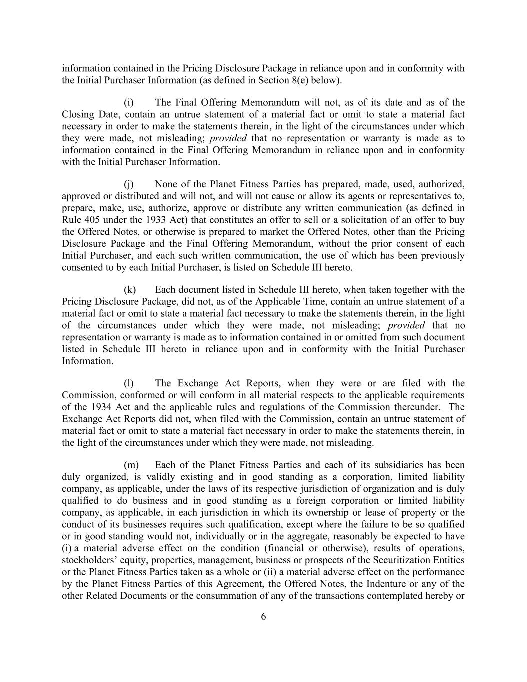 6 information contained in the Pricing Disclosure Package in reliance upon and in conformity with the Initial Purchaser Information (as defined in Section 8(e) below). (i) The Final Offering Memorandum will not, as of its date and as of the Closing Date, contain an untrue statement of a material fact or omit to state a material fact necessary in order to make the statements therein, in the light of the circumstances under which they were made, not misleading; provided that no representation or warranty is made as to information contained in the Final Offering Memorandum in reliance upon and in conformity with the Initial Purchaser Information. (j) None of the Planet Fitness Parties has prepared, made, used, authorized, approved or distributed and will not, and will not cause or allow its agents or representatives to, prepare, make, use, authorize, approve or distribute any written communication (as defined in Rule 405 under the 1933 Act) that constitutes an offer to sell or a solicitation of an offer to buy the Offered Notes, or otherwise is prepared to market the Offered Notes, other than the Pricing Disclosure Package and the Final Offering Memorandum, without the prior consent of each Initial Purchaser, and each such written communication, the use of which has been previously consented to by each Initial Purchaser, is listed on Schedule III hereto. (k) Each document listed in Schedule III hereto, when taken together with the Pricing Disclosure Package, did not, as of the Applicable Time, contain an untrue statement of a material fact or omit to state a material fact necessary to make the statements therein, in the light of the circumstances under which they were made, not misleading; provided that no representation or warranty is made as to information contained in or omitted from such document listed in Schedule III hereto in reliance upon and in conformity with the Initial Purchaser Information. (l) The Exchange Act Reports, when they were or are filed with the Commission, conformed or will conform in all material respects to the applicable requirements of the 1934 Act and the applicable rules and regulations of the Commission thereunder. The Exchange Act Reports did not, when filed with the Commission, contain an untrue statement of material fact or omit to state a material fact necessary in order to make the statements therein, in the light of the circumstances under which they were made, not misleading. (m) Each of the Planet Fitness Parties and each of its subsidiaries has been duly organized, is validly existing and in good standing as a corporation, limited liability company, as applicable, under the laws of its respective jurisdiction of organization and is duly qualified to do business and in good standing as a foreign corporation or limited liability company, as applicable, in each jurisdiction in which its ownership or lease of property or the conduct of its businesses requires such qualification, except where the failure to be so qualified or in good standing would not, individually or in the aggregate, reasonably be expected to have (i) a material adverse effect on the condition (financial or otherwise), results of operations, stockholders’ equity, properties, management, business or prospects of the Securitization Entities or the Planet Fitness Parties taken as a whole or (ii) a material adverse effect on the performance by the Planet Fitness Parties of this Agreement, the Offered Notes, the Indenture or any of the other Related Documents or the consummation of any of the transactions contemplated hereby or