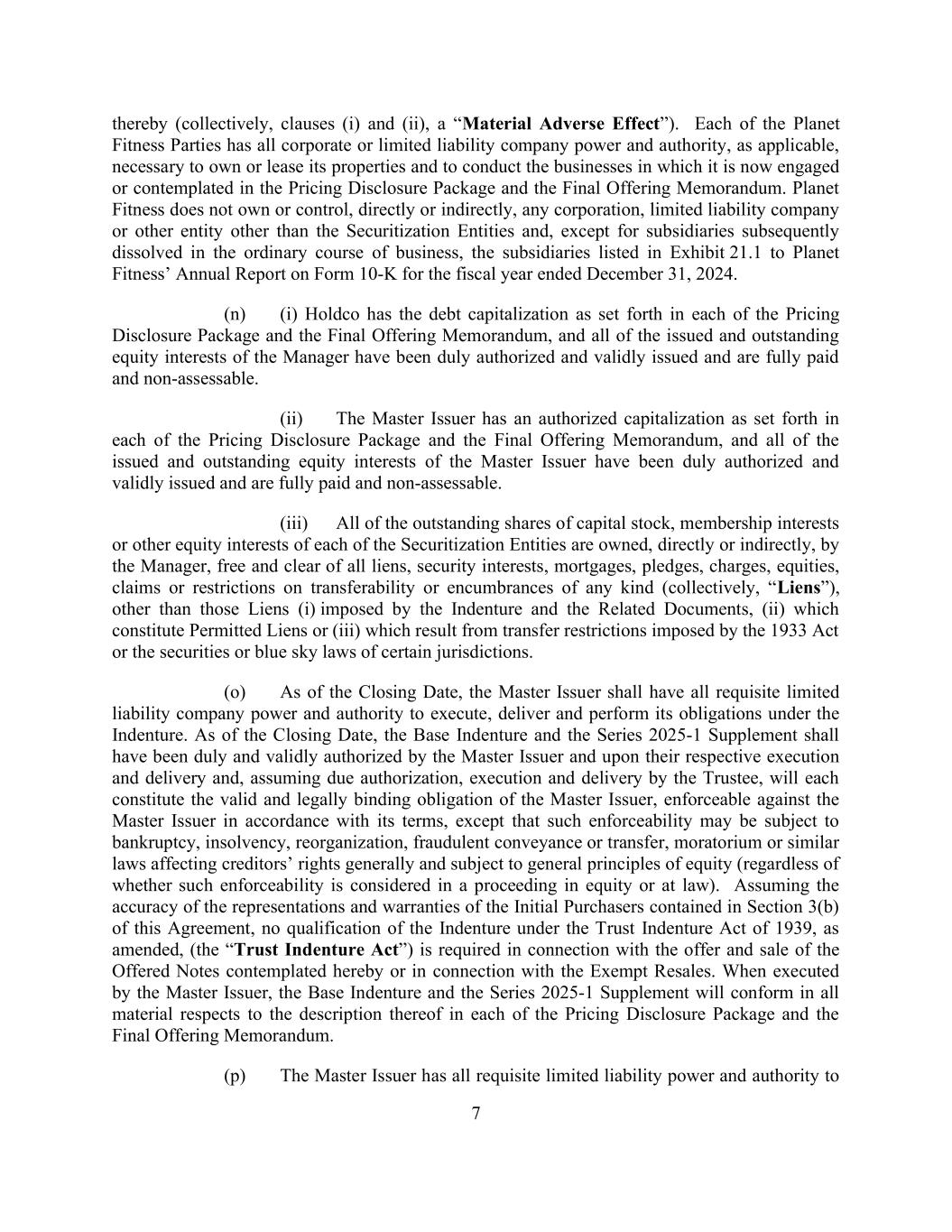 7 thereby (collectively, clauses (i) and (ii), a “Material Adverse Effect”). Each of the Planet Fitness Parties has all corporate or limited liability company power and authority, as applicable, necessary to own or lease its properties and to conduct the businesses in which it is now engaged or contemplated in the Pricing Disclosure Package and the Final Offering Memorandum. Planet Fitness does not own or control, directly or indirectly, any corporation, limited liability company or other entity other than the Securitization Entities and, except for subsidiaries subsequently dissolved in the ordinary course of business, the subsidiaries listed in Exhibit 21.1 to Planet Fitness’ Annual Report on Form 10-K for the fiscal year ended December 31, 2024. (n) (i) Holdco has the debt capitalization as set forth in each of the Pricing Disclosure Package and the Final Offering Memorandum, and all of the issued and outstanding equity interests of the Manager have been duly authorized and validly issued and are fully paid and non-assessable. (ii) The Master Issuer has an authorized capitalization as set forth in each of the Pricing Disclosure Package and the Final Offering Memorandum, and all of the issued and outstanding equity interests of the Master Issuer have been duly authorized and validly issued and are fully paid and non-assessable. (iii) All of the outstanding shares of capital stock, membership interests or other equity interests of each of the Securitization Entities are owned, directly or indirectly, by the Manager, free and clear of all liens, security interests, mortgages, pledges, charges, equities, claims or restrictions on transferability or encumbrances of any kind (collectively, “Liens”), other than those Liens (i) imposed by the Indenture and the Related Documents, (ii) which constitute Permitted Liens or (iii) which result from transfer restrictions imposed by the 1933 Act or the securities or blue sky laws of certain jurisdictions. (o) As of the Closing Date, the Master Issuer shall have all requisite limited liability company power and authority to execute, deliver and perform its obligations under the Indenture. As of the Closing Date, the Base Indenture and the Series 2025-1 Supplement shall have been duly and validly authorized by the Master Issuer and upon their respective execution and delivery and, assuming due authorization, execution and delivery by the Trustee, will each constitute the valid and legally binding obligation of the Master Issuer, enforceable against the Master Issuer in accordance with its terms, except that such enforceability may be subject to bankruptcy, insolvency, reorganization, fraudulent conveyance or transfer, moratorium or similar laws affecting creditors’ rights generally and subject to general principles of equity (regardless of whether such enforceability is considered in a proceeding in equity or at law). Assuming the accuracy of the representations and warranties of the Initial Purchasers contained in Section 3(b) of this Agreement, no qualification of the Indenture under the Trust Indenture Act of 1939, as amended, (the “Trust Indenture Act”) is required in connection with the offer and sale of the Offered Notes contemplated hereby or in connection with the Exempt Resales. When executed by the Master Issuer, the Base Indenture and the Series 2025-1 Supplement will conform in all material respects to the description thereof in each of the Pricing Disclosure Package and the Final Offering Memorandum. (p) The Master Issuer has all requisite limited liability power and authority to
