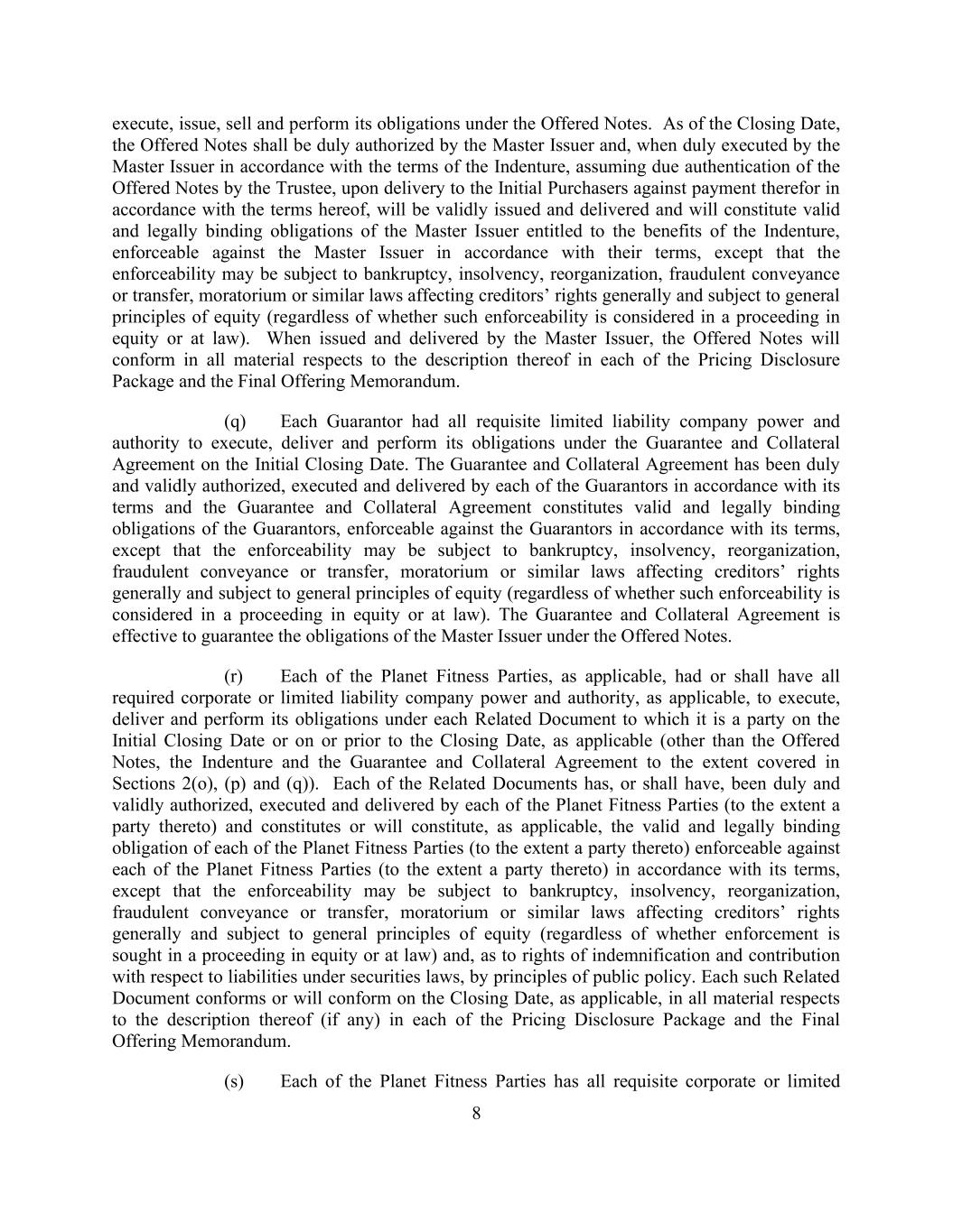 8 execute, issue, sell and perform its obligations under the Offered Notes. As of the Closing Date, the Offered Notes shall be duly authorized by the Master Issuer and, when duly executed by the Master Issuer in accordance with the terms of the Indenture, assuming due authentication of the Offered Notes by the Trustee, upon delivery to the Initial Purchasers against payment therefor in accordance with the terms hereof, will be validly issued and delivered and will constitute valid and legally binding obligations of the Master Issuer entitled to the benefits of the Indenture, enforceable against the Master Issuer in accordance with their terms, except that the enforceability may be subject to bankruptcy, insolvency, reorganization, fraudulent conveyance or transfer, moratorium or similar laws affecting creditors’ rights generally and subject to general principles of equity (regardless of whether such enforceability is considered in a proceeding in equity or at law). When issued and delivered by the Master Issuer, the Offered Notes will conform in all material respects to the description thereof in each of the Pricing Disclosure Package and the Final Offering Memorandum. (q) Each Guarantor had all requisite limited liability company power and authority to execute, deliver and perform its obligations under the Guarantee and Collateral Agreement on the Initial Closing Date. The Guarantee and Collateral Agreement has been duly and validly authorized, executed and delivered by each of the Guarantors in accordance with its terms and the Guarantee and Collateral Agreement constitutes valid and legally binding obligations of the Guarantors, enforceable against the Guarantors in accordance with its terms, except that the enforceability may be subject to bankruptcy, insolvency, reorganization, fraudulent conveyance or transfer, moratorium or similar laws affecting creditors’ rights generally and subject to general principles of equity (regardless of whether such enforceability is considered in a proceeding in equity or at law). The Guarantee and Collateral Agreement is effective to guarantee the obligations of the Master Issuer under the Offered Notes. (r) Each of the Planet Fitness Parties, as applicable, had or shall have all required corporate or limited liability company power and authority, as applicable, to execute, deliver and perform its obligations under each Related Document to which it is a party on the Initial Closing Date or on or prior to the Closing Date, as applicable (other than the Offered Notes, the Indenture and the Guarantee and Collateral Agreement to the extent covered in Sections 2(o), (p) and (q)). Each of the Related Documents has, or shall have, been duly and validly authorized, executed and delivered by each of the Planet Fitness Parties (to the extent a party thereto) and constitutes or will constitute, as applicable, the valid and legally binding obligation of each of the Planet Fitness Parties (to the extent a party thereto) enforceable against each of the Planet Fitness Parties (to the extent a party thereto) in accordance with its terms, except that the enforceability may be subject to bankruptcy, insolvency, reorganization, fraudulent conveyance or transfer, moratorium or similar laws affecting creditors’ rights generally and subject to general principles of equity (regardless of whether enforcement is sought in a proceeding in equity or at law) and, as to rights of indemnification and contribution with respect to liabilities under securities laws, by principles of public policy. Each such Related Document conforms or will conform on the Closing Date, as applicable, in all material respects to the description thereof (if any) in each of the Pricing Disclosure Package and the Final Offering Memorandum. (s) Each of the Planet Fitness Parties has all requisite corporate or limited