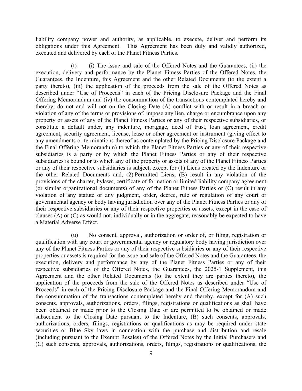 9 liability company power and authority, as applicable, to execute, deliver and perform its obligations under this Agreement. This Agreement has been duly and validly authorized, executed and delivered by each of the Planet Fitness Parties. (t) (i) The issue and sale of the Offered Notes and the Guarantees, (ii) the execution, delivery and performance by the Planet Fitness Parties of the Offered Notes, the Guarantees, the Indenture, this Agreement and the other Related Documents (to the extent a party thereto), (iii) the application of the proceeds from the sale of the Offered Notes as described under “Use of Proceeds” in each of the Pricing Disclosure Package and the Final Offering Memorandum and (iv) the consummation of the transactions contemplated hereby and thereby, do not and will not on the Closing Date (A) conflict with or result in a breach or violation of any of the terms or provisions of, impose any lien, charge or encumbrance upon any property or assets of any of the Planet Fitness Parties or any of their respective subsidiaries, or constitute a default under, any indenture, mortgage, deed of trust, loan agreement, credit agreement, security agreement, license, lease or other agreement or instrument (giving effect to any amendments or terminations thereof as contemplated by the Pricing Disclosure Package and the Final Offering Memorandum) to which the Planet Fitness Parties or any of their respective subsidiaries is a party or by which the Planet Fitness Parties or any of their respective subsidiaries is bound or to which any of the property or assets of any of the Planet Fitness Parties or any of their respective subsidiaries is subject, except for (1) Liens created by the Indenture or the other Related Documents and, (2) Permitted Liens, (B) result in any violation of the provisions of the charter, bylaws, certificate of formation or limited liability company agreement (or similar organizational documents) of any of the Planet Fitness Parties or (C) result in any violation of any statute or any judgment, order, decree, rule or regulation of any court or governmental agency or body having jurisdiction over any of the Planet Fitness Parties or any of their respective subsidiaries or any of their respective properties or assets, except in the case of clauses (A) or (C) as would not, individually or in the aggregate, reasonably be expected to have a Material Adverse Effect. (u) No consent, approval, authorization or order of, or filing, registration or qualification with any court or governmental agency or regulatory body having jurisdiction over any of the Planet Fitness Parties or any of their respective subsidiaries or any of their respective properties or assets is required for the issue and sale of the Offered Notes and the Guarantees, the execution, delivery and performance by any of the Planet Fitness Parties or any of their respective subsidiaries of the Offered Notes, the Guarantees, the 2025-1 Supplement, this Agreement and the other Related Documents (to the extent they are parties thereto), the application of the proceeds from the sale of the Offered Notes as described under “Use of Proceeds” in each of the Pricing Disclosure Package and the Final Offering Memorandum and the consummation of the transactions contemplated hereby and thereby, except for (A) such consents, approvals, authorizations, orders, filings, registrations or qualifications as shall have been obtained or made prior to the Closing Date or are permitted to be obtained or made subsequent to the Closing Date pursuant to the Indenture, (B) such consents, approvals, authorizations, orders, filings, registrations or qualifications as may be required under state securities or Blue Sky laws in connection with the purchase and distribution and resale (including pursuant to the Exempt Resales) of the Offered Notes by the Initial Purchasers and (C) such consents, approvals, authorizations, orders, filings, registrations or qualifications, the