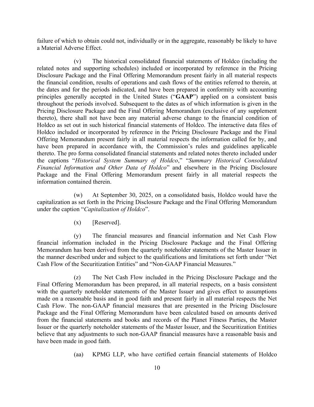 10 failure of which to obtain could not, individually or in the aggregate, reasonably be likely to have a Material Adverse Effect. (v) The historical consolidated financial statements of Holdco (including the related notes and supporting schedules) included or incorporated by reference in the Pricing Disclosure Package and the Final Offering Memorandum present fairly in all material respects the financial condition, results of operations and cash flows of the entities referred to therein, at the dates and for the periods indicated, and have been prepared in conformity with accounting principles generally accepted in the United States (“GAAP”) applied on a consistent basis throughout the periods involved. Subsequent to the dates as of which information is given in the Pricing Disclosure Package and the Final Offering Memorandum (exclusive of any supplement thereto), there shall not have been any material adverse change to the financial condition of Holdco as set out in such historical financial statements of Holdco. The interactive data files of Holdco included or incorporated by reference in the Pricing Disclosure Package and the Final Offering Memorandum present fairly in all material respects the information called for by, and have been prepared in accordance with, the Commission’s rules and guidelines applicable thereto. The pro forma consolidated financial statements and related notes thereto included under the captions “Historical System Summary of Holdco,” “Summary Historical Consolidated Financial Information and Other Data of Holdco” and elsewhere in the Pricing Disclosure Package and the Final Offering Memorandum present fairly in all material respects the information contained therein. (w) At September 30, 2025, on a consolidated basis, Holdco would have the capitalization as set forth in the Pricing Disclosure Package and the Final Offering Memorandum under the caption “Capitalization of Holdco”. (x) [Reserved]. (y) The financial measures and financial information and Net Cash Flow financial information included in the Pricing Disclosure Package and the Final Offering Memorandum has been derived from the quarterly noteholder statements of the Master Issuer in the manner described under and subject to the qualifications and limitations set forth under “Net Cash Flow of the Securitization Entities” and “Non-GAAP Financial Measures.” (z) The Net Cash Flow included in the Pricing Disclosure Package and the Final Offering Memorandum has been prepared, in all material respects, on a basis consistent with the quarterly noteholder statements of the Master Issuer and gives effect to assumptions made on a reasonable basis and in good faith and present fairly in all material respects the Net Cash Flow. The non-GAAP financial measures that are presented in the Pricing Disclosure Package and the Final Offering Memorandum have been calculated based on amounts derived from the financial statements and books and records of the Planet Fitness Parties, the Master Issuer or the quarterly noteholder statements of the Master Issuer, and the Securitization Entities believe that any adjustments to such non-GAAP financial measures have a reasonable basis and have been made in good faith. (aa) KPMG LLP, who have certified certain financial statements of Holdco