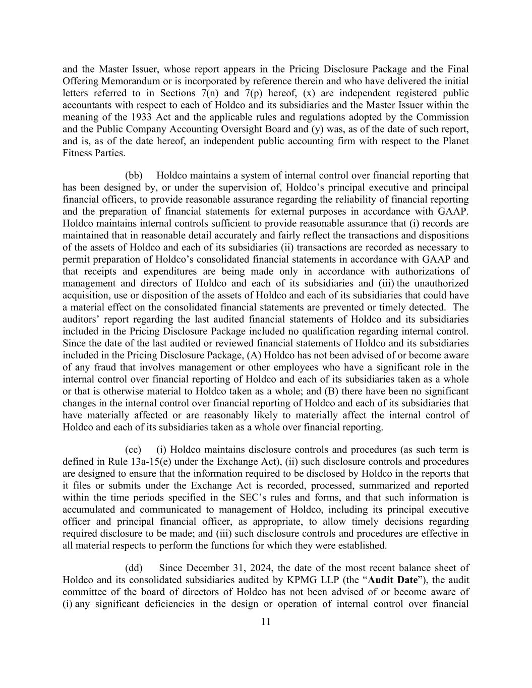 11 and the Master Issuer, whose report appears in the Pricing Disclosure Package and the Final Offering Memorandum or is incorporated by reference therein and who have delivered the initial letters referred to in Sections 7(n) and 7(p) hereof, (x) are independent registered public accountants with respect to each of Holdco and its subsidiaries and the Master Issuer within the meaning of the 1933 Act and the applicable rules and regulations adopted by the Commission and the Public Company Accounting Oversight Board and (y) was, as of the date of such report, and is, as of the date hereof, an independent public accounting firm with respect to the Planet Fitness Parties. (bb) Holdco maintains a system of internal control over financial reporting that has been designed by, or under the supervision of, Holdco’s principal executive and principal financial officers, to provide reasonable assurance regarding the reliability of financial reporting and the preparation of financial statements for external purposes in accordance with GAAP. Holdco maintains internal controls sufficient to provide reasonable assurance that (i) records are maintained that in reasonable detail accurately and fairly reflect the transactions and dispositions of the assets of Holdco and each of its subsidiaries (ii) transactions are recorded as necessary to permit preparation of Holdco’s consolidated financial statements in accordance with GAAP and that receipts and expenditures are being made only in accordance with authorizations of management and directors of Holdco and each of its subsidiaries and (iii) the unauthorized acquisition, use or disposition of the assets of Holdco and each of its subsidiaries that could have a material effect on the consolidated financial statements are prevented or timely detected. The auditors’ report regarding the last audited financial statements of Holdco and its subsidiaries included in the Pricing Disclosure Package included no qualification regarding internal control. Since the date of the last audited or reviewed financial statements of Holdco and its subsidiaries included in the Pricing Disclosure Package, (A) Holdco has not been advised of or become aware of any fraud that involves management or other employees who have a significant role in the internal control over financial reporting of Holdco and each of its subsidiaries taken as a whole or that is otherwise material to Holdco taken as a whole; and (B) there have been no significant changes in the internal control over financial reporting of Holdco and each of its subsidiaries that have materially affected or are reasonably likely to materially affect the internal control of Holdco and each of its subsidiaries taken as a whole over financial reporting. (cc) (i) Holdco maintains disclosure controls and procedures (as such term is defined in Rule 13a-15(e) under the Exchange Act), (ii) such disclosure controls and procedures are designed to ensure that the information required to be disclosed by Holdco in the reports that it files or submits under the Exchange Act is recorded, processed, summarized and reported within the time periods specified in the SEC’s rules and forms, and that such information is accumulated and communicated to management of Holdco, including its principal executive officer and principal financial officer, as appropriate, to allow timely decisions regarding required disclosure to be made; and (iii) such disclosure controls and procedures are effective in all material respects to perform the functions for which they were established. (dd) Since December 31, 2024, the date of the most recent balance sheet of Holdco and its consolidated subsidiaries audited by KPMG LLP (the “Audit Date”), the audit committee of the board of directors of Holdco has not been advised of or become aware of (i) any significant deficiencies in the design or operation of internal control over financial
