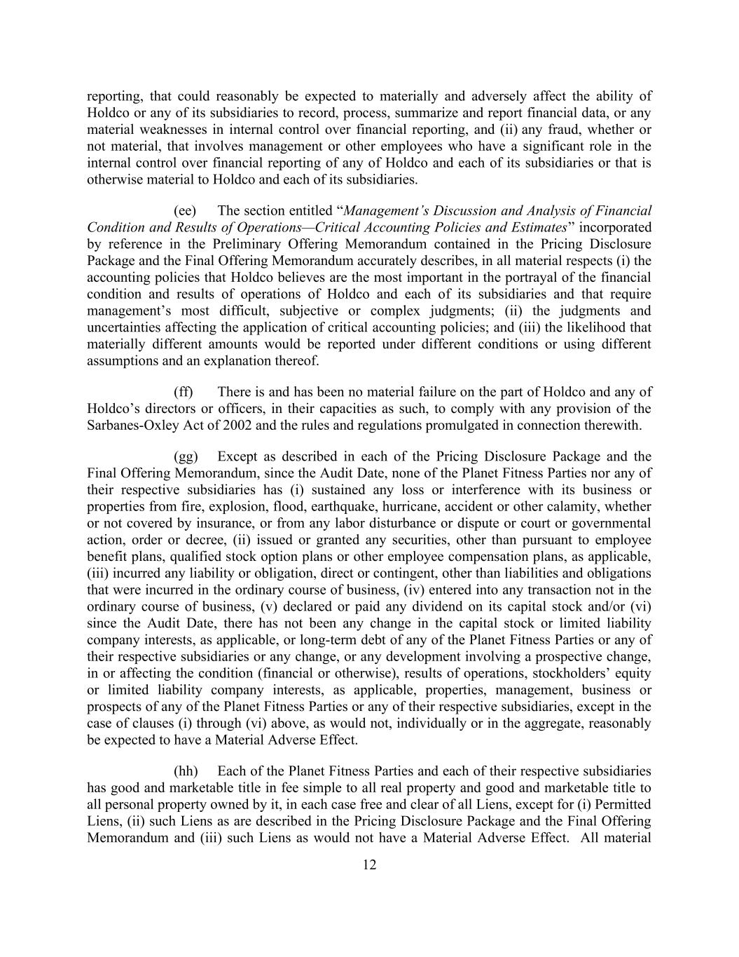 12 reporting, that could reasonably be expected to materially and adversely affect the ability of Holdco or any of its subsidiaries to record, process, summarize and report financial data, or any material weaknesses in internal control over financial reporting, and (ii) any fraud, whether or not material, that involves management or other employees who have a significant role in the internal control over financial reporting of any of Holdco and each of its subsidiaries or that is otherwise material to Holdco and each of its subsidiaries. (ee) The section entitled “Management’s Discussion and Analysis of Financial Condition and Results of Operations—Critical Accounting Policies and Estimates” incorporated by reference in the Preliminary Offering Memorandum contained in the Pricing Disclosure Package and the Final Offering Memorandum accurately describes, in all material respects (i) the accounting policies that Holdco believes are the most important in the portrayal of the financial condition and results of operations of Holdco and each of its subsidiaries and that require management’s most difficult, subjective or complex judgments; (ii) the judgments and uncertainties affecting the application of critical accounting policies; and (iii) the likelihood that materially different amounts would be reported under different conditions or using different assumptions and an explanation thereof. (ff) There is and has been no material failure on the part of Holdco and any of Holdco’s directors or officers, in their capacities as such, to comply with any provision of the Sarbanes-Oxley Act of 2002 and the rules and regulations promulgated in connection therewith. (gg) Except as described in each of the Pricing Disclosure Package and the Final Offering Memorandum, since the Audit Date, none of the Planet Fitness Parties nor any of their respective subsidiaries has (i) sustained any loss or interference with its business or properties from fire, explosion, flood, earthquake, hurricane, accident or other calamity, whether or not covered by insurance, or from any labor disturbance or dispute or court or governmental action, order or decree, (ii) issued or granted any securities, other than pursuant to employee benefit plans, qualified stock option plans or other employee compensation plans, as applicable, (iii) incurred any liability or obligation, direct or contingent, other than liabilities and obligations that were incurred in the ordinary course of business, (iv) entered into any transaction not in the ordinary course of business, (v) declared or paid any dividend on its capital stock and/or (vi) since the Audit Date, there has not been any change in the capital stock or limited liability company interests, as applicable, or long-term debt of any of the Planet Fitness Parties or any of their respective subsidiaries or any change, or any development involving a prospective change, in or affecting the condition (financial or otherwise), results of operations, stockholders’ equity or limited liability company interests, as applicable, properties, management, business or prospects of any of the Planet Fitness Parties or any of their respective subsidiaries, except in the case of clauses (i) through (vi) above, as would not, individually or in the aggregate, reasonably be expected to have a Material Adverse Effect. (hh) Each of the Planet Fitness Parties and each of their respective subsidiaries has good and marketable title in fee simple to all real property and good and marketable title to all personal property owned by it, in each case free and clear of all Liens, except for (i) Permitted Liens, (ii) such Liens as are described in the Pricing Disclosure Package and the Final Offering Memorandum and (iii) such Liens as would not have a Material Adverse Effect. All material