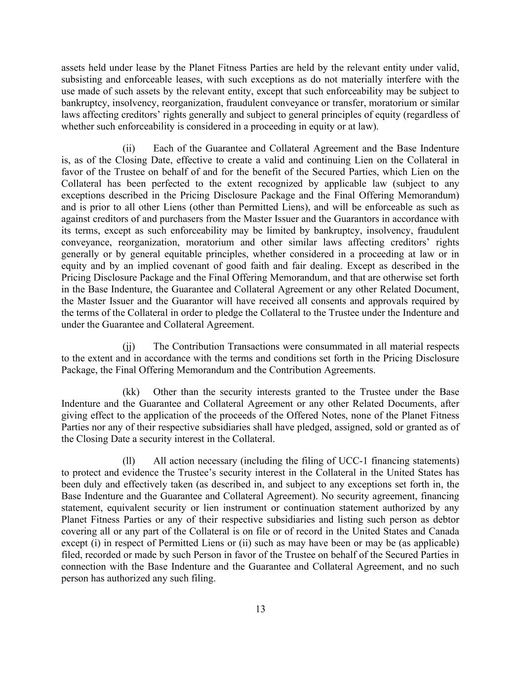 13 assets held under lease by the Planet Fitness Parties are held by the relevant entity under valid, subsisting and enforceable leases, with such exceptions as do not materially interfere with the use made of such assets by the relevant entity, except that such enforceability may be subject to bankruptcy, insolvency, reorganization, fraudulent conveyance or transfer, moratorium or similar laws affecting creditors’ rights generally and subject to general principles of equity (regardless of whether such enforceability is considered in a proceeding in equity or at law). (ii) Each of the Guarantee and Collateral Agreement and the Base Indenture is, as of the Closing Date, effective to create a valid and continuing Lien on the Collateral in favor of the Trustee on behalf of and for the benefit of the Secured Parties, which Lien on the Collateral has been perfected to the extent recognized by applicable law (subject to any exceptions described in the Pricing Disclosure Package and the Final Offering Memorandum) and is prior to all other Liens (other than Permitted Liens), and will be enforceable as such as against creditors of and purchasers from the Master Issuer and the Guarantors in accordance with its terms, except as such enforceability may be limited by bankruptcy, insolvency, fraudulent conveyance, reorganization, moratorium and other similar laws affecting creditors’ rights generally or by general equitable principles, whether considered in a proceeding at law or in equity and by an implied covenant of good faith and fair dealing. Except as described in the Pricing Disclosure Package and the Final Offering Memorandum, and that are otherwise set forth in the Base Indenture, the Guarantee and Collateral Agreement or any other Related Document, the Master Issuer and the Guarantor will have received all consents and approvals required by the terms of the Collateral in order to pledge the Collateral to the Trustee under the Indenture and under the Guarantee and Collateral Agreement. (jj) The Contribution Transactions were consummated in all material respects to the extent and in accordance with the terms and conditions set forth in the Pricing Disclosure Package, the Final Offering Memorandum and the Contribution Agreements. (kk) Other than the security interests granted to the Trustee under the Base Indenture and the Guarantee and Collateral Agreement or any other Related Documents, after giving effect to the application of the proceeds of the Offered Notes, none of the Planet Fitness Parties nor any of their respective subsidiaries shall have pledged, assigned, sold or granted as of the Closing Date a security interest in the Collateral. (ll) All action necessary (including the filing of UCC-1 financing statements) to protect and evidence the Trustee’s security interest in the Collateral in the United States has been duly and effectively taken (as described in, and subject to any exceptions set forth in, the Base Indenture and the Guarantee and Collateral Agreement). No security agreement, financing statement, equivalent security or lien instrument or continuation statement authorized by any Planet Fitness Parties or any of their respective subsidiaries and listing such person as debtor covering all or any part of the Collateral is on file or of record in the United States and Canada except (i) in respect of Permitted Liens or (ii) such as may have been or may be (as applicable) filed, recorded or made by such Person in favor of the Trustee on behalf of the Secured Parties in connection with the Base Indenture and the Guarantee and Collateral Agreement, and no such person has authorized any such filing.