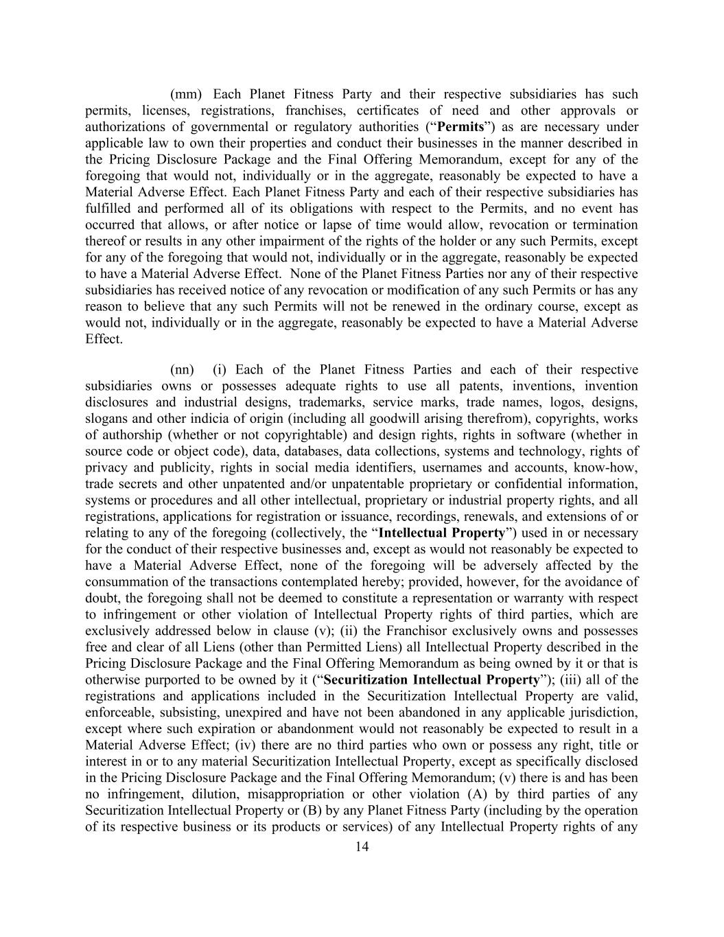 14 (mm) Each Planet Fitness Party and their respective subsidiaries has such permits, licenses, registrations, franchises, certificates of need and other approvals or authorizations of governmental or regulatory authorities (“Permits”) as are necessary under applicable law to own their properties and conduct their businesses in the manner described in the Pricing Disclosure Package and the Final Offering Memorandum, except for any of the foregoing that would not, individually or in the aggregate, reasonably be expected to have a Material Adverse Effect. Each Planet Fitness Party and each of their respective subsidiaries has fulfilled and performed all of its obligations with respect to the Permits, and no event has occurred that allows, or after notice or lapse of time would allow, revocation or termination thereof or results in any other impairment of the rights of the holder or any such Permits, except for any of the foregoing that would not, individually or in the aggregate, reasonably be expected to have a Material Adverse Effect. None of the Planet Fitness Parties nor any of their respective subsidiaries has received notice of any revocation or modification of any such Permits or has any reason to believe that any such Permits will not be renewed in the ordinary course, except as would not, individually or in the aggregate, reasonably be expected to have a Material Adverse Effect. (nn) (i) Each of the Planet Fitness Parties and each of their respective subsidiaries owns or possesses adequate rights to use all patents, inventions, invention disclosures and industrial designs, trademarks, service marks, trade names, logos, designs, slogans and other indicia of origin (including all goodwill arising therefrom), copyrights, works of authorship (whether or not copyrightable) and design rights, rights in software (whether in source code or object code), data, databases, data collections, systems and technology, rights of privacy and publicity, rights in social media identifiers, usernames and accounts, know-how, trade secrets and other unpatented and/or unpatentable proprietary or confidential information, systems or procedures and all other intellectual, proprietary or industrial property rights, and all registrations, applications for registration or issuance, recordings, renewals, and extensions of or relating to any of the foregoing (collectively, the “Intellectual Property”) used in or necessary for the conduct of their respective businesses and, except as would not reasonably be expected to have a Material Adverse Effect, none of the foregoing will be adversely affected by the consummation of the transactions contemplated hereby; provided, however, for the avoidance of doubt, the foregoing shall not be deemed to constitute a representation or warranty with respect to infringement or other violation of Intellectual Property rights of third parties, which are exclusively addressed below in clause (v); (ii) the Franchisor exclusively owns and possesses free and clear of all Liens (other than Permitted Liens) all Intellectual Property described in the Pricing Disclosure Package and the Final Offering Memorandum as being owned by it or that is otherwise purported to be owned by it (“Securitization Intellectual Property”); (iii) all of the registrations and applications included in the Securitization Intellectual Property are valid, enforceable, subsisting, unexpired and have not been abandoned in any applicable jurisdiction, except where such expiration or abandonment would not reasonably be expected to result in a Material Adverse Effect; (iv) there are no third parties who own or possess any right, title or interest in or to any material Securitization Intellectual Property, except as specifically disclosed in the Pricing Disclosure Package and the Final Offering Memorandum; (v) there is and has been no infringement, dilution, misappropriation or other violation (A) by third parties of any Securitization Intellectual Property or (B) by any Planet Fitness Party (including by the operation of its respective business or its products or services) of any Intellectual Property rights of any
