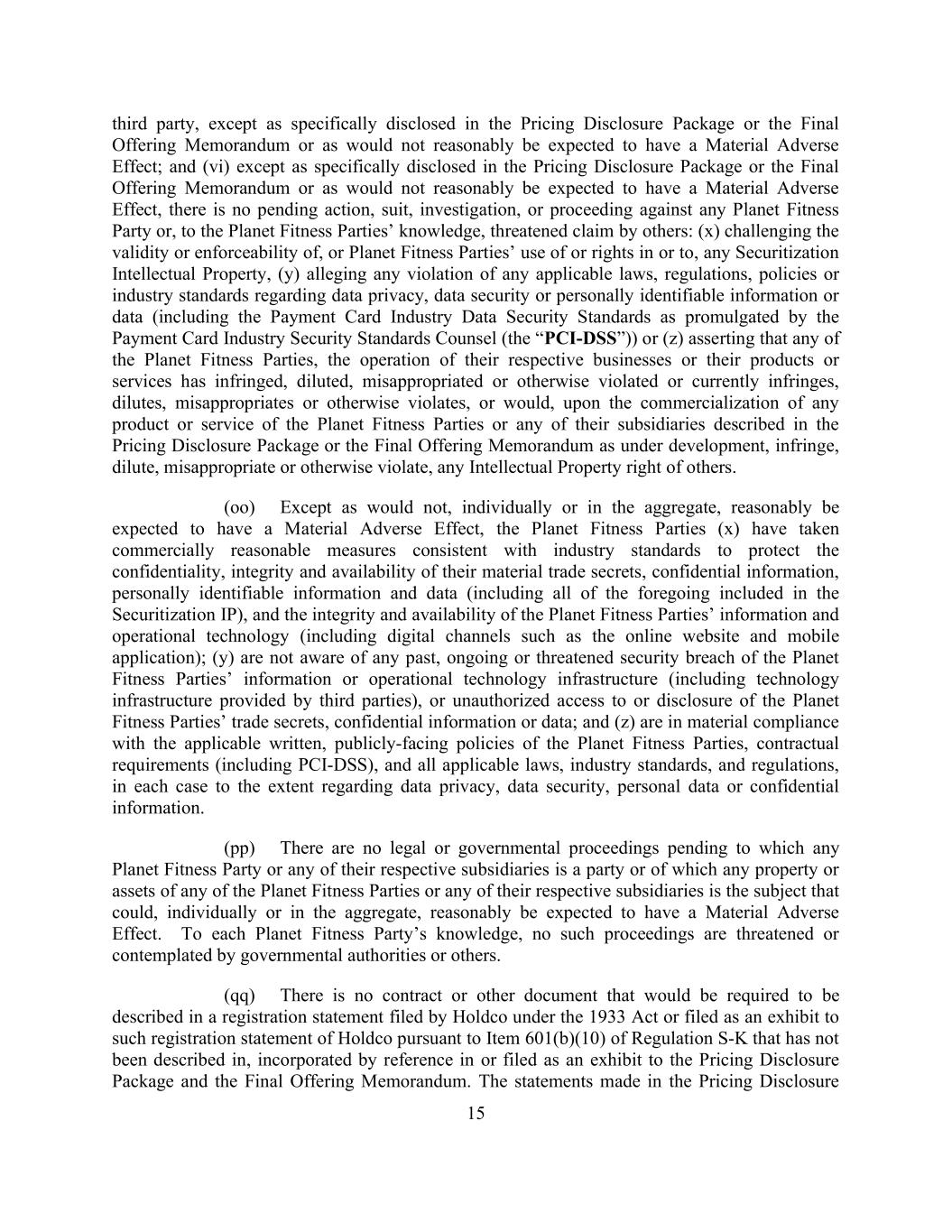 15 third party, except as specifically disclosed in the Pricing Disclosure Package or the Final Offering Memorandum or as would not reasonably be expected to have a Material Adverse Effect; and (vi) except as specifically disclosed in the Pricing Disclosure Package or the Final Offering Memorandum or as would not reasonably be expected to have a Material Adverse Effect, there is no pending action, suit, investigation, or proceeding against any Planet Fitness Party or, to the Planet Fitness Parties’ knowledge, threatened claim by others: (x) challenging the validity or enforceability of, or Planet Fitness Parties’ use of or rights in or to, any Securitization Intellectual Property, (y) alleging any violation of any applicable laws, regulations, policies or industry standards regarding data privacy, data security or personally identifiable information or data (including the Payment Card Industry Data Security Standards as promulgated by the Payment Card Industry Security Standards Counsel (the “PCI-DSS”)) or (z) asserting that any of the Planet Fitness Parties, the operation of their respective businesses or their products or services has infringed, diluted, misappropriated or otherwise violated or currently infringes, dilutes, misappropriates or otherwise violates, or would, upon the commercialization of any product or service of the Planet Fitness Parties or any of their subsidiaries described in the Pricing Disclosure Package or the Final Offering Memorandum as under development, infringe, dilute, misappropriate or otherwise violate, any Intellectual Property right of others. (oo) Except as would not, individually or in the aggregate, reasonably be expected to have a Material Adverse Effect, the Planet Fitness Parties (x) have taken commercially reasonable measures consistent with industry standards to protect the confidentiality, integrity and availability of their material trade secrets, confidential information, personally identifiable information and data (including all of the foregoing included in the Securitization IP), and the integrity and availability of the Planet Fitness Parties’ information and operational technology (including digital channels such as the online website and mobile application); (y) are not aware of any past, ongoing or threatened security breach of the Planet Fitness Parties’ information or operational technology infrastructure (including technology infrastructure provided by third parties), or unauthorized access to or disclosure of the Planet Fitness Parties’ trade secrets, confidential information or data; and (z) are in material compliance with the applicable written, publicly-facing policies of the Planet Fitness Parties, contractual requirements (including PCI-DSS), and all applicable laws, industry standards, and regulations, in each case to the extent regarding data privacy, data security, personal data or confidential information. (pp) There are no legal or governmental proceedings pending to which any Planet Fitness Party or any of their respective subsidiaries is a party or of which any property or assets of any of the Planet Fitness Parties or any of their respective subsidiaries is the subject that could, individually or in the aggregate, reasonably be expected to have a Material Adverse Effect. To each Planet Fitness Party’s knowledge, no such proceedings are threatened or contemplated by governmental authorities or others. (qq) There is no contract or other document that would be required to be described in a registration statement filed by Holdco under the 1933 Act or filed as an exhibit to such registration statement of Holdco pursuant to Item 601(b)(10) of Regulation S-K that has not been described in, incorporated by reference in or filed as an exhibit to the Pricing Disclosure Package and the Final Offering Memorandum. The statements made in the Pricing Disclosure
