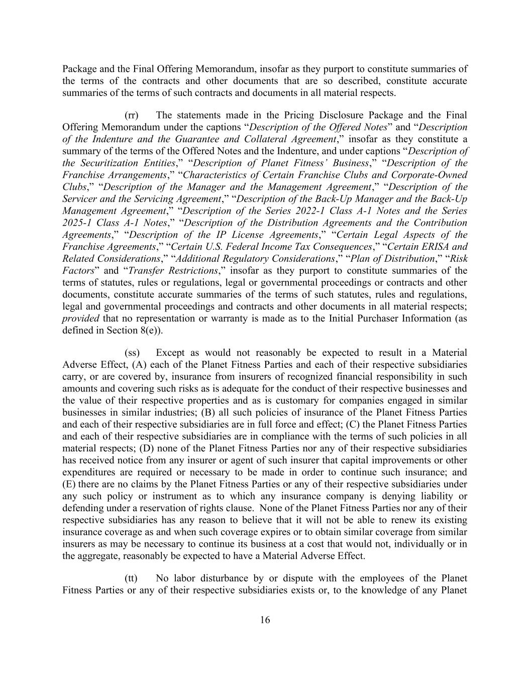 16 Package and the Final Offering Memorandum, insofar as they purport to constitute summaries of the terms of the contracts and other documents that are so described, constitute accurate summaries of the terms of such contracts and documents in all material respects. (rr) The statements made in the Pricing Disclosure Package and the Final Offering Memorandum under the captions “Description of the Offered Notes” and “Description of the Indenture and the Guarantee and Collateral Agreement,” insofar as they constitute a summary of the terms of the Offered Notes and the Indenture, and under captions “Description of the Securitization Entities,” “Description of Planet Fitness’ Business,” “Description of the Franchise Arrangements,” “Characteristics of Certain Franchise Clubs and Corporate-Owned Clubs,” “Description of the Manager and the Management Agreement,” “Description of the Servicer and the Servicing Agreement,” “Description of the Back-Up Manager and the Back-Up Management Agreement,” “Description of the Series 2022-1 Class A-1 Notes and the Series 2025-1 Class A-1 Notes,” “Description of the Distribution Agreements and the Contribution Agreements,” “Description of the IP License Agreements,” “Certain Legal Aspects of the Franchise Agreements,” “Certain U.S. Federal Income Tax Consequences,” “Certain ERISA and Related Considerations,” “Additional Regulatory Considerations,” “Plan of Distribution,” “Risk Factors” and “Transfer Restrictions,” insofar as they purport to constitute summaries of the terms of statutes, rules or regulations, legal or governmental proceedings or contracts and other documents, constitute accurate summaries of the terms of such statutes, rules and regulations, legal and governmental proceedings and contracts and other documents in all material respects; provided that no representation or warranty is made as to the Initial Purchaser Information (as defined in Section 8(e)). (ss) Except as would not reasonably be expected to result in a Material Adverse Effect, (A) each of the Planet Fitness Parties and each of their respective subsidiaries carry, or are covered by, insurance from insurers of recognized financial responsibility in such amounts and covering such risks as is adequate for the conduct of their respective businesses and the value of their respective properties and as is customary for companies engaged in similar businesses in similar industries; (B) all such policies of insurance of the Planet Fitness Parties and each of their respective subsidiaries are in full force and effect; (C) the Planet Fitness Parties and each of their respective subsidiaries are in compliance with the terms of such policies in all material respects; (D) none of the Planet Fitness Parties nor any of their respective subsidiaries has received notice from any insurer or agent of such insurer that capital improvements or other expenditures are required or necessary to be made in order to continue such insurance; and (E) there are no claims by the Planet Fitness Parties or any of their respective subsidiaries under any such policy or instrument as to which any insurance company is denying liability or defending under a reservation of rights clause. None of the Planet Fitness Parties nor any of their respective subsidiaries has any reason to believe that it will not be able to renew its existing insurance coverage as and when such coverage expires or to obtain similar coverage from similar insurers as may be necessary to continue its business at a cost that would not, individually or in the aggregate, reasonably be expected to have a Material Adverse Effect. (tt) No labor disturbance by or dispute with the employees of the Planet Fitness Parties or any of their respective subsidiaries exists or, to the knowledge of any Planet
