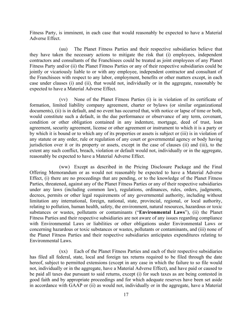 17 Fitness Party, is imminent, in each case that would reasonably be expected to have a Material Adverse Effect. (uu) The Planet Fitness Parties and their respective subsidiaries believe that they have taken the necessary actions to mitigate the risk that (i) employees, independent contractors and consultants of the Franchisees could be treated as joint employees of any Planet Fitness Party and/or (ii) the Planet Fitness Parties or any of their respective subsidiaries could be jointly or vicariously liable to or with any employee, independent contractor and consultant of the Franchisees with respect to any labor, employment, benefits or other matters except, in each case under clauses (i) and (ii), that would not, individually or in the aggregate, reasonably be expected to have a Material Adverse Effect. (vv) None of the Planet Fitness Parties (i) is in violation of its certificate of formation, limited liability company agreement, charter or bylaws (or similar organizational documents), (ii) is in default, and no event has occurred that, with notice or lapse of time or both, would constitute such a default, in the due performance or observance of any term, covenant, condition or other obligation contained in any indenture, mortgage, deed of trust, loan agreement, security agreement, license or other agreement or instrument to which it is a party or by which it is bound or to which any of its properties or assets is subject or (iii) is in violation of any statute or any order, rule or regulation of any court or governmental agency or body having jurisdiction over it or its property or assets, except in the case of clauses (ii) and (iii), to the extent any such conflict, breach, violation or default would not, individually or in the aggregate, reasonably be expected to have a Material Adverse Effect. (ww) Except as described in the Pricing Disclosure Package and the Final Offering Memorandum or as would not reasonably be expected to have a Material Adverse Effect, (i) there are no proceedings that are pending, or to the knowledge of the Planet Fitness Parties, threatened, against any of the Planet Fitness Parties or any of their respective subsidiaries under any laws (including common law), regulations, ordinances, rules, orders, judgments, decrees, permits or other legal requirements of any governmental authority, including without limitation any international, foreign, national, state, provincial, regional, or local authority, relating to pollution, human health, safety, the environment, natural resources, hazardous or toxic substances or wastes, pollutants or contaminants (“Environmental Laws”), (ii) the Planet Fitness Parties and their respective subsidiaries are not aware of any issues regarding compliance with Environmental Laws or liabilities or other obligations under Environmental Laws or concerning hazardous or toxic substances or wastes, pollutants or contaminants, and (iii) none of the Planet Fitness Parties and their respective subsidiaries anticipates expenditures relating to Environmental Laws. (xx) Each of the Planet Fitness Parties and each of their respective subsidiaries has filed all federal, state, local and foreign tax returns required to be filed through the date hereof, subject to permitted extensions (except in any case in which the failure to so file would not, individually or in the aggregate, have a Material Adverse Effect), and have paid or caused to be paid all taxes due pursuant to said returns, except (i) for such taxes as are being contested in good faith and by appropriate proceedings and for which adequate reserves have been set aside in accordance with GAAP or (ii) as would not, individually or in the aggregate, have a Material