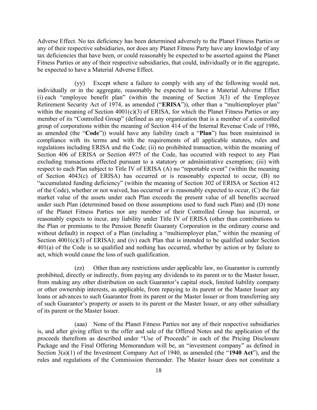 18 Adverse Effect. No tax deficiency has been determined adversely to the Planet Fitness Parties or any of their respective subsidiaries, nor does any Planet Fitness Party have any knowledge of any tax deficiencies that have been, or could reasonably be expected to be asserted against the Planet Fitness Parties or any of their respective subsidiaries, that could, individually or in the aggregate, be expected to have a Material Adverse Effect. (yy) Except where a failure to comply with any of the following would not, individually or in the aggregate, reasonably be expected to have a Material Adverse Effect (i) each “employee benefit plan” (within the meaning of Section 3(3) of the Employee Retirement Security Act of 1974, as amended (“ERISA”)), other than a “multiemployer plan” within the meaning of Section 4001(c)(3) of ERISA, for which the Planet Fitness Parties or any member of its “Controlled Group” (defined as any organization that is a member of a controlled group of corporations within the meaning of Section 414 of the Internal Revenue Code of 1986, as amended (the “Code”)) would have any liability (each a “Plan”) has been maintained in compliance with its terms and with the requirements of all applicable statutes, rules and regulations including ERISA and the Code; (ii) no prohibited transaction, within the meaning of Section 406 of ERISA or Section 4975 of the Code, has occurred with respect to any Plan excluding transactions effected pursuant to a statutory or administrative exemption; (iii) with respect to each Plan subject to Title IV of ERISA (A) no “reportable event” (within the meaning of Section 4043(c) of ERISA) has occurred or is reasonably expected to occur, (B) no “accumulated funding deficiency” (within the meaning of Section 302 of ERISA or Section 412 of the Code), whether or not waived, has occurred or is reasonably expected to occur, (C) the fair market value of the assets under each Plan exceeds the present value of all benefits accrued under such Plan (determined based on those assumptions used to fund such Plan) and (D) none of the Planet Fitness Parties nor any member of their Controlled Group has incurred, or reasonably expects to incur, any liability under Title IV of ERISA (other than contributions to the Plan or premiums to the Pension Benefit Guaranty Corporation in the ordinary course and without default) in respect of a Plan (including a “multiemployer plan,” within the meaning of Section 4001(c)(3) of ERISA); and (iv) each Plan that is intended to be qualified under Section 401(a) of the Code is so qualified and nothing has occurred, whether by action or by failure to act, which would cause the loss of such qualification. (zz) Other than any restrictions under applicable law, no Guarantor is currently prohibited, directly or indirectly, from paying any dividends to its parent or to the Master Issuer, from making any other distribution on such Guarantor’s capital stock, limited liability company or other ownership interests, as applicable, from repaying to its parent or the Master Issuer any loans or advances to such Guarantor from its parent or the Master Issuer or from transferring any of such Guarantor’s property or assets to its parent or the Master Issuer, or any other subsidiary of its parent or the Master Issuer. (aaa) None of the Planet Fitness Parties nor any of their respective subsidiaries is, and after giving effect to the offer and sale of the Offered Notes and the application of the proceeds therefrom as described under “Use of Proceeds” in each of the Pricing Disclosure Package and the Final Offering Memorandum will be, an “investment company” as defined in Section 3(a)(1) of the Investment Company Act of 1940, as amended (the “1940 Act”), and the rules and regulations of the Commission thereunder. The Master Issuer does not constitute a