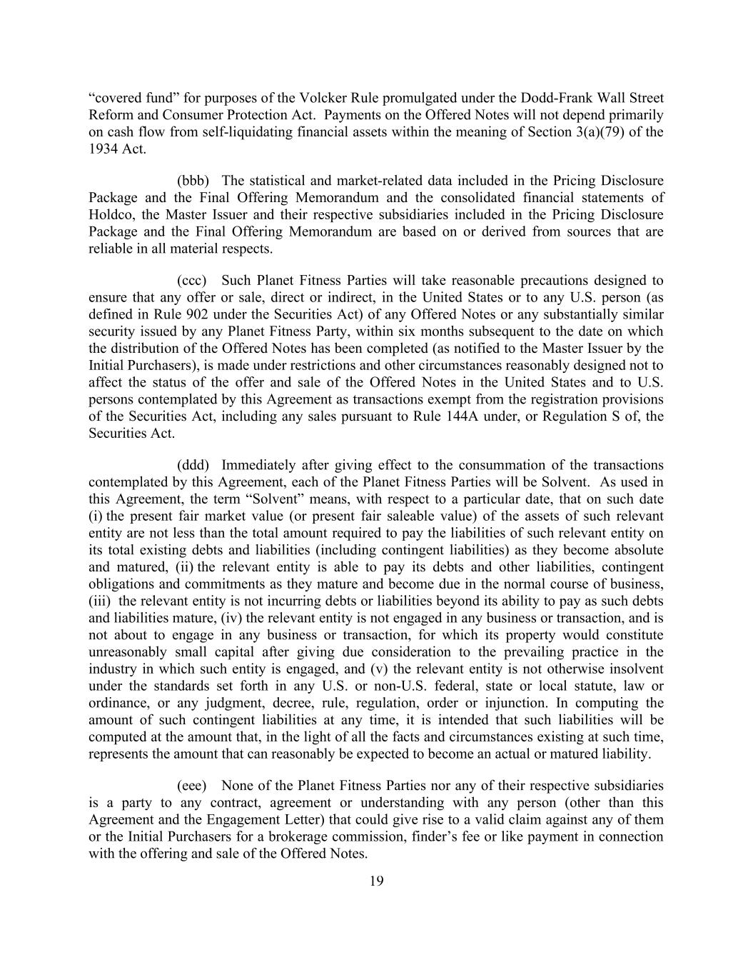 19 “covered fund” for purposes of the Volcker Rule promulgated under the Dodd-Frank Wall Street Reform and Consumer Protection Act. Payments on the Offered Notes will not depend primarily on cash flow from self-liquidating financial assets within the meaning of Section 3(a)(79) of the 1934 Act. (bbb) The statistical and market-related data included in the Pricing Disclosure Package and the Final Offering Memorandum and the consolidated financial statements of Holdco, the Master Issuer and their respective subsidiaries included in the Pricing Disclosure Package and the Final Offering Memorandum are based on or derived from sources that are reliable in all material respects. (ccc) Such Planet Fitness Parties will take reasonable precautions designed to ensure that any offer or sale, direct or indirect, in the United States or to any U.S. person (as defined in Rule 902 under the Securities Act) of any Offered Notes or any substantially similar security issued by any Planet Fitness Party, within six months subsequent to the date on which the distribution of the Offered Notes has been completed (as notified to the Master Issuer by the Initial Purchasers), is made under restrictions and other circumstances reasonably designed not to affect the status of the offer and sale of the Offered Notes in the United States and to U.S. persons contemplated by this Agreement as transactions exempt from the registration provisions of the Securities Act, including any sales pursuant to Rule 144A under, or Regulation S of, the Securities Act. (ddd) Immediately after giving effect to the consummation of the transactions contemplated by this Agreement, each of the Planet Fitness Parties will be Solvent. As used in this Agreement, the term “Solvent” means, with respect to a particular date, that on such date (i) the present fair market value (or present fair saleable value) of the assets of such relevant entity are not less than the total amount required to pay the liabilities of such relevant entity on its total existing debts and liabilities (including contingent liabilities) as they become absolute and matured, (ii) the relevant entity is able to pay its debts and other liabilities, contingent obligations and commitments as they mature and become due in the normal course of business, (iii) the relevant entity is not incurring debts or liabilities beyond its ability to pay as such debts and liabilities mature, (iv) the relevant entity is not engaged in any business or transaction, and is not about to engage in any business or transaction, for which its property would constitute unreasonably small capital after giving due consideration to the prevailing practice in the industry in which such entity is engaged, and (v) the relevant entity is not otherwise insolvent under the standards set forth in any U.S. or non-U.S. federal, state or local statute, law or ordinance, or any judgment, decree, rule, regulation, order or injunction. In computing the amount of such contingent liabilities at any time, it is intended that such liabilities will be computed at the amount that, in the light of all the facts and circumstances existing at such time, represents the amount that can reasonably be expected to become an actual or matured liability. (eee) None of the Planet Fitness Parties nor any of their respective subsidiaries is a party to any contract, agreement or understanding with any person (other than this Agreement and the Engagement Letter) that could give rise to a valid claim against any of them or the Initial Purchasers for a brokerage commission, finder’s fee or like payment in connection with the offering and sale of the Offered Notes.