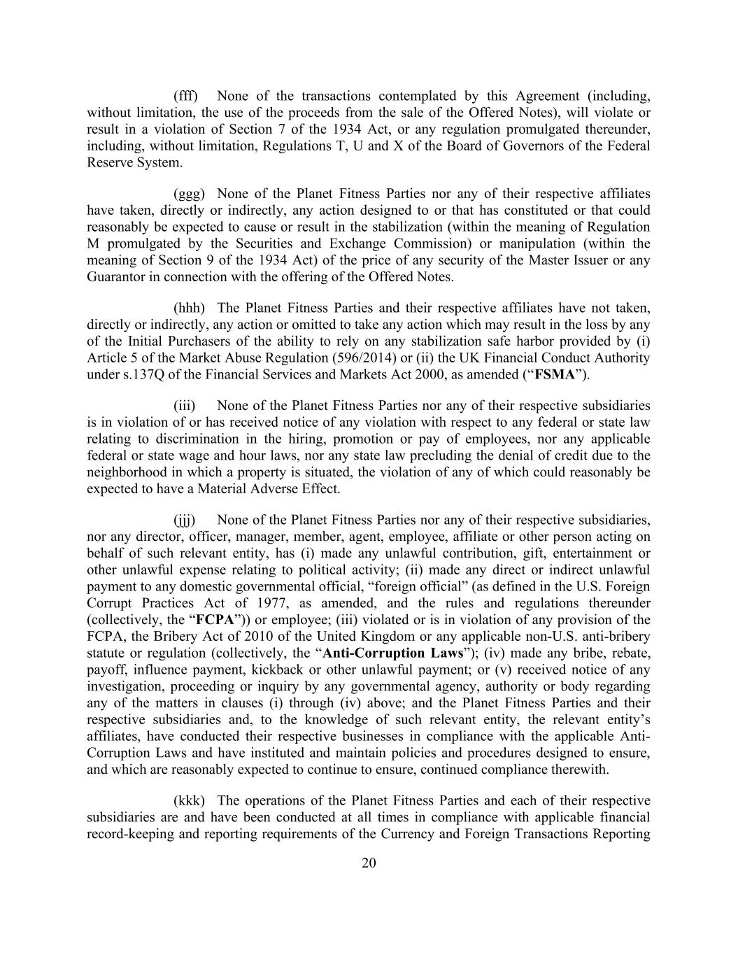 20 (fff) None of the transactions contemplated by this Agreement (including, without limitation, the use of the proceeds from the sale of the Offered Notes), will violate or result in a violation of Section 7 of the 1934 Act, or any regulation promulgated thereunder, including, without limitation, Regulations T, U and X of the Board of Governors of the Federal Reserve System. (ggg) None of the Planet Fitness Parties nor any of their respective affiliates have taken, directly or indirectly, any action designed to or that has constituted or that could reasonably be expected to cause or result in the stabilization (within the meaning of Regulation M promulgated by the Securities and Exchange Commission) or manipulation (within the meaning of Section 9 of the 1934 Act) of the price of any security of the Master Issuer or any Guarantor in connection with the offering of the Offered Notes. (hhh) The Planet Fitness Parties and their respective affiliates have not taken, directly or indirectly, any action or omitted to take any action which may result in the loss by any of the Initial Purchasers of the ability to rely on any stabilization safe harbor provided by (i) Article 5 of the Market Abuse Regulation (596/2014) or (ii) the UK Financial Conduct Authority under s.137Q of the Financial Services and Markets Act 2000, as amended (“FSMA”). (iii) None of the Planet Fitness Parties nor any of their respective subsidiaries is in violation of or has received notice of any violation with respect to any federal or state law relating to discrimination in the hiring, promotion or pay of employees, nor any applicable federal or state wage and hour laws, nor any state law precluding the denial of credit due to the neighborhood in which a property is situated, the violation of any of which could reasonably be expected to have a Material Adverse Effect. (jjj) None of the Planet Fitness Parties nor any of their respective subsidiaries, nor any director, officer, manager, member, agent, employee, affiliate or other person acting on behalf of such relevant entity, has (i) made any unlawful contribution, gift, entertainment or other unlawful expense relating to political activity; (ii) made any direct or indirect unlawful payment to any domestic governmental official, “foreign official” (as defined in the U.S. Foreign Corrupt Practices Act of 1977, as amended, and the rules and regulations thereunder (collectively, the “FCPA”)) or employee; (iii) violated or is in violation of any provision of the FCPA, the Bribery Act of 2010 of the United Kingdom or any applicable non-U.S. anti-bribery statute or regulation (collectively, the “Anti-Corruption Laws”); (iv) made any bribe, rebate, payoff, influence payment, kickback or other unlawful payment; or (v) received notice of any investigation, proceeding or inquiry by any governmental agency, authority or body regarding any of the matters in clauses (i) through (iv) above; and the Planet Fitness Parties and their respective subsidiaries and, to the knowledge of such relevant entity, the relevant entity’s affiliates, have conducted their respective businesses in compliance with the applicable Anti- Corruption Laws and have instituted and maintain policies and procedures designed to ensure, and which are reasonably expected to continue to ensure, continued compliance therewith. (kkk) The operations of the Planet Fitness Parties and each of their respective subsidiaries are and have been conducted at all times in compliance with applicable financial record-keeping and reporting requirements of the Currency and Foreign Transactions Reporting