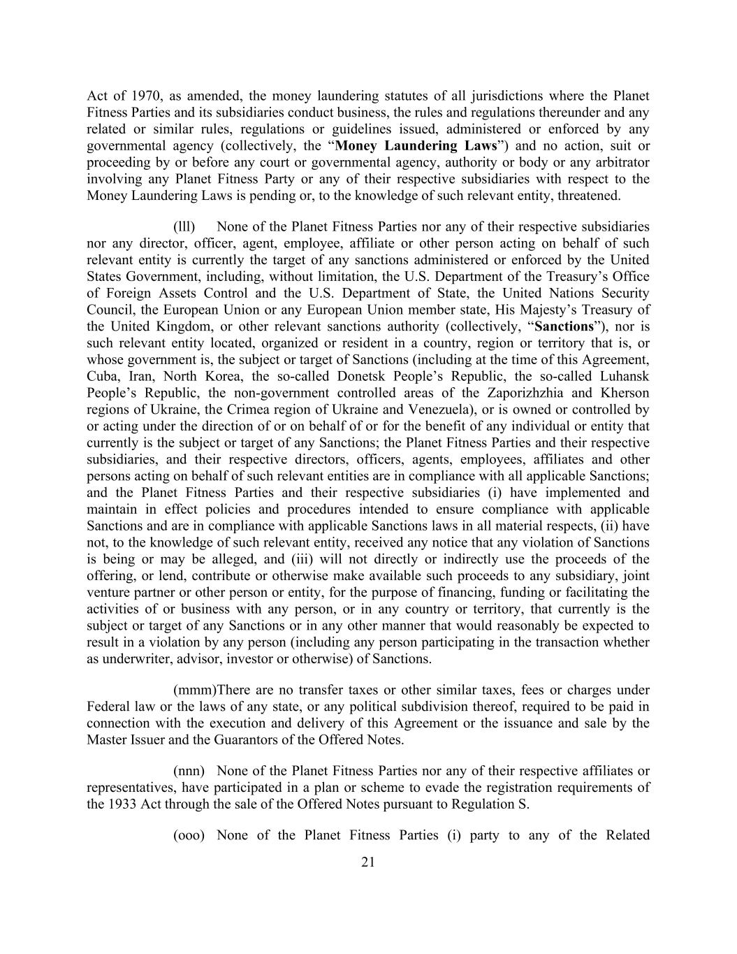 21 Act of 1970, as amended, the money laundering statutes of all jurisdictions where the Planet Fitness Parties and its subsidiaries conduct business, the rules and regulations thereunder and any related or similar rules, regulations or guidelines issued, administered or enforced by any governmental agency (collectively, the “Money Laundering Laws”) and no action, suit or proceeding by or before any court or governmental agency, authority or body or any arbitrator involving any Planet Fitness Party or any of their respective subsidiaries with respect to the Money Laundering Laws is pending or, to the knowledge of such relevant entity, threatened. (lll) None of the Planet Fitness Parties nor any of their respective subsidiaries nor any director, officer, agent, employee, affiliate or other person acting on behalf of such relevant entity is currently the target of any sanctions administered or enforced by the United States Government, including, without limitation, the U.S. Department of the Treasury’s Office of Foreign Assets Control and the U.S. Department of State, the United Nations Security Council, the European Union or any European Union member state, His Majesty’s Treasury of the United Kingdom, or other relevant sanctions authority (collectively, “Sanctions”), nor is such relevant entity located, organized or resident in a country, region or territory that is, or whose government is, the subject or target of Sanctions (including at the time of this Agreement, Cuba, Iran, North Korea, the so-called Donetsk People’s Republic, the so-called Luhansk People’s Republic, the non-government controlled areas of the Zaporizhzhia and Kherson regions of Ukraine, the Crimea region of Ukraine and Venezuela), or is owned or controlled by or acting under the direction of or on behalf of or for the benefit of any individual or entity that currently is the subject or target of any Sanctions; the Planet Fitness Parties and their respective subsidiaries, and their respective directors, officers, agents, employees, affiliates and other persons acting on behalf of such relevant entities are in compliance with all applicable Sanctions; and the Planet Fitness Parties and their respective subsidiaries (i) have implemented and maintain in effect policies and procedures intended to ensure compliance with applicable Sanctions and are in compliance with applicable Sanctions laws in all material respects, (ii) have not, to the knowledge of such relevant entity, received any notice that any violation of Sanctions is being or may be alleged, and (iii) will not directly or indirectly use the proceeds of the offering, or lend, contribute or otherwise make available such proceeds to any subsidiary, joint venture partner or other person or entity, for the purpose of financing, funding or facilitating the activities of or business with any person, or in any country or territory, that currently is the subject or target of any Sanctions or in any other manner that would reasonably be expected to result in a violation by any person (including any person participating in the transaction whether as underwriter, advisor, investor or otherwise) of Sanctions. (mmm)There are no transfer taxes or other similar taxes, fees or charges under Federal law or the laws of any state, or any political subdivision thereof, required to be paid in connection with the execution and delivery of this Agreement or the issuance and sale by the Master Issuer and the Guarantors of the Offered Notes. (nnn) None of the Planet Fitness Parties nor any of their respective affiliates or representatives, have participated in a plan or scheme to evade the registration requirements of the 1933 Act through the sale of the Offered Notes pursuant to Regulation S. (ooo) None of the Planet Fitness Parties (i) party to any of the Related