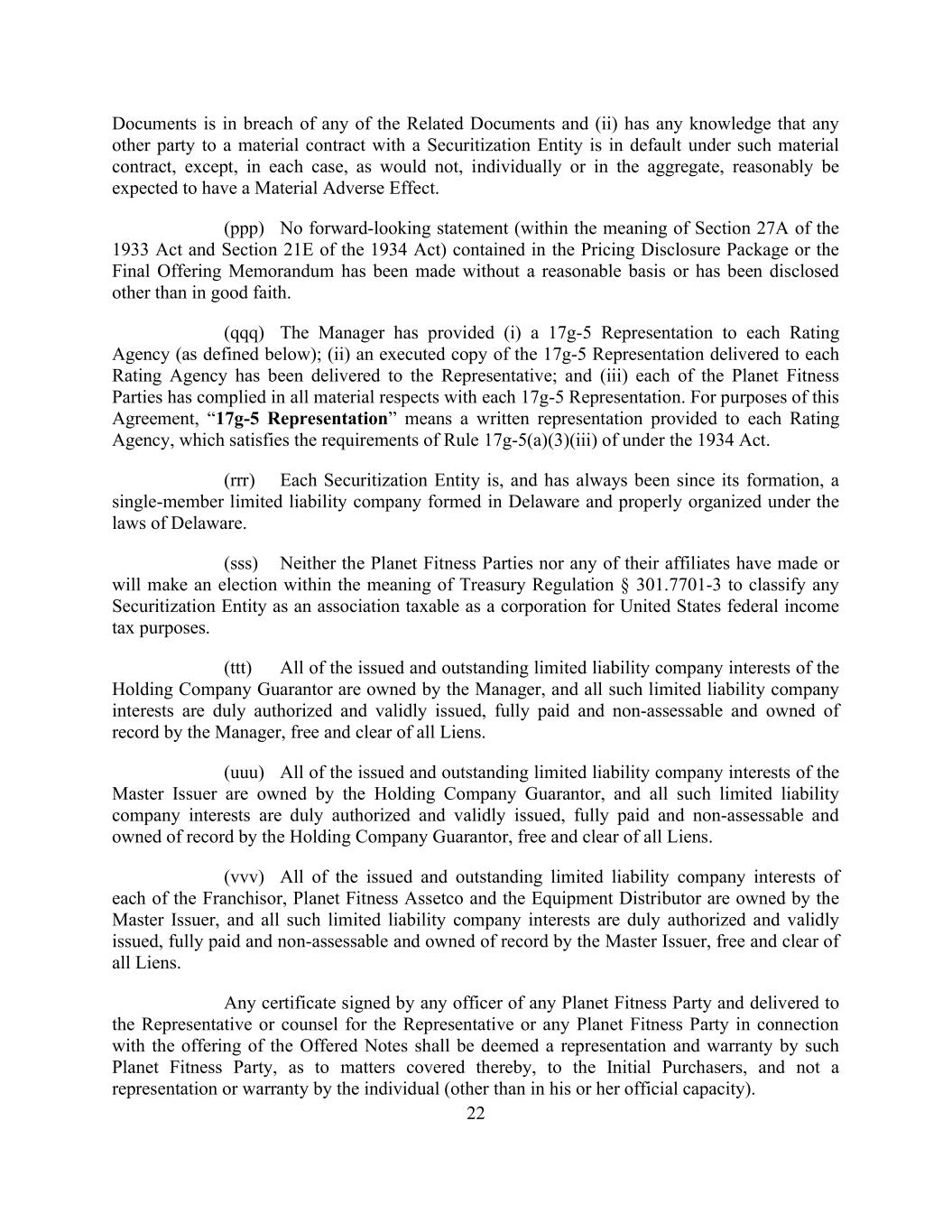 22 Documents is in breach of any of the Related Documents and (ii) has any knowledge that any other party to a material contract with a Securitization Entity is in default under such material contract, except, in each case, as would not, individually or in the aggregate, reasonably be expected to have a Material Adverse Effect. (ppp) No forward-looking statement (within the meaning of Section 27A of the 1933 Act and Section 21E of the 1934 Act) contained in the Pricing Disclosure Package or the Final Offering Memorandum has been made without a reasonable basis or has been disclosed other than in good faith. (qqq) The Manager has provided (i) a 17g-5 Representation to each Rating Agency (as defined below); (ii) an executed copy of the 17g-5 Representation delivered to each Rating Agency has been delivered to the Representative; and (iii) each of the Planet Fitness Parties has complied in all material respects with each 17g-5 Representation. For purposes of this Agreement, “17g-5 Representation” means a written representation provided to each Rating Agency, which satisfies the requirements of Rule 17g-5(a)(3)(iii) of under the 1934 Act. (rrr) Each Securitization Entity is, and has always been since its formation, a single-member limited liability company formed in Delaware and properly organized under the laws of Delaware. (sss) Neither the Planet Fitness Parties nor any of their affiliates have made or will make an election within the meaning of Treasury Regulation § 301.7701-3 to classify any Securitization Entity as an association taxable as a corporation for United States federal income tax purposes. (ttt) All of the issued and outstanding limited liability company interests of the Holding Company Guarantor are owned by the Manager, and all such limited liability company interests are duly authorized and validly issued, fully paid and non-assessable and owned of record by the Manager, free and clear of all Liens. (uuu) All of the issued and outstanding limited liability company interests of the Master Issuer are owned by the Holding Company Guarantor, and all such limited liability company interests are duly authorized and validly issued, fully paid and non-assessable and owned of record by the Holding Company Guarantor, free and clear of all Liens. (vvv) All of the issued and outstanding limited liability company interests of each of the Franchisor, Planet Fitness Assetco and the Equipment Distributor are owned by the Master Issuer, and all such limited liability company interests are duly authorized and validly issued, fully paid and non-assessable and owned of record by the Master Issuer, free and clear of all Liens. Any certificate signed by any officer of any Planet Fitness Party and delivered to the Representative or counsel for the Representative or any Planet Fitness Party in connection with the offering of the Offered Notes shall be deemed a representation and warranty by such Planet Fitness Party, as to matters covered thereby, to the Initial Purchasers, and not a representation or warranty by the individual (other than in his or her official capacity).