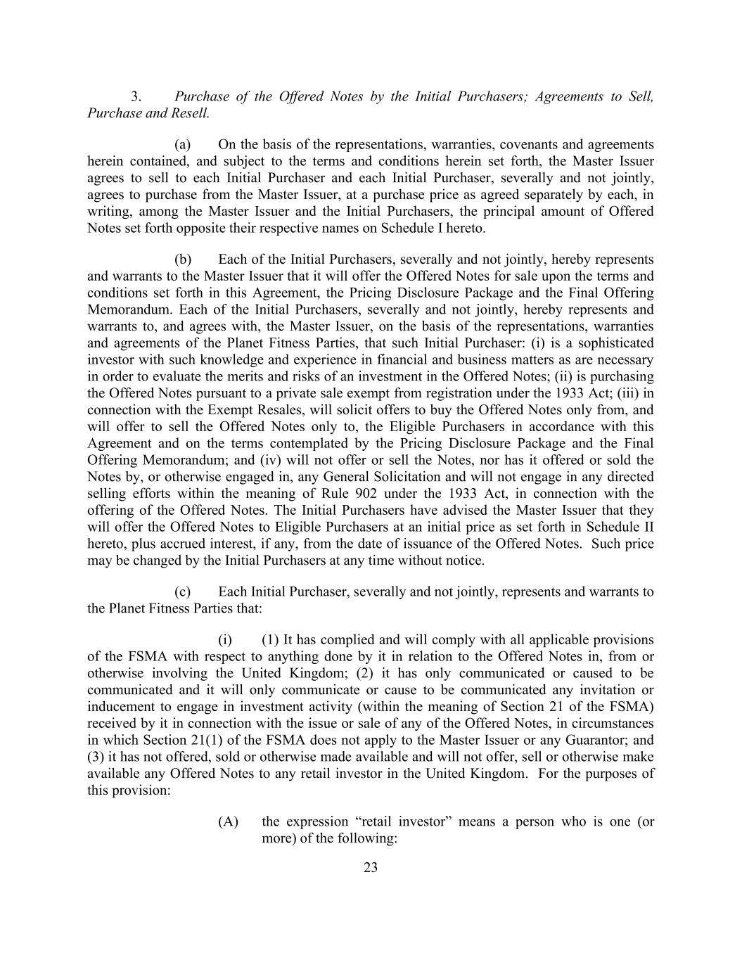 23 3. Purchase of the Offered Notes by the Initial Purchasers; Agreements to Sell, Purchase and Resell. (a) On the basis of the representations, warranties, covenants and agreements herein contained, and subject to the terms and conditions herein set forth, the Master Issuer agrees to sell to each Initial Purchaser and each Initial Purchaser, severally and not jointly, agrees to purchase from the Master Issuer, at a purchase price as agreed separately by each, in writing, among the Master Issuer and the Initial Purchasers, the principal amount of Offered Notes set forth opposite their respective names on Schedule I hereto. (b) Each of the Initial Purchasers, severally and not jointly, hereby represents and warrants to the Master Issuer that it will offer the Offered Notes for sale upon the terms and conditions set forth in this Agreement, the Pricing Disclosure Package and the Final Offering Memorandum. Each of the Initial Purchasers, severally and not jointly, hereby represents and warrants to, and agrees with, the Master Issuer, on the basis of the representations, warranties and agreements of the Planet Fitness Parties, that such Initial Purchaser: (i) is a sophisticated investor with such knowledge and experience in financial and business matters as are necessary in order to evaluate the merits and risks of an investment in the Offered Notes; (ii) is purchasing the Offered Notes pursuant to a private sale exempt from registration under the 1933 Act; (iii) in connection with the Exempt Resales, will solicit offers to buy the Offered Notes only from, and will offer to sell the Offered Notes only to, the Eligible Purchasers in accordance with this Agreement and on the terms contemplated by the Pricing Disclosure Package and the Final Offering Memorandum; and (iv) will not offer or sell the Notes, nor has it offered or sold the Notes by, or otherwise engaged in, any General Solicitation and will not engage in any directed selling efforts within the meaning of Rule 902 under the 1933 Act, in connection with the offering of the Offered Notes. The Initial Purchasers have advised the Master Issuer that they will offer the Offered Notes to Eligible Purchasers at an initial price as set forth in Schedule II hereto, plus accrued interest, if any, from the date of issuance of the Offered Notes. Such price may be changed by the Initial Purchasers at any time without notice. (c) Each Initial Purchaser, severally and not jointly, represents and warrants to the Planet Fitness Parties that: (i) (1) It has complied and will comply with all applicable provisions of the FSMA with respect to anything done by it in relation to the Offered Notes in, from or otherwise involving the United Kingdom; (2) it has only communicated or caused to be communicated and it will only communicate or cause to be communicated any invitation or inducement to engage in investment activity (within the meaning of Section 21 of the FSMA) received by it in connection with the issue or sale of any of the Offered Notes, in circumstances in which Section 21(1) of the FSMA does not apply to the Master Issuer or any Guarantor; and (3) it has not offered, sold or otherwise made available and will not offer, sell or otherwise make available any Offered Notes to any retail investor in the United Kingdom. For the purposes of this provision: (A) the expression “retail investor” means a person who is one (or more) of the following: