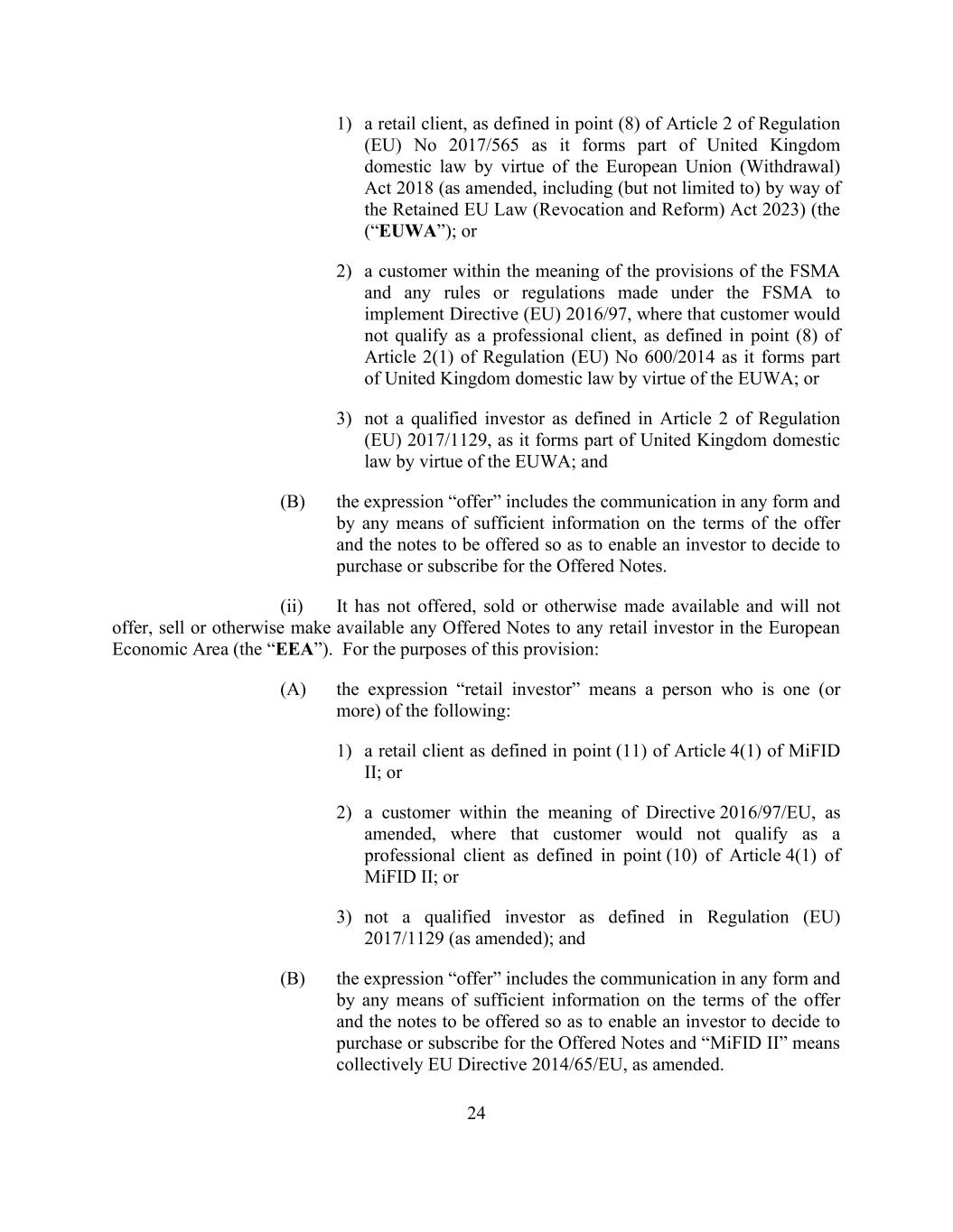 24 1) a retail client, as defined in point (8) of Article 2 of Regulation (EU) No 2017/565 as it forms part of United Kingdom domestic law by virtue of the European Union (Withdrawal) Act 2018 (as amended, including (but not limited to) by way of the Retained EU Law (Revocation and Reform) Act 2023) (the (“EUWA”); or 2) a customer within the meaning of the provisions of the FSMA and any rules or regulations made under the FSMA to implement Directive (EU) 2016/97, where that customer would not qualify as a professional client, as defined in point (8) of Article 2(1) of Regulation (EU) No 600/2014 as it forms part of United Kingdom domestic law by virtue of the EUWA; or 3) not a qualified investor as defined in Article 2 of Regulation (EU) 2017/1129, as it forms part of United Kingdom domestic law by virtue of the EUWA; and (B) the expression “offer” includes the communication in any form and by any means of sufficient information on the terms of the offer and the notes to be offered so as to enable an investor to decide to purchase or subscribe for the Offered Notes. (ii) It has not offered, sold or otherwise made available and will not offer, sell or otherwise make available any Offered Notes to any retail investor in the European Economic Area (the “EEA”). For the purposes of this provision: (A) the expression “retail investor” means a person who is one (or more) of the following: 1) a retail client as defined in point (11) of Article 4(1) of MiFID II; or 2) a customer within the meaning of Directive 2016/97/EU, as amended, where that customer would not qualify as a professional client as defined in point (10) of Article 4(1) of MiFID II; or 3) not a qualified investor as defined in Regulation (EU) 2017/1129 (as amended); and (B) the expression “offer” includes the communication in any form and by any means of sufficient information on the terms of the offer and the notes to be offered so as to enable an investor to decide to purchase or subscribe for the Offered Notes and “MiFID II” means collectively EU Directive 2014/65/EU, as amended.