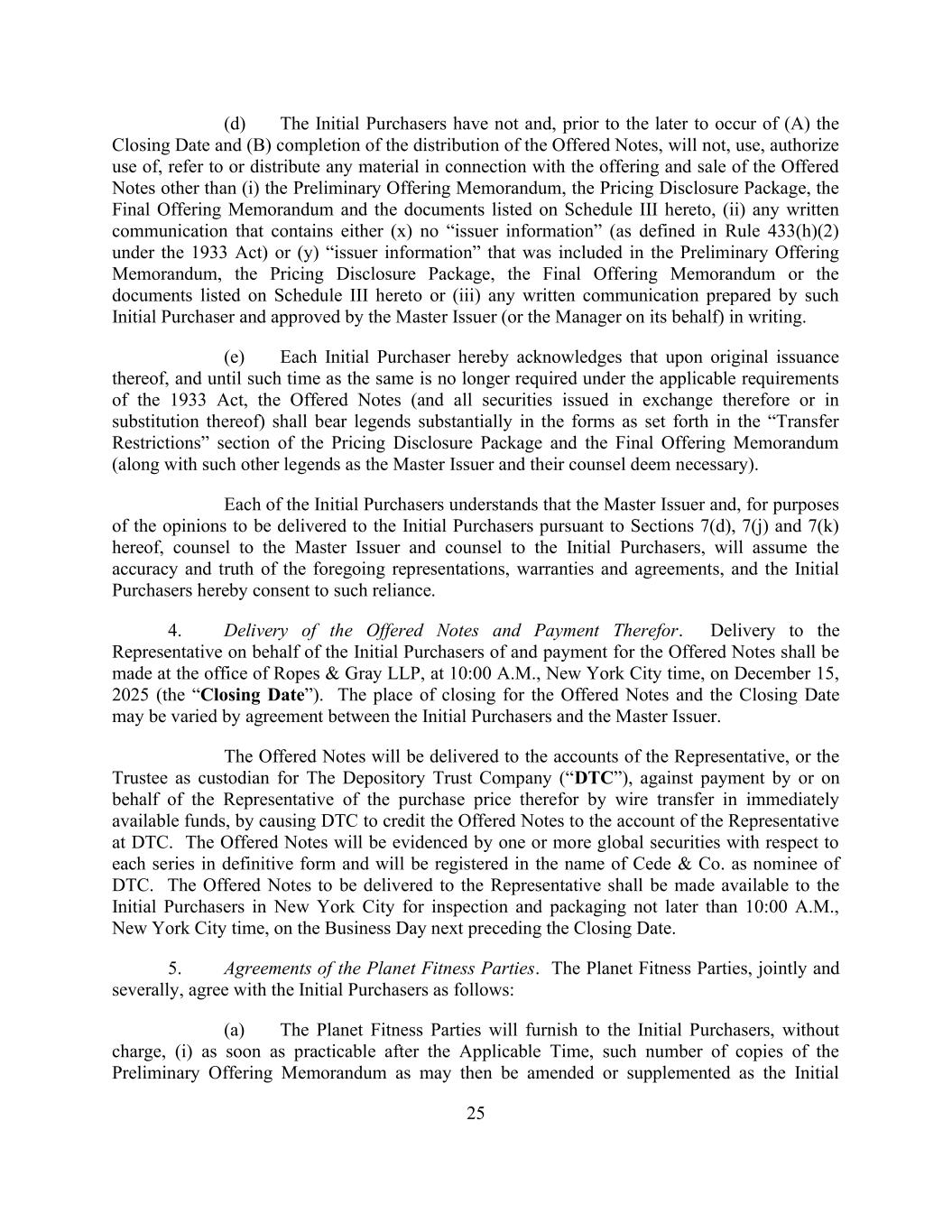 25 (d) The Initial Purchasers have not and, prior to the later to occur of (A) the Closing Date and (B) completion of the distribution of the Offered Notes, will not, use, authorize use of, refer to or distribute any material in connection with the offering and sale of the Offered Notes other than (i) the Preliminary Offering Memorandum, the Pricing Disclosure Package, the Final Offering Memorandum and the documents listed on Schedule III hereto, (ii) any written communication that contains either (x) no “issuer information” (as defined in Rule 433(h)(2) under the 1933 Act) or (y) “issuer information” that was included in the Preliminary Offering Memorandum, the Pricing Disclosure Package, the Final Offering Memorandum or the documents listed on Schedule III hereto or (iii) any written communication prepared by such Initial Purchaser and approved by the Master Issuer (or the Manager on its behalf) in writing. (e) Each Initial Purchaser hereby acknowledges that upon original issuance thereof, and until such time as the same is no longer required under the applicable requirements of the 1933 Act, the Offered Notes (and all securities issued in exchange therefore or in substitution thereof) shall bear legends substantially in the forms as set forth in the “Transfer Restrictions” section of the Pricing Disclosure Package and the Final Offering Memorandum (along with such other legends as the Master Issuer and their counsel deem necessary). Each of the Initial Purchasers understands that the Master Issuer and, for purposes of the opinions to be delivered to the Initial Purchasers pursuant to Sections 7(d), 7(j) and 7(k) hereof, counsel to the Master Issuer and counsel to the Initial Purchasers, will assume the accuracy and truth of the foregoing representations, warranties and agreements, and the Initial Purchasers hereby consent to such reliance. 4. Delivery of the Offered Notes and Payment Therefor. Delivery to the Representative on behalf of the Initial Purchasers of and payment for the Offered Notes shall be made at the office of Ropes & Gray LLP, at 10:00 A.M., New York City time, on December 15, 2025 (the “Closing Date”). The place of closing for the Offered Notes and the Closing Date may be varied by agreement between the Initial Purchasers and the Master Issuer. The Offered Notes will be delivered to the accounts of the Representative, or the Trustee as custodian for The Depository Trust Company (“DTC”), against payment by or on behalf of the Representative of the purchase price therefor by wire transfer in immediately available funds, by causing DTC to credit the Offered Notes to the account of the Representative at DTC. The Offered Notes will be evidenced by one or more global securities with respect to each series in definitive form and will be registered in the name of Cede & Co. as nominee of DTC. The Offered Notes to be delivered to the Representative shall be made available to the Initial Purchasers in New York City for inspection and packaging not later than 10:00 A.M., New York City time, on the Business Day next preceding the Closing Date. 5. Agreements of the Planet Fitness Parties. The Planet Fitness Parties, jointly and severally, agree with the Initial Purchasers as follows: (a) The Planet Fitness Parties will furnish to the Initial Purchasers, without charge, (i) as soon as practicable after the Applicable Time, such number of copies of the Preliminary Offering Memorandum as may then be amended or supplemented as the Initial