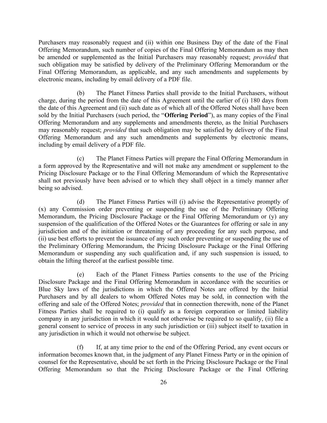 26 Purchasers may reasonably request and (ii) within one Business Day of the date of the Final Offering Memorandum, such number of copies of the Final Offering Memorandum as may then be amended or supplemented as the Initial Purchasers may reasonably request; provided that such obligation may be satisfied by delivery of the Preliminary Offering Memorandum or the Final Offering Memorandum, as applicable, and any such amendments and supplements by electronic means, including by email delivery of a PDF file. (b) The Planet Fitness Parties shall provide to the Initial Purchasers, without charge, during the period from the date of this Agreement until the earlier of (i) 180 days from the date of this Agreement and (ii) such date as of which all of the Offered Notes shall have been sold by the Initial Purchasers (such period, the “Offering Period”), as many copies of the Final Offering Memorandum and any supplements and amendments thereto, as the Initial Purchasers may reasonably request; provided that such obligation may be satisfied by delivery of the Final Offering Memorandum and any such amendments and supplements by electronic means, including by email delivery of a PDF file. (c) The Planet Fitness Parties will prepare the Final Offering Memorandum in a form approved by the Representative and will not make any amendment or supplement to the Pricing Disclosure Package or to the Final Offering Memorandum of which the Representative shall not previously have been advised or to which they shall object in a timely manner after being so advised. (d) The Planet Fitness Parties will (i) advise the Representative promptly of (x) any Commission order preventing or suspending the use of the Preliminary Offering Memorandum, the Pricing Disclosure Package or the Final Offering Memorandum or (y) any suspension of the qualification of the Offered Notes or the Guarantees for offering or sale in any jurisdiction and of the initiation or threatening of any proceeding for any such purpose, and (ii) use best efforts to prevent the issuance of any such order preventing or suspending the use of the Preliminary Offering Memorandum, the Pricing Disclosure Package or the Final Offering Memorandum or suspending any such qualification and, if any such suspension is issued, to obtain the lifting thereof at the earliest possible time. (e) Each of the Planet Fitness Parties consents to the use of the Pricing Disclosure Package and the Final Offering Memorandum in accordance with the securities or Blue Sky laws of the jurisdictions in which the Offered Notes are offered by the Initial Purchasers and by all dealers to whom Offered Notes may be sold, in connection with the offering and sale of the Offered Notes; provided that in connection therewith, none of the Planet Fitness Parties shall be required to (i) qualify as a foreign corporation or limited liability company in any jurisdiction in which it would not otherwise be required to so qualify, (ii) file a general consent to service of process in any such jurisdiction or (iii) subject itself to taxation in any jurisdiction in which it would not otherwise be subject. (f) If, at any time prior to the end of the Offering Period, any event occurs or information becomes known that, in the judgment of any Planet Fitness Party or in the opinion of counsel for the Representative, should be set forth in the Pricing Disclosure Package or the Final Offering Memorandum so that the Pricing Disclosure Package or the Final Offering