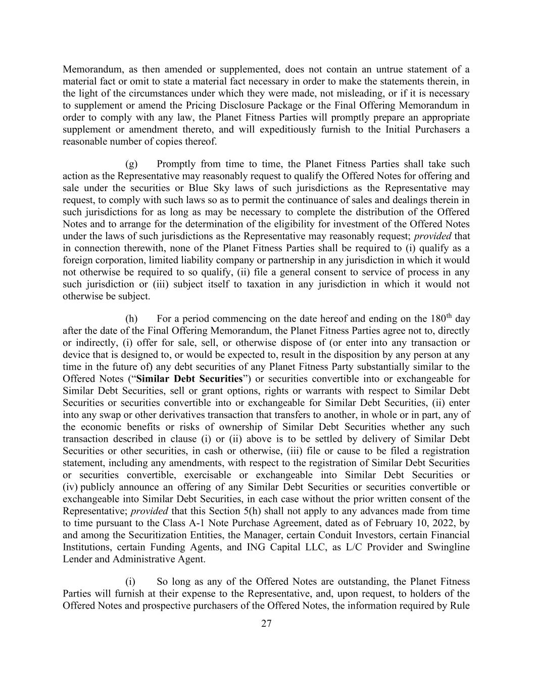 27 Memorandum, as then amended or supplemented, does not contain an untrue statement of a material fact or omit to state a material fact necessary in order to make the statements therein, in the light of the circumstances under which they were made, not misleading, or if it is necessary to supplement or amend the Pricing Disclosure Package or the Final Offering Memorandum in order to comply with any law, the Planet Fitness Parties will promptly prepare an appropriate supplement or amendment thereto, and will expeditiously furnish to the Initial Purchasers a reasonable number of copies thereof. (g) Promptly from time to time, the Planet Fitness Parties shall take such action as the Representative may reasonably request to qualify the Offered Notes for offering and sale under the securities or Blue Sky laws of such jurisdictions as the Representative may request, to comply with such laws so as to permit the continuance of sales and dealings therein in such jurisdictions for as long as may be necessary to complete the distribution of the Offered Notes and to arrange for the determination of the eligibility for investment of the Offered Notes under the laws of such jurisdictions as the Representative may reasonably request; provided that in connection therewith, none of the Planet Fitness Parties shall be required to (i) qualify as a foreign corporation, limited liability company or partnership in any jurisdiction in which it would not otherwise be required to so qualify, (ii) file a general consent to service of process in any such jurisdiction or (iii) subject itself to taxation in any jurisdiction in which it would not otherwise be subject. (h) For a period commencing on the date hereof and ending on the 180th day after the date of the Final Offering Memorandum, the Planet Fitness Parties agree not to, directly or indirectly, (i) offer for sale, sell, or otherwise dispose of (or enter into any transaction or device that is designed to, or would be expected to, result in the disposition by any person at any time in the future of) any debt securities of any Planet Fitness Party substantially similar to the Offered Notes (“Similar Debt Securities”) or securities convertible into or exchangeable for Similar Debt Securities, sell or grant options, rights or warrants with respect to Similar Debt Securities or securities convertible into or exchangeable for Similar Debt Securities, (ii) enter into any swap or other derivatives transaction that transfers to another, in whole or in part, any of the economic benefits or risks of ownership of Similar Debt Securities whether any such transaction described in clause (i) or (ii) above is to be settled by delivery of Similar Debt Securities or other securities, in cash or otherwise, (iii) file or cause to be filed a registration statement, including any amendments, with respect to the registration of Similar Debt Securities or securities convertible, exercisable or exchangeable into Similar Debt Securities or (iv) publicly announce an offering of any Similar Debt Securities or securities convertible or exchangeable into Similar Debt Securities, in each case without the prior written consent of the Representative; provided that this Section 5(h) shall not apply to any advances made from time to time pursuant to the Class A-1 Note Purchase Agreement, dated as of February 10, 2022, by and among the Securitization Entities, the Manager, certain Conduit Investors, certain Financial Institutions, certain Funding Agents, and ING Capital LLC, as L/C Provider and Swingline Lender and Administrative Agent. (i) So long as any of the Offered Notes are outstanding, the Planet Fitness Parties will furnish at their expense to the Representative, and, upon request, to holders of the Offered Notes and prospective purchasers of the Offered Notes, the information required by Rule