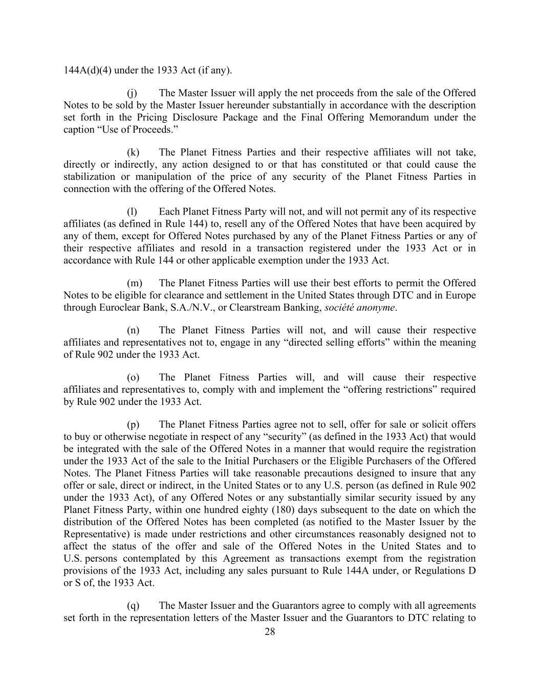 28 144A(d)(4) under the 1933 Act (if any). (j) The Master Issuer will apply the net proceeds from the sale of the Offered Notes to be sold by the Master Issuer hereunder substantially in accordance with the description set forth in the Pricing Disclosure Package and the Final Offering Memorandum under the caption “Use of Proceeds.” (k) The Planet Fitness Parties and their respective affiliates will not take, directly or indirectly, any action designed to or that has constituted or that could cause the stabilization or manipulation of the price of any security of the Planet Fitness Parties in connection with the offering of the Offered Notes. (l) Each Planet Fitness Party will not, and will not permit any of its respective affiliates (as defined in Rule 144) to, resell any of the Offered Notes that have been acquired by any of them, except for Offered Notes purchased by any of the Planet Fitness Parties or any of their respective affiliates and resold in a transaction registered under the 1933 Act or in accordance with Rule 144 or other applicable exemption under the 1933 Act. (m) The Planet Fitness Parties will use their best efforts to permit the Offered Notes to be eligible for clearance and settlement in the United States through DTC and in Europe through Euroclear Bank, S.A./N.V., or Clearstream Banking, société anonyme. (n) The Planet Fitness Parties will not, and will cause their respective affiliates and representatives not to, engage in any “directed selling efforts” within the meaning of Rule 902 under the 1933 Act. (o) The Planet Fitness Parties will, and will cause their respective affiliates and representatives to, comply with and implement the “offering restrictions” required by Rule 902 under the 1933 Act. (p) The Planet Fitness Parties agree not to sell, offer for sale or solicit offers to buy or otherwise negotiate in respect of any “security” (as defined in the 1933 Act) that would be integrated with the sale of the Offered Notes in a manner that would require the registration under the 1933 Act of the sale to the Initial Purchasers or the Eligible Purchasers of the Offered Notes. The Planet Fitness Parties will take reasonable precautions designed to insure that any offer or sale, direct or indirect, in the United States or to any U.S. person (as defined in Rule 902 under the 1933 Act), of any Offered Notes or any substantially similar security issued by any Planet Fitness Party, within one hundred eighty (180) days subsequent to the date on which the distribution of the Offered Notes has been completed (as notified to the Master Issuer by the Representative) is made under restrictions and other circumstances reasonably designed not to affect the status of the offer and sale of the Offered Notes in the United States and to U.S. persons contemplated by this Agreement as transactions exempt from the registration provisions of the 1933 Act, including any sales pursuant to Rule 144A under, or Regulations D or S of, the 1933 Act. (q) The Master Issuer and the Guarantors agree to comply with all agreements set forth in the representation letters of the Master Issuer and the Guarantors to DTC relating to