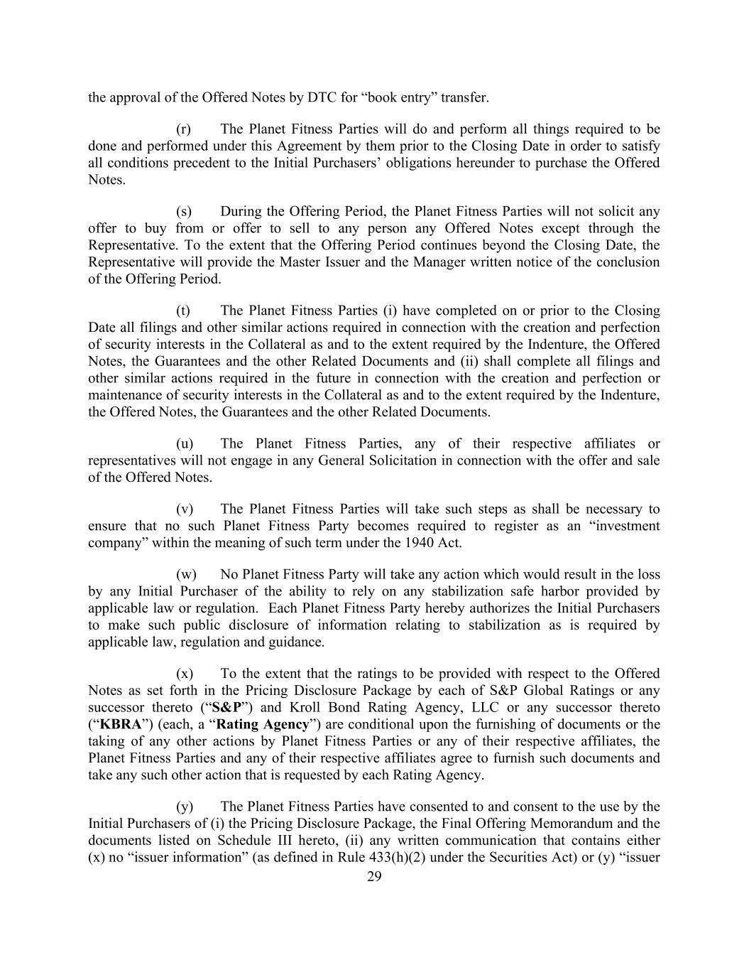 29 the approval of the Offered Notes by DTC for “book entry” transfer. (r) The Planet Fitness Parties will do and perform all things required to be done and performed under this Agreement by them prior to the Closing Date in order to satisfy all conditions precedent to the Initial Purchasers’ obligations hereunder to purchase the Offered Notes. (s) During the Offering Period, the Planet Fitness Parties will not solicit any offer to buy from or offer to sell to any person any Offered Notes except through the Representative. To the extent that the Offering Period continues beyond the Closing Date, the Representative will provide the Master Issuer and the Manager written notice of the conclusion of the Offering Period. (t) The Planet Fitness Parties (i) have completed on or prior to the Closing Date all filings and other similar actions required in connection with the creation and perfection of security interests in the Collateral as and to the extent required by the Indenture, the Offered Notes, the Guarantees and the other Related Documents and (ii) shall complete all filings and other similar actions required in the future in connection with the creation and perfection or maintenance of security interests in the Collateral as and to the extent required by the Indenture, the Offered Notes, the Guarantees and the other Related Documents. (u) The Planet Fitness Parties, any of their respective affiliates or representatives will not engage in any General Solicitation in connection with the offer and sale of the Offered Notes. (v) The Planet Fitness Parties will take such steps as shall be necessary to ensure that no such Planet Fitness Party becomes required to register as an “investment company” within the meaning of such term under the 1940 Act. (w) No Planet Fitness Party will take any action which would result in the loss by any Initial Purchaser of the ability to rely on any stabilization safe harbor provided by applicable law or regulation. Each Planet Fitness Party hereby authorizes the Initial Purchasers to make such public disclosure of information relating to stabilization as is required by applicable law, regulation and guidance. (x) To the extent that the ratings to be provided with respect to the Offered Notes as set forth in the Pricing Disclosure Package by each of S&P Global Ratings or any successor thereto (“S&P”) and Kroll Bond Rating Agency, LLC or any successor thereto (“KBRA”) (each, a “Rating Agency”) are conditional upon the furnishing of documents or the taking of any other actions by Planet Fitness Parties or any of their respective affiliates, the Planet Fitness Parties and any of their respective affiliates agree to furnish such documents and take any such other action that is requested by each Rating Agency. (y) The Planet Fitness Parties have consented to and consent to the use by the Initial Purchasers of (i) the Pricing Disclosure Package, the Final Offering Memorandum and the documents listed on Schedule III hereto, (ii) any written communication that contains either (x) no “issuer information” (as defined in Rule 433(h)(2) under the Securities Act) or (y) “issuer