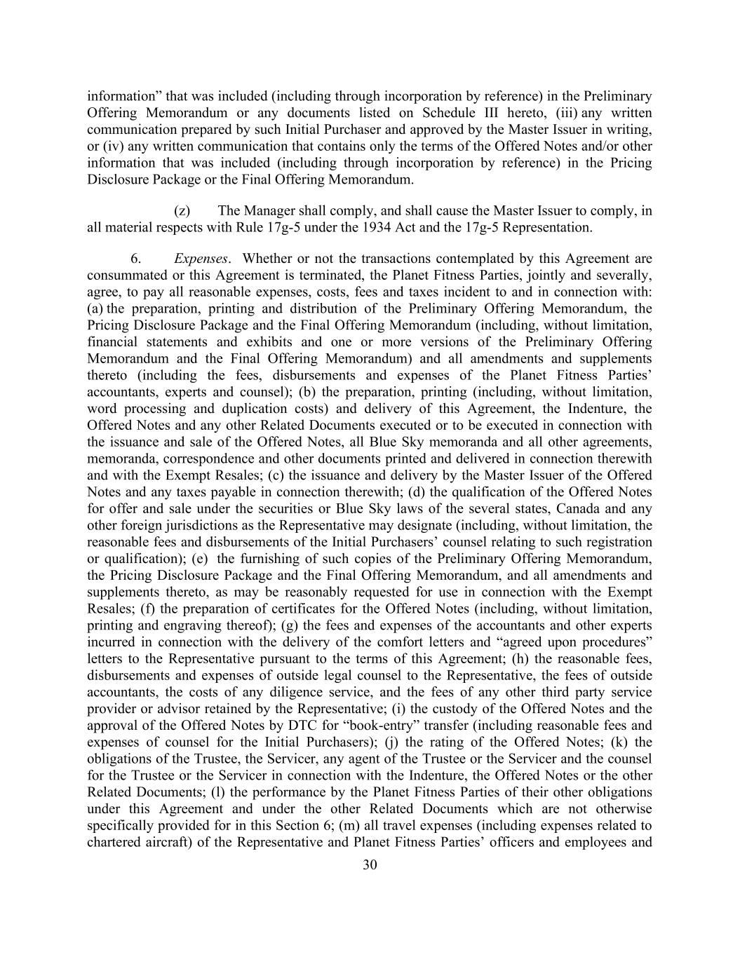 30 information” that was included (including through incorporation by reference) in the Preliminary Offering Memorandum or any documents listed on Schedule III hereto, (iii) any written communication prepared by such Initial Purchaser and approved by the Master Issuer in writing, or (iv) any written communication that contains only the terms of the Offered Notes and/or other information that was included (including through incorporation by reference) in the Pricing Disclosure Package or the Final Offering Memorandum. (z) The Manager shall comply, and shall cause the Master Issuer to comply, in all material respects with Rule 17g-5 under the 1934 Act and the 17g-5 Representation. 6. Expenses. Whether or not the transactions contemplated by this Agreement are consummated or this Agreement is terminated, the Planet Fitness Parties, jointly and severally, agree, to pay all reasonable expenses, costs, fees and taxes incident to and in connection with: (a) the preparation, printing and distribution of the Preliminary Offering Memorandum, the Pricing Disclosure Package and the Final Offering Memorandum (including, without limitation, financial statements and exhibits and one or more versions of the Preliminary Offering Memorandum and the Final Offering Memorandum) and all amendments and supplements thereto (including the fees, disbursements and expenses of the Planet Fitness Parties’ accountants, experts and counsel); (b) the preparation, printing (including, without limitation, word processing and duplication costs) and delivery of this Agreement, the Indenture, the Offered Notes and any other Related Documents executed or to be executed in connection with the issuance and sale of the Offered Notes, all Blue Sky memoranda and all other agreements, memoranda, correspondence and other documents printed and delivered in connection therewith and with the Exempt Resales; (c) the issuance and delivery by the Master Issuer of the Offered Notes and any taxes payable in connection therewith; (d) the qualification of the Offered Notes for offer and sale under the securities or Blue Sky laws of the several states, Canada and any other foreign jurisdictions as the Representative may designate (including, without limitation, the reasonable fees and disbursements of the Initial Purchasers’ counsel relating to such registration or qualification); (e) the furnishing of such copies of the Preliminary Offering Memorandum, the Pricing Disclosure Package and the Final Offering Memorandum, and all amendments and supplements thereto, as may be reasonably requested for use in connection with the Exempt Resales; (f) the preparation of certificates for the Offered Notes (including, without limitation, printing and engraving thereof); (g) the fees and expenses of the accountants and other experts incurred in connection with the delivery of the comfort letters and “agreed upon procedures” letters to the Representative pursuant to the terms of this Agreement; (h) the reasonable fees, disbursements and expenses of outside legal counsel to the Representative, the fees of outside accountants, the costs of any diligence service, and the fees of any other third party service provider or advisor retained by the Representative; (i) the custody of the Offered Notes and the approval of the Offered Notes by DTC for “book-entry” transfer (including reasonable fees and expenses of counsel for the Initial Purchasers); (j) the rating of the Offered Notes; (k) the obligations of the Trustee, the Servicer, any agent of the Trustee or the Servicer and the counsel for the Trustee or the Servicer in connection with the Indenture, the Offered Notes or the other Related Documents; (l) the performance by the Planet Fitness Parties of their other obligations under this Agreement and under the other Related Documents which are not otherwise specifically provided for in this Section 6; (m) all travel expenses (including expenses related to chartered aircraft) of the Representative and Planet Fitness Parties’ officers and employees and