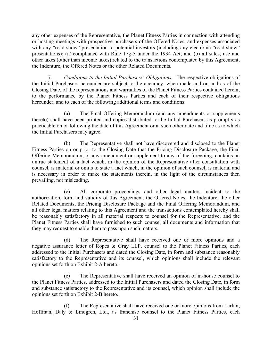 31 any other expenses of the Representative, the Planet Fitness Parties in connection with attending or hosting meetings with prospective purchasers of the Offered Notes, and expenses associated with any “road show” presentation to potential investors (including any electronic “road show” presentations); (n) compliance with Rule 17g-5 under the 1934 Act; and (o) all sales, use and other taxes (other than income taxes) related to the transactions contemplated by this Agreement, the Indenture, the Offered Notes or the other Related Documents. 7. Conditions to the Initial Purchasers’ Obligations. The respective obligations of the Initial Purchasers hereunder are subject to the accuracy, when made and on and as of the Closing Date, of the representations and warranties of the Planet Fitness Parties contained herein, to the performance by the Planet Fitness Parties and each of their respective obligations hereunder, and to each of the following additional terms and conditions: (a) The Final Offering Memorandum (and any amendments or supplements thereto) shall have been printed and copies distributed to the Initial Purchasers as promptly as practicable on or following the date of this Agreement or at such other date and time as to which the Initial Purchasers may agree. (b) The Representative shall not have discovered and disclosed to the Planet Fitness Parties on or prior to the Closing Date that the Pricing Disclosure Package, the Final Offering Memorandum, or any amendment or supplement to any of the foregoing, contains an untrue statement of a fact which, in the opinion of the Representative after consultation with counsel, is material or omits to state a fact which, in the opinion of such counsel, is material and is necessary in order to make the statements therein, in the light of the circumstances then prevailing, not misleading. (c) All corporate proceedings and other legal matters incident to the authorization, form and validity of this Agreement, the Offered Notes, the Indenture, the other Related Documents, the Pricing Disclosure Package and the Final Offering Memorandum, and all other legal matters relating to this Agreement and the transactions contemplated hereby shall be reasonably satisfactory in all material respects to counsel for the Representative, and the Planet Fitness Parties shall have furnished to such counsel all documents and information that they may request to enable them to pass upon such matters. (d) The Representative shall have received one or more opinions and a negative assurance letter of Ropes & Gray LLP, counsel to the Planet Fitness Parties, each addressed to the Initial Purchasers and dated the Closing Date, in form and substance reasonably satisfactory to the Representative and its counsel, which opinions shall include the relevant opinions set forth on Exhibit 2-A hereto. (e) The Representative shall have received an opinion of in-house counsel to the Planet Fitness Parties, addressed to the Initial Purchasers and dated the Closing Date, in form and substance satisfactory to the Representative and its counsel, which opinion shall include the opinions set forth on Exhibit 2-B hereto. (f) The Representative shall have received one or more opinions from Larkin, Hoffman, Daly & Lindgren, Ltd., as franchise counsel to the Planet Fitness Parties, each