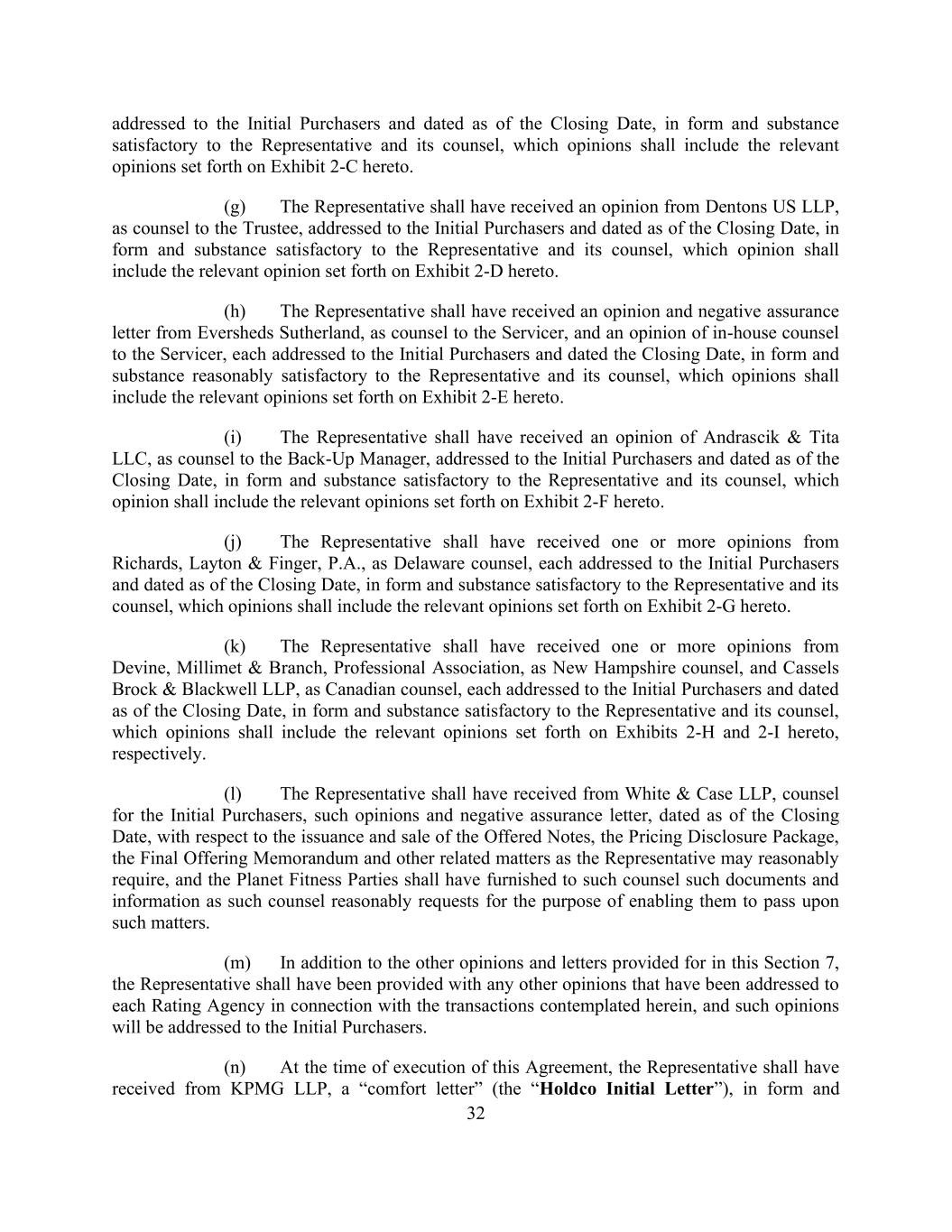32 addressed to the Initial Purchasers and dated as of the Closing Date, in form and substance satisfactory to the Representative and its counsel, which opinions shall include the relevant opinions set forth on Exhibit 2-C hereto. (g) The Representative shall have received an opinion from Dentons US LLP, as counsel to the Trustee, addressed to the Initial Purchasers and dated as of the Closing Date, in form and substance satisfactory to the Representative and its counsel, which opinion shall include the relevant opinion set forth on Exhibit 2-D hereto. (h) The Representative shall have received an opinion and negative assurance letter from Eversheds Sutherland, as counsel to the Servicer, and an opinion of in-house counsel to the Servicer, each addressed to the Initial Purchasers and dated the Closing Date, in form and substance reasonably satisfactory to the Representative and its counsel, which opinions shall include the relevant opinions set forth on Exhibit 2-E hereto. (i) The Representative shall have received an opinion of Andrascik & Tita LLC, as counsel to the Back-Up Manager, addressed to the Initial Purchasers and dated as of the Closing Date, in form and substance satisfactory to the Representative and its counsel, which opinion shall include the relevant opinions set forth on Exhibit 2-F hereto. (j) The Representative shall have received one or more opinions from Richards, Layton & Finger, P.A., as Delaware counsel, each addressed to the Initial Purchasers and dated as of the Closing Date, in form and substance satisfactory to the Representative and its counsel, which opinions shall include the relevant opinions set forth on Exhibit 2-G hereto. (k) The Representative shall have received one or more opinions from Devine, Millimet & Branch, Professional Association, as New Hampshire counsel, and Cassels Brock & Blackwell LLP, as Canadian counsel, each addressed to the Initial Purchasers and dated as of the Closing Date, in form and substance satisfactory to the Representative and its counsel, which opinions shall include the relevant opinions set forth on Exhibits 2-H and 2-I hereto, respectively. (l) The Representative shall have received from White & Case LLP, counsel for the Initial Purchasers, such opinions and negative assurance letter, dated as of the Closing Date, with respect to the issuance and sale of the Offered Notes, the Pricing Disclosure Package, the Final Offering Memorandum and other related matters as the Representative may reasonably require, and the Planet Fitness Parties shall have furnished to such counsel such documents and information as such counsel reasonably requests for the purpose of enabling them to pass upon such matters. (m) In addition to the other opinions and letters provided for in this Section 7, the Representative shall have been provided with any other opinions that have been addressed to each Rating Agency in connection with the transactions contemplated herein, and such opinions will be addressed to the Initial Purchasers. (n) At the time of execution of this Agreement, the Representative shall have received from KPMG LLP, a “comfort letter” (the “Holdco Initial Letter”), in form and