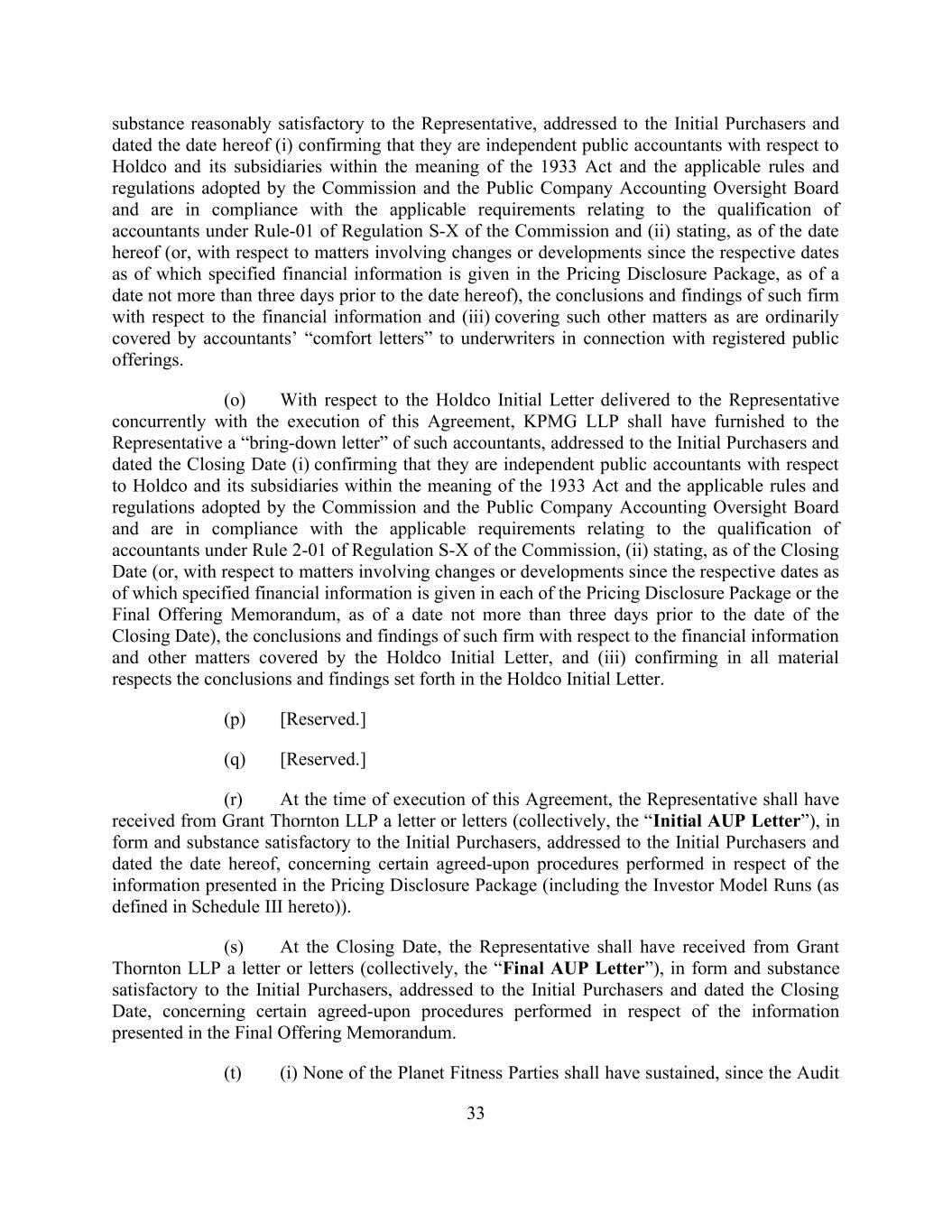 33 substance reasonably satisfactory to the Representative, addressed to the Initial Purchasers and dated the date hereof (i) confirming that they are independent public accountants with respect to Holdco and its subsidiaries within the meaning of the 1933 Act and the applicable rules and regulations adopted by the Commission and the Public Company Accounting Oversight Board and are in compliance with the applicable requirements relating to the qualification of accountants under Rule-01 of Regulation S-X of the Commission and (ii) stating, as of the date hereof (or, with respect to matters involving changes or developments since the respective dates as of which specified financial information is given in the Pricing Disclosure Package, as of a date not more than three days prior to the date hereof), the conclusions and findings of such firm with respect to the financial information and (iii) covering such other matters as are ordinarily covered by accountants’ “comfort letters” to underwriters in connection with registered public offerings. (o) With respect to the Holdco Initial Letter delivered to the Representative concurrently with the execution of this Agreement, KPMG LLP shall have furnished to the Representative a “bring-down letter” of such accountants, addressed to the Initial Purchasers and dated the Closing Date (i) confirming that they are independent public accountants with respect to Holdco and its subsidiaries within the meaning of the 1933 Act and the applicable rules and regulations adopted by the Commission and the Public Company Accounting Oversight Board and are in compliance with the applicable requirements relating to the qualification of accountants under Rule 2-01 of Regulation S-X of the Commission, (ii) stating, as of the Closing Date (or, with respect to matters involving changes or developments since the respective dates as of which specified financial information is given in each of the Pricing Disclosure Package or the Final Offering Memorandum, as of a date not more than three days prior to the date of the Closing Date), the conclusions and findings of such firm with respect to the financial information and other matters covered by the Holdco Initial Letter, and (iii) confirming in all material respects the conclusions and findings set forth in the Holdco Initial Letter. (p) [Reserved.] (q) [Reserved.] (r) At the time of execution of this Agreement, the Representative shall have received from Grant Thornton LLP a letter or letters (collectively, the “Initial AUP Letter”), in form and substance satisfactory to the Initial Purchasers, addressed to the Initial Purchasers and dated the date hereof, concerning certain agreed-upon procedures performed in respect of the information presented in the Pricing Disclosure Package (including the Investor Model Runs (as defined in Schedule III hereto)). (s) At the Closing Date, the Representative shall have received from Grant Thornton LLP a letter or letters (collectively, the “Final AUP Letter”), in form and substance satisfactory to the Initial Purchasers, addressed to the Initial Purchasers and dated the Closing Date, concerning certain agreed-upon procedures performed in respect of the information presented in the Final Offering Memorandum. (t) (i) None of the Planet Fitness Parties shall have sustained, since the Audit