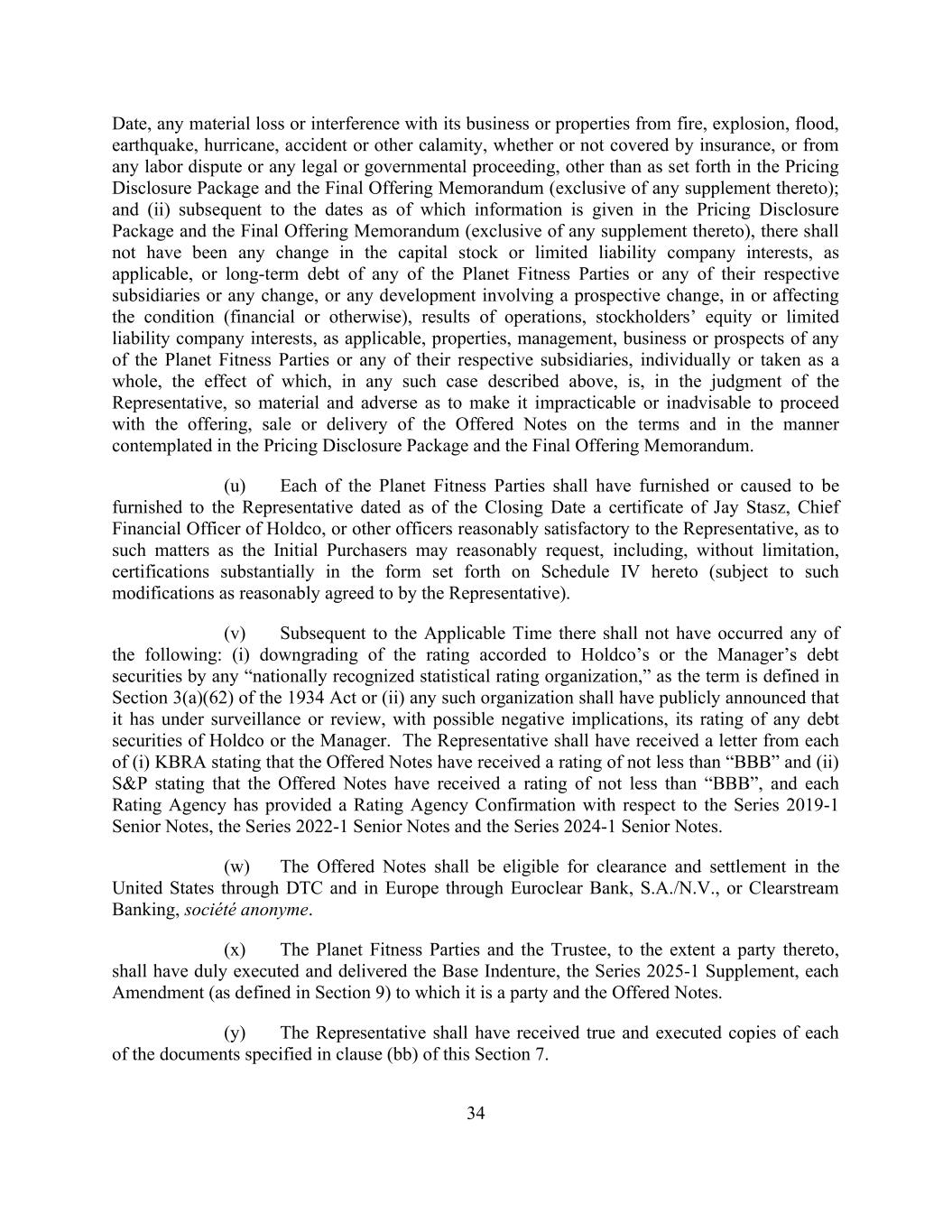 34 Date, any material loss or interference with its business or properties from fire, explosion, flood, earthquake, hurricane, accident or other calamity, whether or not covered by insurance, or from any labor dispute or any legal or governmental proceeding, other than as set forth in the Pricing Disclosure Package and the Final Offering Memorandum (exclusive of any supplement thereto); and (ii) subsequent to the dates as of which information is given in the Pricing Disclosure Package and the Final Offering Memorandum (exclusive of any supplement thereto), there shall not have been any change in the capital stock or limited liability company interests, as applicable, or long-term debt of any of the Planet Fitness Parties or any of their respective subsidiaries or any change, or any development involving a prospective change, in or affecting the condition (financial or otherwise), results of operations, stockholders’ equity or limited liability company interests, as applicable, properties, management, business or prospects of any of the Planet Fitness Parties or any of their respective subsidiaries, individually or taken as a whole, the effect of which, in any such case described above, is, in the judgment of the Representative, so material and adverse as to make it impracticable or inadvisable to proceed with the offering, sale or delivery of the Offered Notes on the terms and in the manner contemplated in the Pricing Disclosure Package and the Final Offering Memorandum. (u) Each of the Planet Fitness Parties shall have furnished or caused to be furnished to the Representative dated as of the Closing Date a certificate of Jay Stasz, Chief Financial Officer of Holdco, or other officers reasonably satisfactory to the Representative, as to such matters as the Initial Purchasers may reasonably request, including, without limitation, certifications substantially in the form set forth on Schedule IV hereto (subject to such modifications as reasonably agreed to by the Representative). (v) Subsequent to the Applicable Time there shall not have occurred any of the following: (i) downgrading of the rating accorded to Holdco’s or the Manager’s debt securities by any “nationally recognized statistical rating organization,” as the term is defined in Section 3(a)(62) of the 1934 Act or (ii) any such organization shall have publicly announced that it has under surveillance or review, with possible negative implications, its rating of any debt securities of Holdco or the Manager. The Representative shall have received a letter from each of (i) KBRA stating that the Offered Notes have received a rating of not less than “BBB” and (ii) S&P stating that the Offered Notes have received a rating of not less than “BBB”, and each Rating Agency has provided a Rating Agency Confirmation with respect to the Series 2019-1 Senior Notes, the Series 2022-1 Senior Notes and the Series 2024-1 Senior Notes. (w) The Offered Notes shall be eligible for clearance and settlement in the United States through DTC and in Europe through Euroclear Bank, S.A./N.V., or Clearstream Banking, société anonyme. (x) The Planet Fitness Parties and the Trustee, to the extent a party thereto, shall have duly executed and delivered the Base Indenture, the Series 2025-1 Supplement, each Amendment (as defined in Section 9) to which it is a party and the Offered Notes. (y) The Representative shall have received true and executed copies of each of the documents specified in clause (bb) of this Section 7.