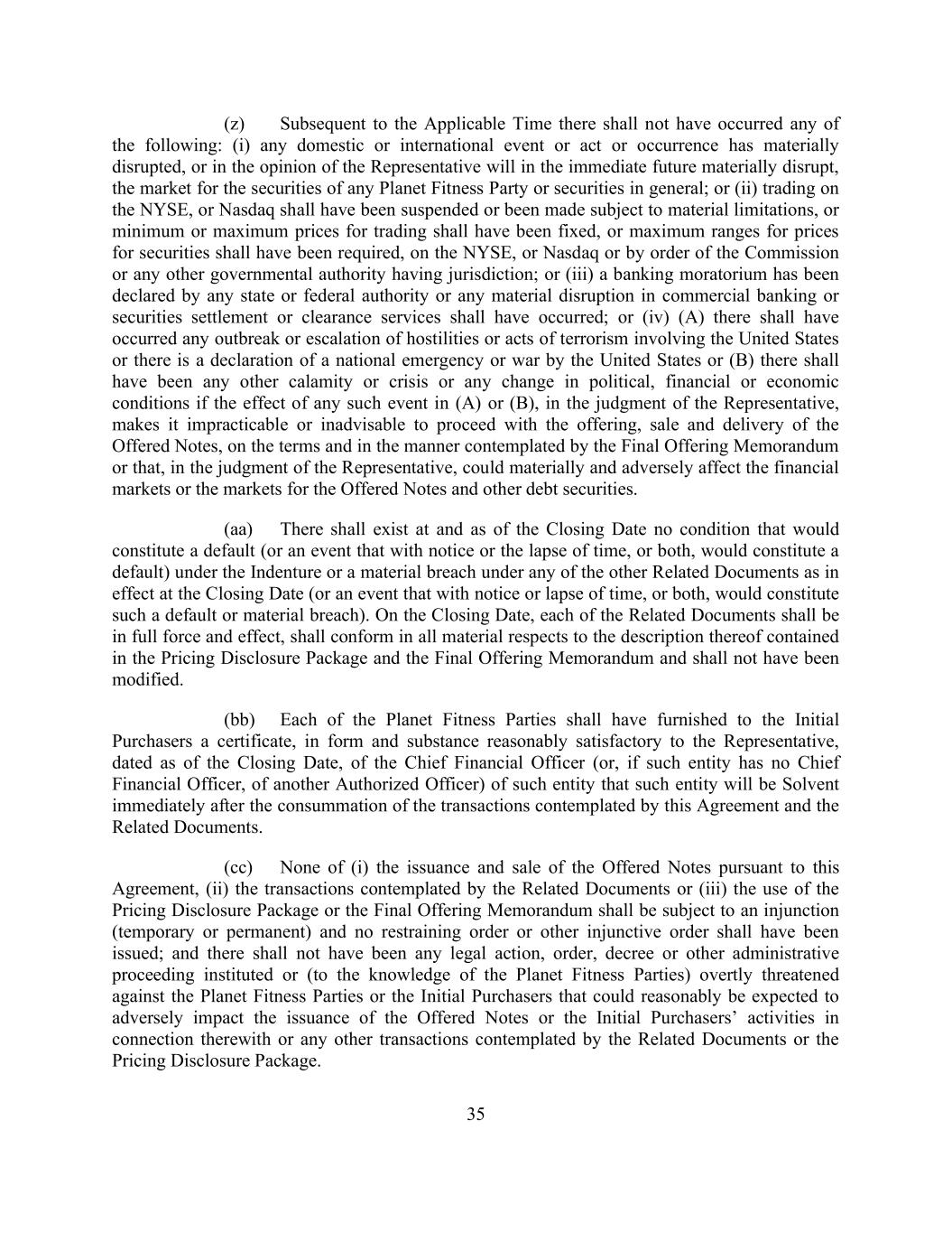 35 (z) Subsequent to the Applicable Time there shall not have occurred any of the following: (i) any domestic or international event or act or occurrence has materially disrupted, or in the opinion of the Representative will in the immediate future materially disrupt, the market for the securities of any Planet Fitness Party or securities in general; or (ii) trading on the NYSE, or Nasdaq shall have been suspended or been made subject to material limitations, or minimum or maximum prices for trading shall have been fixed, or maximum ranges for prices for securities shall have been required, on the NYSE, or Nasdaq or by order of the Commission or any other governmental authority having jurisdiction; or (iii) a banking moratorium has been declared by any state or federal authority or any material disruption in commercial banking or securities settlement or clearance services shall have occurred; or (iv) (A) there shall have occurred any outbreak or escalation of hostilities or acts of terrorism involving the United States or there is a declaration of a national emergency or war by the United States or (B) there shall have been any other calamity or crisis or any change in political, financial or economic conditions if the effect of any such event in (A) or (B), in the judgment of the Representative, makes it impracticable or inadvisable to proceed with the offering, sale and delivery of the Offered Notes, on the terms and in the manner contemplated by the Final Offering Memorandum or that, in the judgment of the Representative, could materially and adversely affect the financial markets or the markets for the Offered Notes and other debt securities. (aa) There shall exist at and as of the Closing Date no condition that would constitute a default (or an event that with notice or the lapse of time, or both, would constitute a default) under the Indenture or a material breach under any of the other Related Documents as in effect at the Closing Date (or an event that with notice or lapse of time, or both, would constitute such a default or material breach). On the Closing Date, each of the Related Documents shall be in full force and effect, shall conform in all material respects to the description thereof contained in the Pricing Disclosure Package and the Final Offering Memorandum and shall not have been modified. (bb) Each of the Planet Fitness Parties shall have furnished to the Initial Purchasers a certificate, in form and substance reasonably satisfactory to the Representative, dated as of the Closing Date, of the Chief Financial Officer (or, if such entity has no Chief Financial Officer, of another Authorized Officer) of such entity that such entity will be Solvent immediately after the consummation of the transactions contemplated by this Agreement and the Related Documents. (cc) None of (i) the issuance and sale of the Offered Notes pursuant to this Agreement, (ii) the transactions contemplated by the Related Documents or (iii) the use of the Pricing Disclosure Package or the Final Offering Memorandum shall be subject to an injunction (temporary or permanent) and no restraining order or other injunctive order shall have been issued; and there shall not have been any legal action, order, decree or other administrative proceeding instituted or (to the knowledge of the Planet Fitness Parties) overtly threatened against the Planet Fitness Parties or the Initial Purchasers that could reasonably be expected to adversely impact the issuance of the Offered Notes or the Initial Purchasers’ activities in connection therewith or any other transactions contemplated by the Related Documents or the Pricing Disclosure Package.