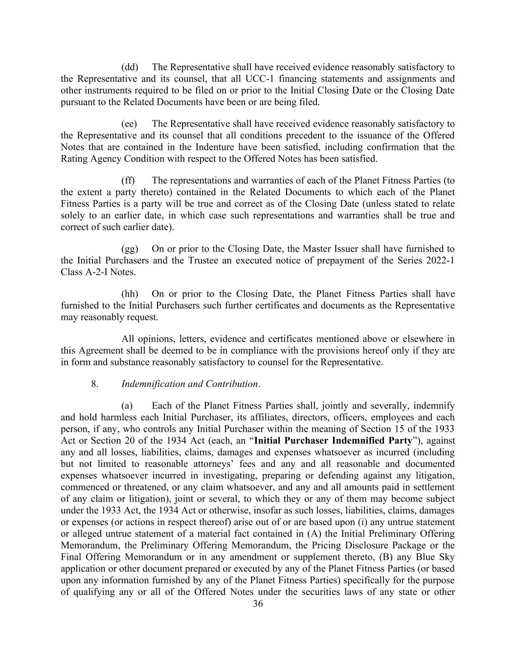 36 (dd) The Representative shall have received evidence reasonably satisfactory to the Representative and its counsel, that all UCC-1 financing statements and assignments and other instruments required to be filed on or prior to the Initial Closing Date or the Closing Date pursuant to the Related Documents have been or are being filed. (ee) The Representative shall have received evidence reasonably satisfactory to the Representative and its counsel that all conditions precedent to the issuance of the Offered Notes that are contained in the Indenture have been satisfied, including confirmation that the Rating Agency Condition with respect to the Offered Notes has been satisfied. (ff) The representations and warranties of each of the Planet Fitness Parties (to the extent a party thereto) contained in the Related Documents to which each of the Planet Fitness Parties is a party will be true and correct as of the Closing Date (unless stated to relate solely to an earlier date, in which case such representations and warranties shall be true and correct of such earlier date). (gg) On or prior to the Closing Date, the Master Issuer shall have furnished to the Initial Purchasers and the Trustee an executed notice of prepayment of the Series 2022-1 Class A-2-I Notes. (hh) On or prior to the Closing Date, the Planet Fitness Parties shall have furnished to the Initial Purchasers such further certificates and documents as the Representative may reasonably request. All opinions, letters, evidence and certificates mentioned above or elsewhere in this Agreement shall be deemed to be in compliance with the provisions hereof only if they are in form and substance reasonably satisfactory to counsel for the Representative. 8. Indemnification and Contribution. (a) Each of the Planet Fitness Parties shall, jointly and severally, indemnify and hold harmless each Initial Purchaser, its affiliates, directors, officers, employees and each person, if any, who controls any Initial Purchaser within the meaning of Section 15 of the 1933 Act or Section 20 of the 1934 Act (each, an “Initial Purchaser Indemnified Party”), against any and all losses, liabilities, claims, damages and expenses whatsoever as incurred (including but not limited to reasonable attorneys’ fees and any and all reasonable and documented expenses whatsoever incurred in investigating, preparing or defending against any litigation, commenced or threatened, or any claim whatsoever, and any and all amounts paid in settlement of any claim or litigation), joint or several, to which they or any of them may become subject under the 1933 Act, the 1934 Act or otherwise, insofar as such losses, liabilities, claims, damages or expenses (or actions in respect thereof) arise out of or are based upon (i) any untrue statement or alleged untrue statement of a material fact contained in (A) the Initial Preliminary Offering Memorandum, the Preliminary Offering Memorandum, the Pricing Disclosure Package or the Final Offering Memorandum or in any amendment or supplement thereto, (B) any Blue Sky application or other document prepared or executed by any of the Planet Fitness Parties (or based upon any information furnished by any of the Planet Fitness Parties) specifically for the purpose of qualifying any or all of the Offered Notes under the securities laws of any state or other