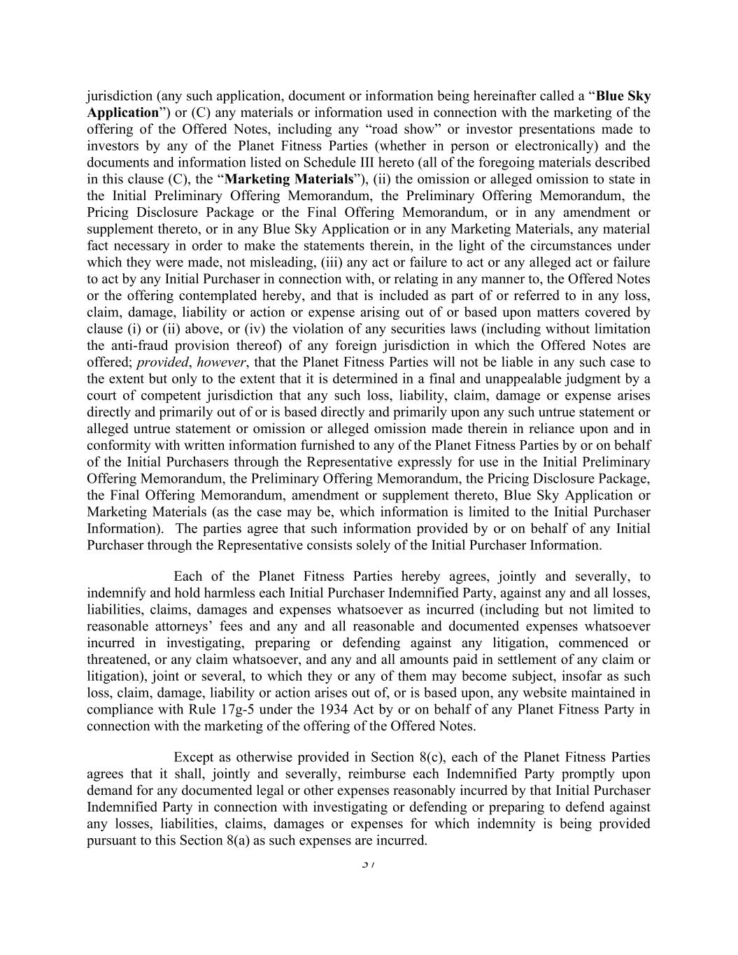 37 jurisdiction (any such application, document or information being hereinafter called a “Blue Sky Application”) or (C) any materials or information used in connection with the marketing of the offering of the Offered Notes, including any “road show” or investor presentations made to investors by any of the Planet Fitness Parties (whether in person or electronically) and the documents and information listed on Schedule III hereto (all of the foregoing materials described in this clause (C), the “Marketing Materials”), (ii) the omission or alleged omission to state in the Initial Preliminary Offering Memorandum, the Preliminary Offering Memorandum, the Pricing Disclosure Package or the Final Offering Memorandum, or in any amendment or supplement thereto, or in any Blue Sky Application or in any Marketing Materials, any material fact necessary in order to make the statements therein, in the light of the circumstances under which they were made, not misleading, (iii) any act or failure to act or any alleged act or failure to act by any Initial Purchaser in connection with, or relating in any manner to, the Offered Notes or the offering contemplated hereby, and that is included as part of or referred to in any loss, claim, damage, liability or action or expense arising out of or based upon matters covered by clause (i) or (ii) above, or (iv) the violation of any securities laws (including without limitation the anti-fraud provision thereof) of any foreign jurisdiction in which the Offered Notes are offered; provided, however, that the Planet Fitness Parties will not be liable in any such case to the extent but only to the extent that it is determined in a final and unappealable judgment by a court of competent jurisdiction that any such loss, liability, claim, damage or expense arises directly and primarily out of or is based directly and primarily upon any such untrue statement or alleged untrue statement or omission or alleged omission made therein in reliance upon and in conformity with written information furnished to any of the Planet Fitness Parties by or on behalf of the Initial Purchasers through the Representative expressly for use in the Initial Preliminary Offering Memorandum, the Preliminary Offering Memorandum, the Pricing Disclosure Package, the Final Offering Memorandum, amendment or supplement thereto, Blue Sky Application or Marketing Materials (as the case may be, which information is limited to the Initial Purchaser Information). The parties agree that such information provided by or on behalf of any Initial Purchaser through the Representative consists solely of the Initial Purchaser Information. Each of the Planet Fitness Parties hereby agrees, jointly and severally, to indemnify and hold harmless each Initial Purchaser Indemnified Party, against any and all losses, liabilities, claims, damages and expenses whatsoever as incurred (including but not limited to reasonable attorneys’ fees and any and all reasonable and documented expenses whatsoever incurred in investigating, preparing or defending against any litigation, commenced or threatened, or any claim whatsoever, and any and all amounts paid in settlement of any claim or litigation), joint or several, to which they or any of them may become subject, insofar as such loss, claim, damage, liability or action arises out of, or is based upon, any website maintained in compliance with Rule 17g-5 under the 1934 Act by or on behalf of any Planet Fitness Party in connection with the marketing of the offering of the Offered Notes. Except as otherwise provided in Section 8(c), each of the Planet Fitness Parties agrees that it shall, jointly and severally, reimburse each Indemnified Party promptly upon demand for any documented legal or other expenses reasonably incurred by that Initial Purchaser Indemnified Party in connection with investigating or defending or preparing to defend against any losses, liabilities, claims, damages or expenses for which indemnity is being provided pursuant to this Section 8(a) as such expenses are incurred.