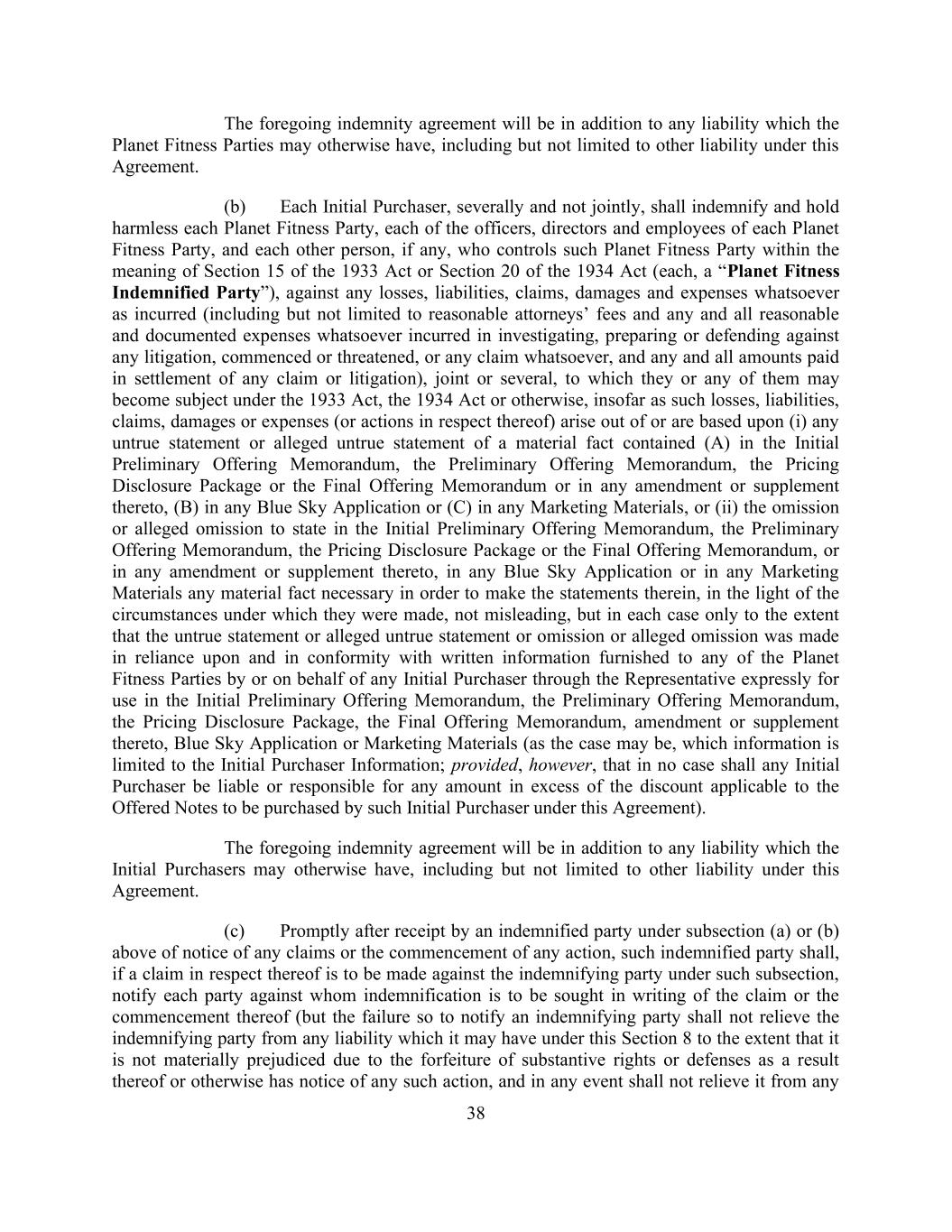38 The foregoing indemnity agreement will be in addition to any liability which the Planet Fitness Parties may otherwise have, including but not limited to other liability under this Agreement. (b) Each Initial Purchaser, severally and not jointly, shall indemnify and hold harmless each Planet Fitness Party, each of the officers, directors and employees of each Planet Fitness Party, and each other person, if any, who controls such Planet Fitness Party within the meaning of Section 15 of the 1933 Act or Section 20 of the 1934 Act (each, a “Planet Fitness Indemnified Party”), against any losses, liabilities, claims, damages and expenses whatsoever as incurred (including but not limited to reasonable attorneys’ fees and any and all reasonable and documented expenses whatsoever incurred in investigating, preparing or defending against any litigation, commenced or threatened, or any claim whatsoever, and any and all amounts paid in settlement of any claim or litigation), joint or several, to which they or any of them may become subject under the 1933 Act, the 1934 Act or otherwise, insofar as such losses, liabilities, claims, damages or expenses (or actions in respect thereof) arise out of or are based upon (i) any untrue statement or alleged untrue statement of a material fact contained (A) in the Initial Preliminary Offering Memorandum, the Preliminary Offering Memorandum, the Pricing Disclosure Package or the Final Offering Memorandum or in any amendment or supplement thereto, (B) in any Blue Sky Application or (C) in any Marketing Materials, or (ii) the omission or alleged omission to state in the Initial Preliminary Offering Memorandum, the Preliminary Offering Memorandum, the Pricing Disclosure Package or the Final Offering Memorandum, or in any amendment or supplement thereto, in any Blue Sky Application or in any Marketing Materials any material fact necessary in order to make the statements therein, in the light of the circumstances under which they were made, not misleading, but in each case only to the extent that the untrue statement or alleged untrue statement or omission or alleged omission was made in reliance upon and in conformity with written information furnished to any of the Planet Fitness Parties by or on behalf of any Initial Purchaser through the Representative expressly for use in the Initial Preliminary Offering Memorandum, the Preliminary Offering Memorandum, the Pricing Disclosure Package, the Final Offering Memorandum, amendment or supplement thereto, Blue Sky Application or Marketing Materials (as the case may be, which information is limited to the Initial Purchaser Information; provided, however, that in no case shall any Initial Purchaser be liable or responsible for any amount in excess of the discount applicable to the Offered Notes to be purchased by such Initial Purchaser under this Agreement). The foregoing indemnity agreement will be in addition to any liability which the Initial Purchasers may otherwise have, including but not limited to other liability under this Agreement. (c) Promptly after receipt by an indemnified party under subsection (a) or (b) above of notice of any claims or the commencement of any action, such indemnified party shall, if a claim in respect thereof is to be made against the indemnifying party under such subsection, notify each party against whom indemnification is to be sought in writing of the claim or the commencement thereof (but the failure so to notify an indemnifying party shall not relieve the indemnifying party from any liability which it may have under this Section 8 to the extent that it is not materially prejudiced due to the forfeiture of substantive rights or defenses as a result thereof or otherwise has notice of any such action, and in any event shall not relieve it from any
