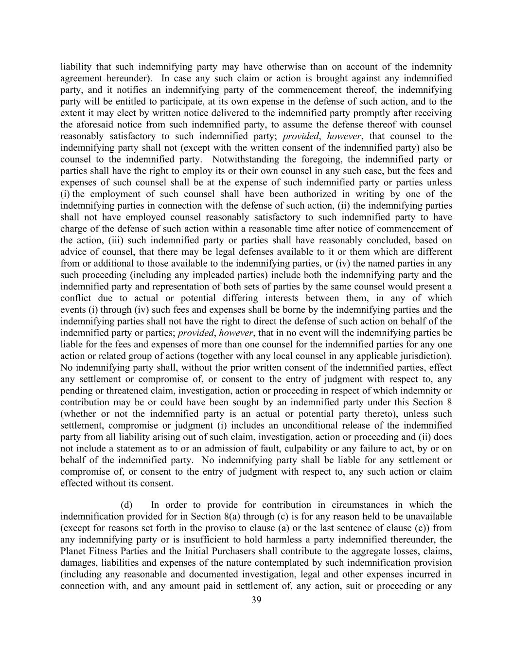 39 liability that such indemnifying party may have otherwise than on account of the indemnity agreement hereunder). In case any such claim or action is brought against any indemnified party, and it notifies an indemnifying party of the commencement thereof, the indemnifying party will be entitled to participate, at its own expense in the defense of such action, and to the extent it may elect by written notice delivered to the indemnified party promptly after receiving the aforesaid notice from such indemnified party, to assume the defense thereof with counsel reasonably satisfactory to such indemnified party; provided, however, that counsel to the indemnifying party shall not (except with the written consent of the indemnified party) also be counsel to the indemnified party. Notwithstanding the foregoing, the indemnified party or parties shall have the right to employ its or their own counsel in any such case, but the fees and expenses of such counsel shall be at the expense of such indemnified party or parties unless (i) the employment of such counsel shall have been authorized in writing by one of the indemnifying parties in connection with the defense of such action, (ii) the indemnifying parties shall not have employed counsel reasonably satisfactory to such indemnified party to have charge of the defense of such action within a reasonable time after notice of commencement of the action, (iii) such indemnified party or parties shall have reasonably concluded, based on advice of counsel, that there may be legal defenses available to it or them which are different from or additional to those available to the indemnifying parties, or (iv) the named parties in any such proceeding (including any impleaded parties) include both the indemnifying party and the indemnified party and representation of both sets of parties by the same counsel would present a conflict due to actual or potential differing interests between them, in any of which events (i) through (iv) such fees and expenses shall be borne by the indemnifying parties and the indemnifying parties shall not have the right to direct the defense of such action on behalf of the indemnified party or parties; provided, however, that in no event will the indemnifying parties be liable for the fees and expenses of more than one counsel for the indemnified parties for any one action or related group of actions (together with any local counsel in any applicable jurisdiction). No indemnifying party shall, without the prior written consent of the indemnified parties, effect any settlement or compromise of, or consent to the entry of judgment with respect to, any pending or threatened claim, investigation, action or proceeding in respect of which indemnity or contribution may be or could have been sought by an indemnified party under this Section 8 (whether or not the indemnified party is an actual or potential party thereto), unless such settlement, compromise or judgment (i) includes an unconditional release of the indemnified party from all liability arising out of such claim, investigation, action or proceeding and (ii) does not include a statement as to or an admission of fault, culpability or any failure to act, by or on behalf of the indemnified party. No indemnifying party shall be liable for any settlement or compromise of, or consent to the entry of judgment with respect to, any such action or claim effected without its consent. (d) In order to provide for contribution in circumstances in which the indemnification provided for in Section 8(a) through (c) is for any reason held to be unavailable (except for reasons set forth in the proviso to clause (a) or the last sentence of clause (c)) from any indemnifying party or is insufficient to hold harmless a party indemnified thereunder, the Planet Fitness Parties and the Initial Purchasers shall contribute to the aggregate losses, claims, damages, liabilities and expenses of the nature contemplated by such indemnification provision (including any reasonable and documented investigation, legal and other expenses incurred in connection with, and any amount paid in settlement of, any action, suit or proceeding or any