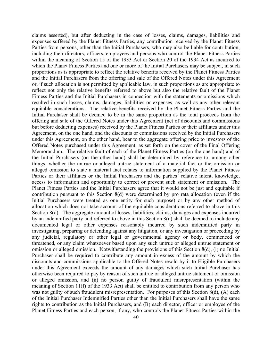 40 claims asserted), but after deducting in the case of losses, claims, damages, liabilities and expenses suffered by the Planet Fitness Parties, any contribution received by the Planet Fitness Parties from persons, other than the Initial Purchasers, who may also be liable for contribution, including their directors, officers, employees and persons who control the Planet Fitness Parties within the meaning of Section 15 of the 1933 Act or Section 20 of the 1934 Act as incurred to which the Planet Fitness Parties and one or more of the Initial Purchasers may be subject, in such proportions as is appropriate to reflect the relative benefits received by the Planet Fitness Parties and the Initial Purchasers from the offering and sale of the Offered Notes under this Agreement or, if such allocation is not permitted by applicable law, in such proportions as are appropriate to reflect not only the relative benefits referred to above but also the relative fault of the Planet Fitness Parties and the Initial Purchasers in connection with the statements or omissions which resulted in such losses, claims, damages, liabilities or expenses, as well as any other relevant equitable considerations. The relative benefits received by the Planet Fitness Parties and the Initial Purchaser shall be deemed to be in the same proportion as the total proceeds from the offering and sale of the Offered Notes under this Agreement (net of discounts and commissions but before deducting expenses) received by the Planet Fitness Parties or their affiliates under this Agreement, on the one hand, and the discounts or commissions received by the Initial Purchasers under this Agreement, on the other hand, bear to the aggregate offering price to investors of the Offered Notes purchased under this Agreement, as set forth on the cover of the Final Offering Memorandum. The relative fault of each of the Planet Fitness Parties (on the one hand) and of the Initial Purchasers (on the other hand) shall be determined by reference to, among other things, whether the untrue or alleged untrue statement of a material fact or the omission or alleged omission to state a material fact relates to information supplied by the Planet Fitness Parties or their affiliates or the Initial Purchasers and the parties’ relative intent, knowledge, access to information and opportunity to correct or prevent such statement or omission. The Planet Fitness Parties and the Initial Purchasers agree that it would not be just and equitable if contribution pursuant to this Section 8(d) were determined by pro rata allocation (even if the Initial Purchasers were treated as one entity for such purpose) or by any other method of allocation which does not take account of the equitable considerations referred to above in this Section 8(d). The aggregate amount of losses, liabilities, claims, damages and expenses incurred by an indemnified party and referred to above in this Section 8(d) shall be deemed to include any documented legal or other expenses reasonably incurred by such indemnified party in investigating, preparing or defending against any litigation, or any investigation or proceeding by any judicial, regulatory or other legal or governmental agency or body, commenced or threatened, or any claim whatsoever based upon any such untrue or alleged untrue statement or omission or alleged omission. Notwithstanding the provisions of this Section 8(d), (i) no Initial Purchaser shall be required to contribute any amount in excess of the amount by which the discounts and commissions applicable to the Offered Notes resold by it to Eligible Purchasers under this Agreement exceeds the amount of any damages which such Initial Purchaser has otherwise been required to pay by reason of such untrue or alleged untrue statement or omission or alleged omission, and (ii) no person guilty of fraudulent misrepresentation (within the meaning of Section 11(f) of the 1933 Act) shall be entitled to contribution from any person who was not guilty of such fraudulent misrepresentation. For purposes of this Section 8(d), (A) each of the Initial Purchaser Indemnified Parties other than the Initial Purchasers shall have the same rights to contribution as the Initial Purchasers, and (B) each director, officer or employee of the Planet Fitness Parties and each person, if any, who controls the Planet Fitness Parties within the