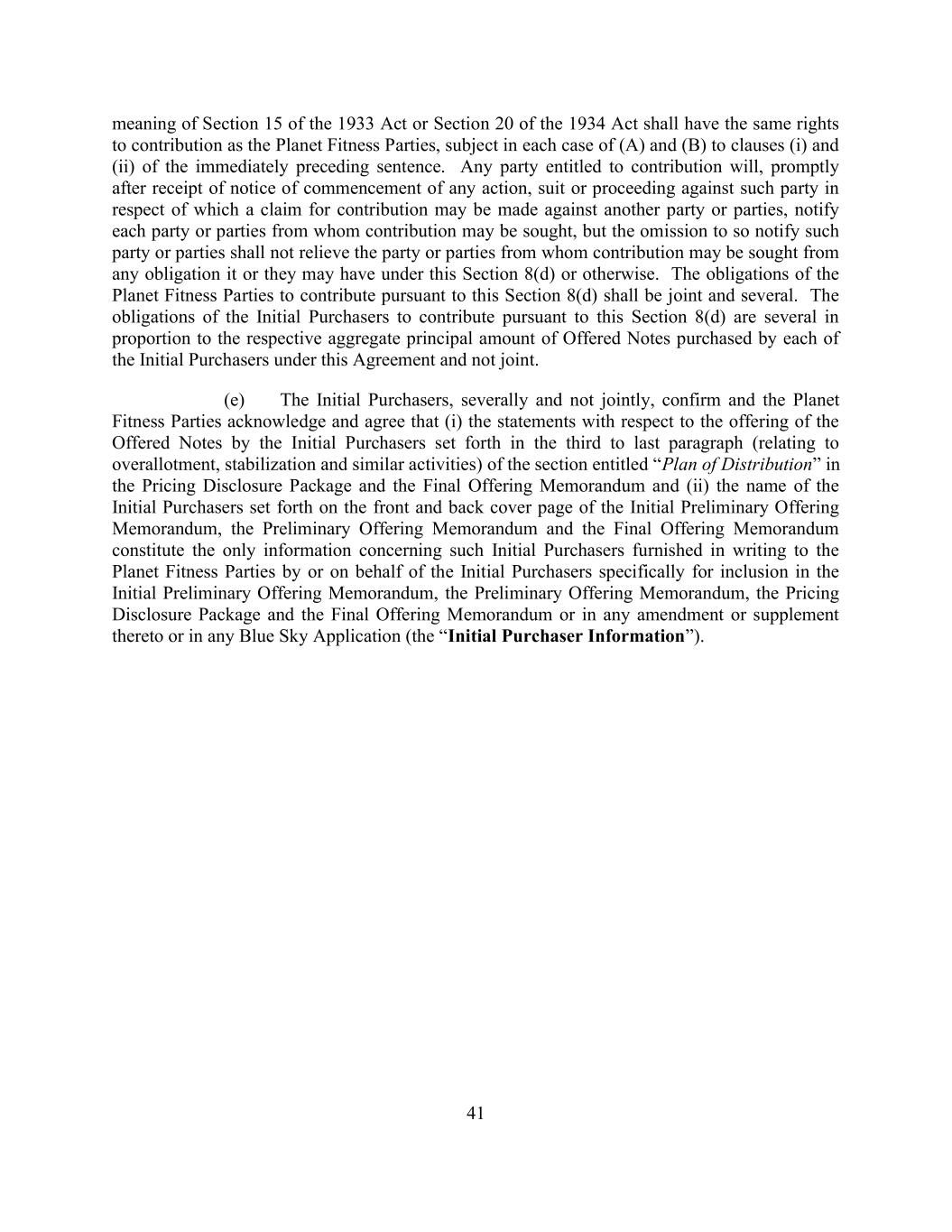 41 meaning of Section 15 of the 1933 Act or Section 20 of the 1934 Act shall have the same rights to contribution as the Planet Fitness Parties, subject in each case of (A) and (B) to clauses (i) and (ii) of the immediately preceding sentence. Any party entitled to contribution will, promptly after receipt of notice of commencement of any action, suit or proceeding against such party in respect of which a claim for contribution may be made against another party or parties, notify each party or parties from whom contribution may be sought, but the omission to so notify such party or parties shall not relieve the party or parties from whom contribution may be sought from any obligation it or they may have under this Section 8(d) or otherwise. The obligations of the Planet Fitness Parties to contribute pursuant to this Section 8(d) shall be joint and several. The obligations of the Initial Purchasers to contribute pursuant to this Section 8(d) are several in proportion to the respective aggregate principal amount of Offered Notes purchased by each of the Initial Purchasers under this Agreement and not joint. (e) The Initial Purchasers, severally and not jointly, confirm and the Planet Fitness Parties acknowledge and agree that (i) the statements with respect to the offering of the Offered Notes by the Initial Purchasers set forth in the third to last paragraph (relating to overallotment, stabilization and similar activities) of the section entitled “Plan of Distribution” in the Pricing Disclosure Package and the Final Offering Memorandum and (ii) the name of the Initial Purchasers set forth on the front and back cover page of the Initial Preliminary Offering Memorandum, the Preliminary Offering Memorandum and the Final Offering Memorandum constitute the only information concerning such Initial Purchasers furnished in writing to the Planet Fitness Parties by or on behalf of the Initial Purchasers specifically for inclusion in the Initial Preliminary Offering Memorandum, the Preliminary Offering Memorandum, the Pricing Disclosure Package and the Final Offering Memorandum or in any amendment or supplement thereto or in any Blue Sky Application (the “Initial Purchaser Information”).