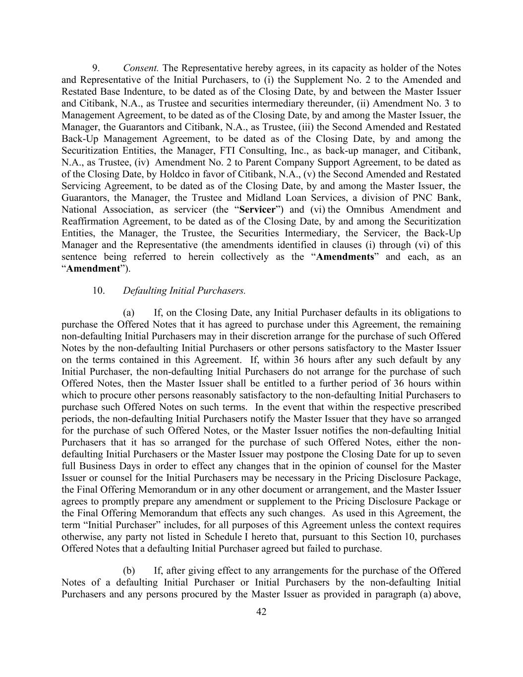 42 9. Consent. The Representative hereby agrees, in its capacity as holder of the Notes and Representative of the Initial Purchasers, to (i) the Supplement No. 2 to the Amended and Restated Base Indenture, to be dated as of the Closing Date, by and between the Master Issuer and Citibank, N.A., as Trustee and securities intermediary thereunder, (ii) Amendment No. 3 to Management Agreement, to be dated as of the Closing Date, by and among the Master Issuer, the Manager, the Guarantors and Citibank, N.A., as Trustee, (iii) the Second Amended and Restated Back-Up Management Agreement, to be dated as of the Closing Date, by and among the Securitization Entities, the Manager, FTI Consulting, Inc., as back-up manager, and Citibank, N.A., as Trustee, (iv) Amendment No. 2 to Parent Company Support Agreement, to be dated as of the Closing Date, by Holdco in favor of Citibank, N.A., (v) the Second Amended and Restated Servicing Agreement, to be dated as of the Closing Date, by and among the Master Issuer, the Guarantors, the Manager, the Trustee and Midland Loan Services, a division of PNC Bank, National Association, as servicer (the “Servicer”) and (vi) the Omnibus Amendment and Reaffirmation Agreement, to be dated as of the Closing Date, by and among the Securitization Entities, the Manager, the Trustee, the Securities Intermediary, the Servicer, the Back-Up Manager and the Representative (the amendments identified in clauses (i) through (vi) of this sentence being referred to herein collectively as the “Amendments” and each, as an “Amendment”). 10. Defaulting Initial Purchasers. (a) If, on the Closing Date, any Initial Purchaser defaults in its obligations to purchase the Offered Notes that it has agreed to purchase under this Agreement, the remaining non-defaulting Initial Purchasers may in their discretion arrange for the purchase of such Offered Notes by the non-defaulting Initial Purchasers or other persons satisfactory to the Master Issuer on the terms contained in this Agreement. If, within 36 hours after any such default by any Initial Purchaser, the non-defaulting Initial Purchasers do not arrange for the purchase of such Offered Notes, then the Master Issuer shall be entitled to a further period of 36 hours within which to procure other persons reasonably satisfactory to the non-defaulting Initial Purchasers to purchase such Offered Notes on such terms. In the event that within the respective prescribed periods, the non-defaulting Initial Purchasers notify the Master Issuer that they have so arranged for the purchase of such Offered Notes, or the Master Issuer notifies the non-defaulting Initial Purchasers that it has so arranged for the purchase of such Offered Notes, either the non- defaulting Initial Purchasers or the Master Issuer may postpone the Closing Date for up to seven full Business Days in order to effect any changes that in the opinion of counsel for the Master Issuer or counsel for the Initial Purchasers may be necessary in the Pricing Disclosure Package, the Final Offering Memorandum or in any other document or arrangement, and the Master Issuer agrees to promptly prepare any amendment or supplement to the Pricing Disclosure Package or the Final Offering Memorandum that effects any such changes. As used in this Agreement, the term “Initial Purchaser” includes, for all purposes of this Agreement unless the context requires otherwise, any party not listed in Schedule I hereto that, pursuant to this Section 10, purchases Offered Notes that a defaulting Initial Purchaser agreed but failed to purchase. (b) If, after giving effect to any arrangements for the purchase of the Offered Notes of a defaulting Initial Purchaser or Initial Purchasers by the non-defaulting Initial Purchasers and any persons procured by the Master Issuer as provided in paragraph (a) above,