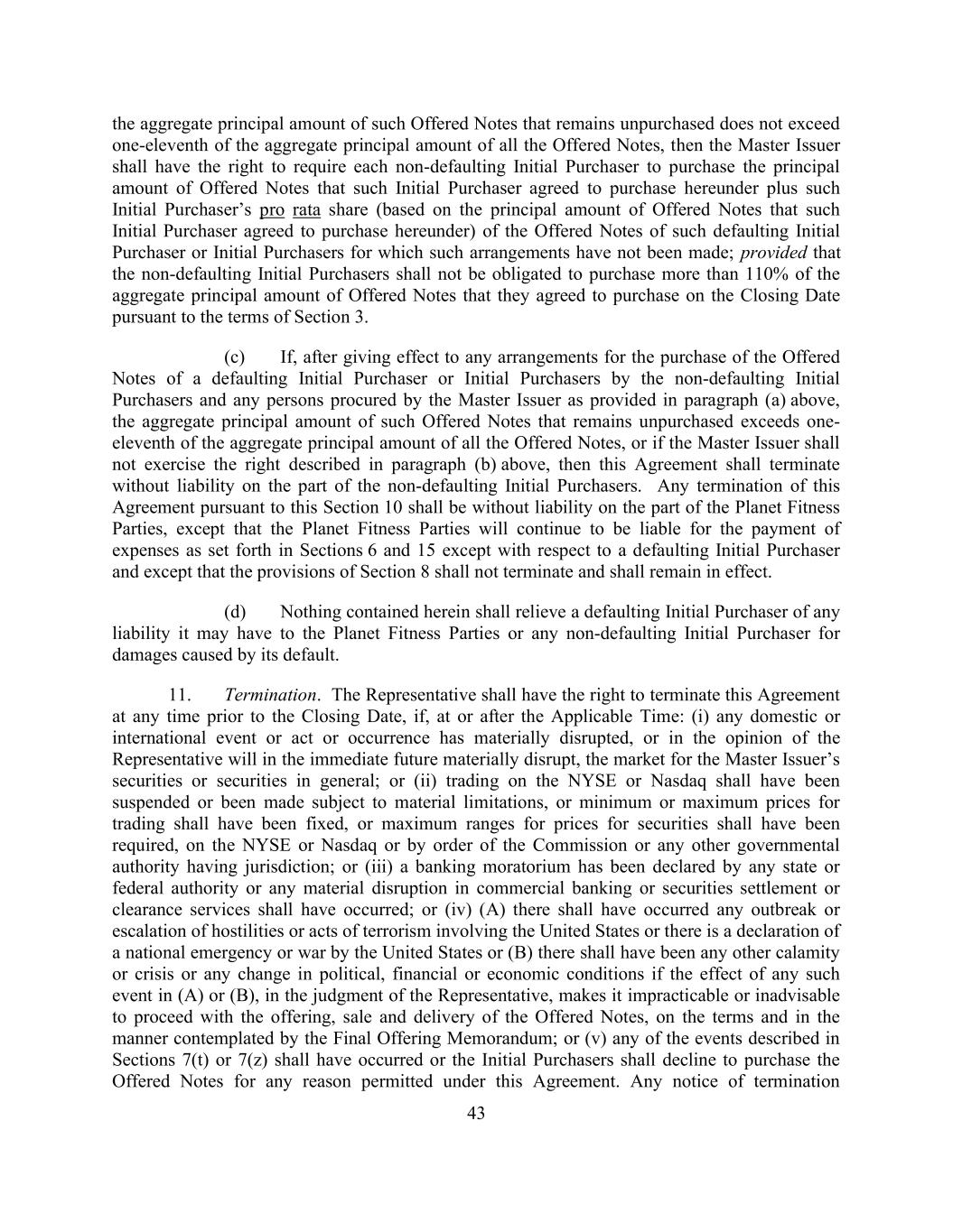 43 the aggregate principal amount of such Offered Notes that remains unpurchased does not exceed one-eleventh of the aggregate principal amount of all the Offered Notes, then the Master Issuer shall have the right to require each non-defaulting Initial Purchaser to purchase the principal amount of Offered Notes that such Initial Purchaser agreed to purchase hereunder plus such Initial Purchaser’s pro rata share (based on the principal amount of Offered Notes that such Initial Purchaser agreed to purchase hereunder) of the Offered Notes of such defaulting Initial Purchaser or Initial Purchasers for which such arrangements have not been made; provided that the non-defaulting Initial Purchasers shall not be obligated to purchase more than 110% of the aggregate principal amount of Offered Notes that they agreed to purchase on the Closing Date pursuant to the terms of Section 3. (c) If, after giving effect to any arrangements for the purchase of the Offered Notes of a defaulting Initial Purchaser or Initial Purchasers by the non-defaulting Initial Purchasers and any persons procured by the Master Issuer as provided in paragraph (a) above, the aggregate principal amount of such Offered Notes that remains unpurchased exceeds one- eleventh of the aggregate principal amount of all the Offered Notes, or if the Master Issuer shall not exercise the right described in paragraph (b) above, then this Agreement shall terminate without liability on the part of the non-defaulting Initial Purchasers. Any termination of this Agreement pursuant to this Section 10 shall be without liability on the part of the Planet Fitness Parties, except that the Planet Fitness Parties will continue to be liable for the payment of expenses as set forth in Sections 6 and 15 except with respect to a defaulting Initial Purchaser and except that the provisions of Section 8 shall not terminate and shall remain in effect. (d) Nothing contained herein shall relieve a defaulting Initial Purchaser of any liability it may have to the Planet Fitness Parties or any non-defaulting Initial Purchaser for damages caused by its default. 11. Termination. The Representative shall have the right to terminate this Agreement at any time prior to the Closing Date, if, at or after the Applicable Time: (i) any domestic or international event or act or occurrence has materially disrupted, or in the opinion of the Representative will in the immediate future materially disrupt, the market for the Master Issuer’s securities or securities in general; or (ii) trading on the NYSE or Nasdaq shall have been suspended or been made subject to material limitations, or minimum or maximum prices for trading shall have been fixed, or maximum ranges for prices for securities shall have been required, on the NYSE or Nasdaq or by order of the Commission or any other governmental authority having jurisdiction; or (iii) a banking moratorium has been declared by any state or federal authority or any material disruption in commercial banking or securities settlement or clearance services shall have occurred; or (iv) (A) there shall have occurred any outbreak or escalation of hostilities or acts of terrorism involving the United States or there is a declaration of a national emergency or war by the United States or (B) there shall have been any other calamity or crisis or any change in political, financial or economic conditions if the effect of any such event in (A) or (B), in the judgment of the Representative, makes it impracticable or inadvisable to proceed with the offering, sale and delivery of the Offered Notes, on the terms and in the manner contemplated by the Final Offering Memorandum; or (v) any of the events described in Sections 7(t) or 7(z) shall have occurred or the Initial Purchasers shall decline to purchase the Offered Notes for any reason permitted under this Agreement. Any notice of termination