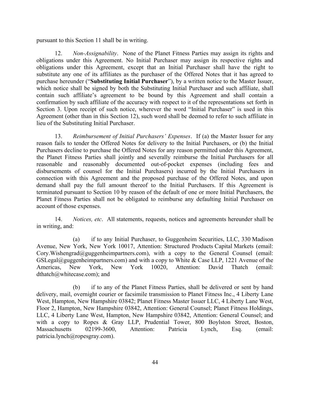 44 pursuant to this Section 11 shall be in writing. 12. Non-Assignability. None of the Planet Fitness Parties may assign its rights and obligations under this Agreement. No Initial Purchaser may assign its respective rights and obligations under this Agreement, except that an Initial Purchaser shall have the right to substitute any one of its affiliates as the purchaser of the Offered Notes that it has agreed to purchase hereunder (“Substituting Initial Purchaser”), by a written notice to the Master Issuer, which notice shall be signed by both the Substituting Initial Purchaser and such affiliate, shall contain such affiliate’s agreement to be bound by this Agreement and shall contain a confirmation by such affiliate of the accuracy with respect to it of the representations set forth in Section 3. Upon receipt of such notice, wherever the word “Initial Purchaser” is used in this Agreement (other than in this Section 12), such word shall be deemed to refer to such affiliate in lieu of the Substituting Initial Purchaser. 13. Reimbursement of Initial Purchasers’ Expenses. If (a) the Master Issuer for any reason fails to tender the Offered Notes for delivery to the Initial Purchasers, or (b) the Initial Purchasers decline to purchase the Offered Notes for any reason permitted under this Agreement, the Planet Fitness Parties shall jointly and severally reimburse the Initial Purchasers for all reasonable and reasonably documented out-of-pocket expenses (including fees and disbursements of counsel for the Initial Purchasers) incurred by the Initial Purchasers in connection with this Agreement and the proposed purchase of the Offered Notes, and upon demand shall pay the full amount thereof to the Initial Purchasers. If this Agreement is terminated pursuant to Section 10 by reason of the default of one or more Initial Purchasers, the Planet Fitness Parties shall not be obligated to reimburse any defaulting Initial Purchaser on account of those expenses. 14. Notices, etc. All statements, requests, notices and agreements hereunder shall be in writing, and: (a) if to any Initial Purchaser, to Guggenheim Securities, LLC, 330 Madison Avenue, New York, New York 10017, Attention: Structured Products Capital Markets (email: Cory.Wishengrad@guggenheimpartners.com), with a copy to the General Counsel (email: GSLegal@guggenheimpartners.com) and with a copy to White & Case LLP, 1221 Avenue of the Americas, New York, New York 10020, Attention: David Thatch (email: dthatch@whitecase.com); and (b) if to any of the Planet Fitness Parties, shall be delivered or sent by hand delivery, mail, overnight courier or facsimile transmission to Planet Fitness Inc., 4 Liberty Lane West, Hampton, New Hampshire 03842; Planet Fitness Master Issuer LLC, 4 Liberty Lane West, Floor 2, Hampton, New Hampshire 03842, Attention: General Counsel; Planet Fitness Holdings, LLC, 4 Liberty Lane West, Hampton, New Hampshire 03842, Attention: General Counsel; and with a copy to Ropes & Gray LLP, Prudential Tower, 800 Boylston Street, Boston, Massachusetts 02199-3600, Attention: Patricia Lynch, Esq. (email: patricia.lynch@ropesgray.com).