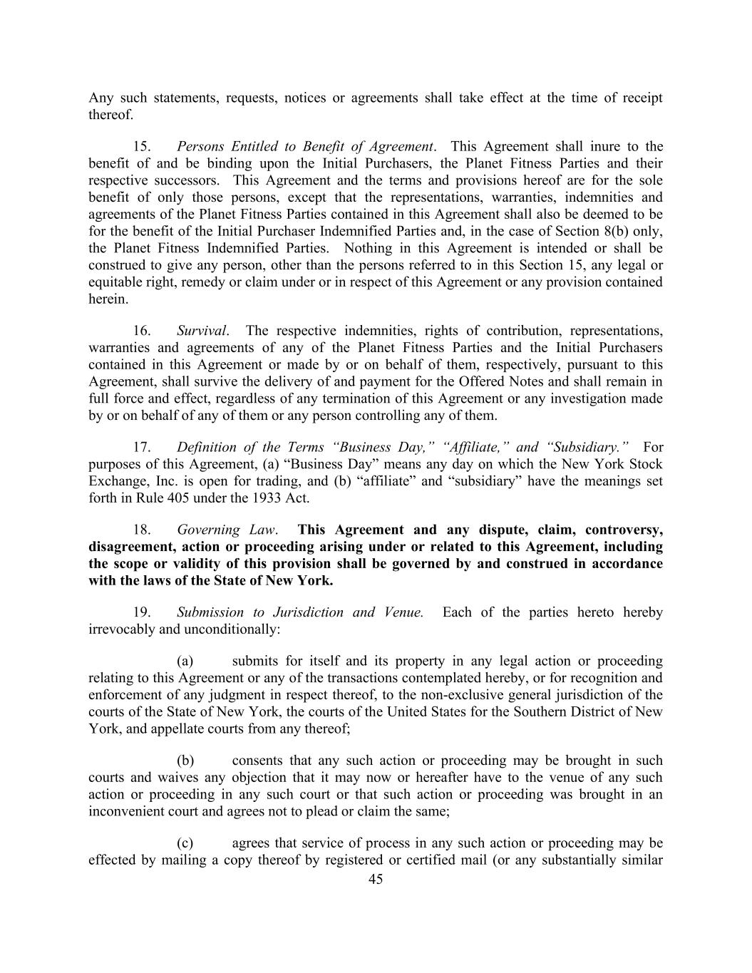 45 Any such statements, requests, notices or agreements shall take effect at the time of receipt thereof. 15. Persons Entitled to Benefit of Agreement. This Agreement shall inure to the benefit of and be binding upon the Initial Purchasers, the Planet Fitness Parties and their respective successors. This Agreement and the terms and provisions hereof are for the sole benefit of only those persons, except that the representations, warranties, indemnities and agreements of the Planet Fitness Parties contained in this Agreement shall also be deemed to be for the benefit of the Initial Purchaser Indemnified Parties and, in the case of Section 8(b) only, the Planet Fitness Indemnified Parties. Nothing in this Agreement is intended or shall be construed to give any person, other than the persons referred to in this Section 15, any legal or equitable right, remedy or claim under or in respect of this Agreement or any provision contained herein. 16. Survival. The respective indemnities, rights of contribution, representations, warranties and agreements of any of the Planet Fitness Parties and the Initial Purchasers contained in this Agreement or made by or on behalf of them, respectively, pursuant to this Agreement, shall survive the delivery of and payment for the Offered Notes and shall remain in full force and effect, regardless of any termination of this Agreement or any investigation made by or on behalf of any of them or any person controlling any of them. 17. Definition of the Terms “Business Day,” “Affiliate,” and “Subsidiary.” For purposes of this Agreement, (a) “Business Day” means any day on which the New York Stock Exchange, Inc. is open for trading, and (b) “affiliate” and “subsidiary” have the meanings set forth in Rule 405 under the 1933 Act. 18. Governing Law. This Agreement and any dispute, claim, controversy, disagreement, action or proceeding arising under or related to this Agreement, including the scope or validity of this provision shall be governed by and construed in accordance with the laws of the State of New York. 19. Submission to Jurisdiction and Venue. Each of the parties hereto hereby irrevocably and unconditionally: (a) submits for itself and its property in any legal action or proceeding relating to this Agreement or any of the transactions contemplated hereby, or for recognition and enforcement of any judgment in respect thereof, to the non-exclusive general jurisdiction of the courts of the State of New York, the courts of the United States for the Southern District of New York, and appellate courts from any thereof; (b) consents that any such action or proceeding may be brought in such courts and waives any objection that it may now or hereafter have to the venue of any such action or proceeding in any such court or that such action or proceeding was brought in an inconvenient court and agrees not to plead or claim the same; (c) agrees that service of process in any such action or proceeding may be effected by mailing a copy thereof by registered or certified mail (or any substantially similar