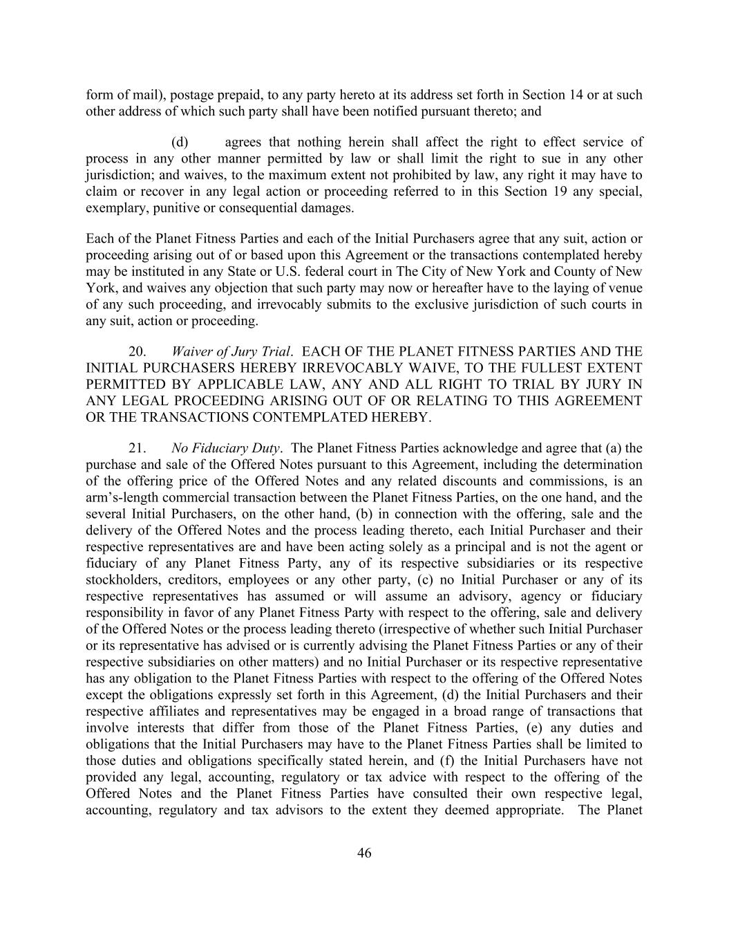 46 form of mail), postage prepaid, to any party hereto at its address set forth in Section 14 or at such other address of which such party shall have been notified pursuant thereto; and (d) agrees that nothing herein shall affect the right to effect service of process in any other manner permitted by law or shall limit the right to sue in any other jurisdiction; and waives, to the maximum extent not prohibited by law, any right it may have to claim or recover in any legal action or proceeding referred to in this Section 19 any special, exemplary, punitive or consequential damages. Each of the Planet Fitness Parties and each of the Initial Purchasers agree that any suit, action or proceeding arising out of or based upon this Agreement or the transactions contemplated hereby may be instituted in any State or U.S. federal court in The City of New York and County of New York, and waives any objection that such party may now or hereafter have to the laying of venue of any such proceeding, and irrevocably submits to the exclusive jurisdiction of such courts in any suit, action or proceeding. 20. Waiver of Jury Trial. EACH OF THE PLANET FITNESS PARTIES AND THE INITIAL PURCHASERS HEREBY IRREVOCABLY WAIVE, TO THE FULLEST EXTENT PERMITTED BY APPLICABLE LAW, ANY AND ALL RIGHT TO TRIAL BY JURY IN ANY LEGAL PROCEEDING ARISING OUT OF OR RELATING TO THIS AGREEMENT OR THE TRANSACTIONS CONTEMPLATED HEREBY. 21. No Fiduciary Duty. The Planet Fitness Parties acknowledge and agree that (a) the purchase and sale of the Offered Notes pursuant to this Agreement, including the determination of the offering price of the Offered Notes and any related discounts and commissions, is an arm’s-length commercial transaction between the Planet Fitness Parties, on the one hand, and the several Initial Purchasers, on the other hand, (b) in connection with the offering, sale and the delivery of the Offered Notes and the process leading thereto, each Initial Purchaser and their respective representatives are and have been acting solely as a principal and is not the agent or fiduciary of any Planet Fitness Party, any of its respective subsidiaries or its respective stockholders, creditors, employees or any other party, (c) no Initial Purchaser or any of its respective representatives has assumed or will assume an advisory, agency or fiduciary responsibility in favor of any Planet Fitness Party with respect to the offering, sale and delivery of the Offered Notes or the process leading thereto (irrespective of whether such Initial Purchaser or its representative has advised or is currently advising the Planet Fitness Parties or any of their respective subsidiaries on other matters) and no Initial Purchaser or its respective representative has any obligation to the Planet Fitness Parties with respect to the offering of the Offered Notes except the obligations expressly set forth in this Agreement, (d) the Initial Purchasers and their respective affiliates and representatives may be engaged in a broad range of transactions that involve interests that differ from those of the Planet Fitness Parties, (e) any duties and obligations that the Initial Purchasers may have to the Planet Fitness Parties shall be limited to those duties and obligations specifically stated herein, and (f) the Initial Purchasers have not provided any legal, accounting, regulatory or tax advice with respect to the offering of the Offered Notes and the Planet Fitness Parties have consulted their own respective legal, accounting, regulatory and tax advisors to the extent they deemed appropriate. The Planet