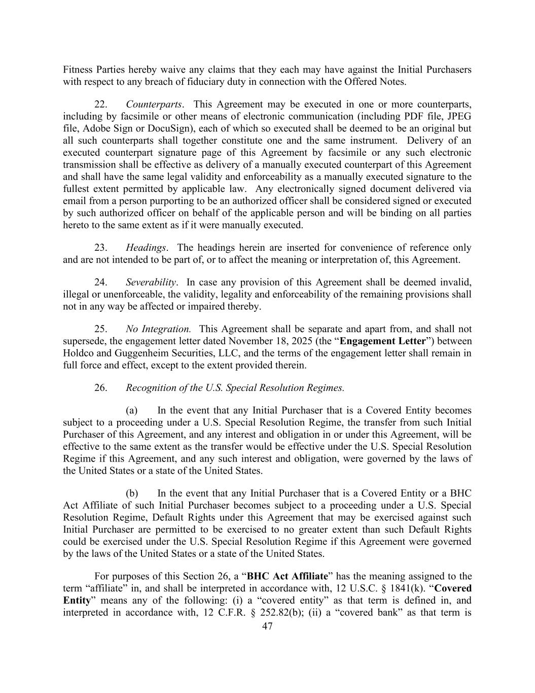 47 Fitness Parties hereby waive any claims that they each may have against the Initial Purchasers with respect to any breach of fiduciary duty in connection with the Offered Notes. 22. Counterparts. This Agreement may be executed in one or more counterparts, including by facsimile or other means of electronic communication (including PDF file, JPEG file, Adobe Sign or DocuSign), each of which so executed shall be deemed to be an original but all such counterparts shall together constitute one and the same instrument. Delivery of an executed counterpart signature page of this Agreement by facsimile or any such electronic transmission shall be effective as delivery of a manually executed counterpart of this Agreement and shall have the same legal validity and enforceability as a manually executed signature to the fullest extent permitted by applicable law. Any electronically signed document delivered via email from a person purporting to be an authorized officer shall be considered signed or executed by such authorized officer on behalf of the applicable person and will be binding on all parties hereto to the same extent as if it were manually executed. 23. Headings. The headings herein are inserted for convenience of reference only and are not intended to be part of, or to affect the meaning or interpretation of, this Agreement. 24. Severability. In case any provision of this Agreement shall be deemed invalid, illegal or unenforceable, the validity, legality and enforceability of the remaining provisions shall not in any way be affected or impaired thereby. 25. No Integration. This Agreement shall be separate and apart from, and shall not supersede, the engagement letter dated November 18, 2025 (the “Engagement Letter”) between Holdco and Guggenheim Securities, LLC, and the terms of the engagement letter shall remain in full force and effect, except to the extent provided therein. 26. Recognition of the U.S. Special Resolution Regimes. (a) In the event that any Initial Purchaser that is a Covered Entity becomes subject to a proceeding under a U.S. Special Resolution Regime, the transfer from such Initial Purchaser of this Agreement, and any interest and obligation in or under this Agreement, will be effective to the same extent as the transfer would be effective under the U.S. Special Resolution Regime if this Agreement, and any such interest and obligation, were governed by the laws of the United States or a state of the United States. (b) In the event that any Initial Purchaser that is a Covered Entity or a BHC Act Affiliate of such Initial Purchaser becomes subject to a proceeding under a U.S. Special Resolution Regime, Default Rights under this Agreement that may be exercised against such Initial Purchaser are permitted to be exercised to no greater extent than such Default Rights could be exercised under the U.S. Special Resolution Regime if this Agreement were governed by the laws of the United States or a state of the United States. For purposes of this Section 26, a “BHC Act Affiliate” has the meaning assigned to the term “affiliate” in, and shall be interpreted in accordance with, 12 U.S.C. § 1841(k). “Covered Entity” means any of the following: (i) a “covered entity” as that term is defined in, and interpreted in accordance with, 12 C.F.R. § 252.82(b); (ii) a “covered bank” as that term is