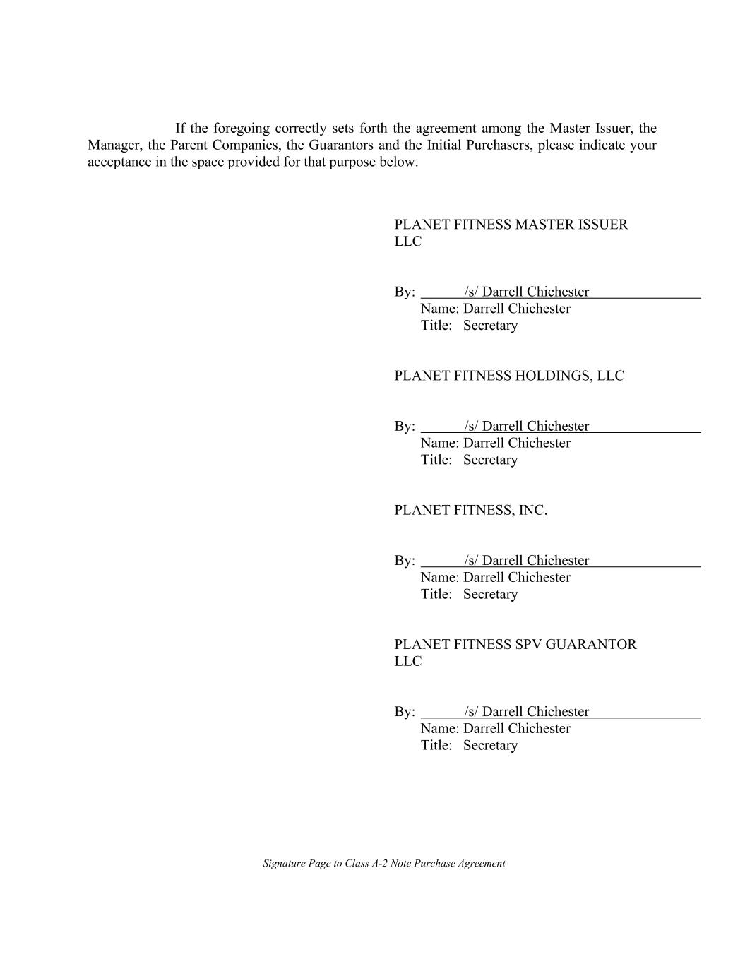 Signature Page to Class A-2 Note Purchase Agreement If the foregoing correctly sets forth the agreement among the Master Issuer, the Manager, the Parent Companies, the Guarantors and the Initial Purchasers, please indicate your acceptance in the space provided for that purpose below. PLANET FITNESS MASTER ISSUER LLC By: /s/ Darrell Chichester Name: Darrell Chichester Title: Secretary PLANET FITNESS HOLDINGS, LLC By: /s/ Darrell Chichester Name: Darrell Chichester Title: Secretary PLANET FITNESS, INC. By: /s/ Darrell Chichester Name: Darrell Chichester Title: Secretary PLANET FITNESS SPV GUARANTOR LLC By: /s/ Darrell Chichester Name: Darrell Chichester Title: Secretary