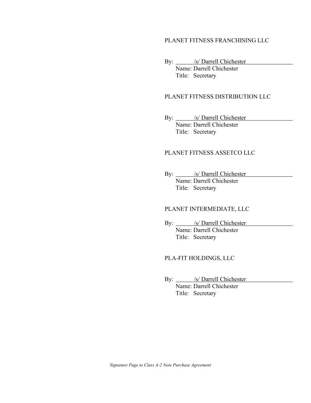 Signature Page to Class A-2 Note Purchase Agreement PLANET FITNESS FRANCHISING LLC By: /s/ Darrell Chichester Name: Darrell Chichester Title: Secretary PLANET FITNESS DISTRIBUTION LLC By: /s/ Darrell Chichester Name: Darrell Chichester Title: Secretary PLANET FITNESS ASSETCO LLC By: /s/ Darrell Chichester Name: Darrell Chichester Title: Secretary PLANET INTERMEDIATE, LLC By: /s/ Darrell Chichester Name: Darrell Chichester Title: Secretary PLA-FIT HOLDINGS, LLC By: /s/ Darrell Chichester Name: Darrell Chichester Title: Secretary