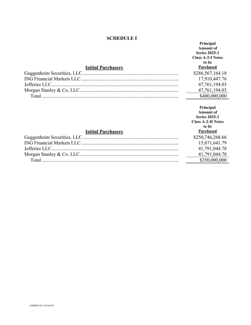 AMERICAS 131541145 SCHEDULE I Principal Amount of Series 2025-1 Class A-2-I Notes to be Initial Purchasers Purchased Guggenheim Securities, LLC .............................................................................. $286,567,164.18 ING Financial Markets LLC ............................................................................... 17,910,447.76 Jefferies LLC ....................................................................................................... 47,761,194.03 Morgan Stanley & Co. LLC ................................................................................ 47,761,194.03 Total ............................................................................................................... $400,000,000 Principal Amount of Series 2025-1 Class A-2-II Notes to be Initial Purchasers Purchased Guggenheim Securities, LLC .............................................................................. $250,746,268.66 ING Financial Markets LLC ............................................................................... 15,671,641.79 Jefferies LLC ....................................................................................................... 41,791,044.78 Morgan Stanley & Co. LLC ................................................................................ 41,791,044.78 Total ............................................................................................................... $350,000,000