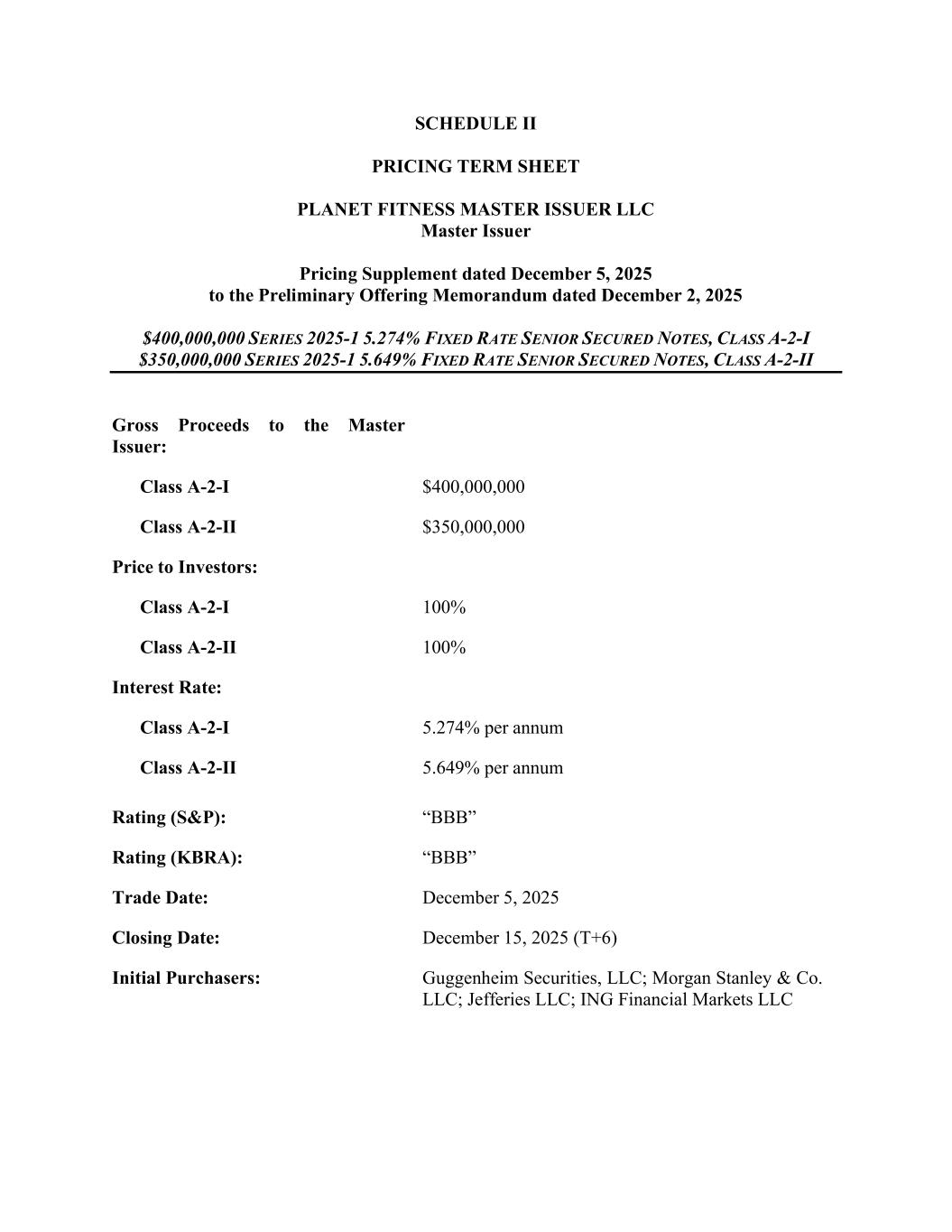 SCHEDULE II PRICING TERM SHEET PLANET FITNESS MASTER ISSUER LLC Master Issuer Pricing Supplement dated December 5, 2025 to the Preliminary Offering Memorandum dated December 2, 2025 $400,000,000 SERIES 2025-1 5.274% FIXED RATE SENIOR SECURED NOTES, CLASS A-2-I $350,000,000 SERIES 2025-1 5.649% FIXED RATE SENIOR SECURED NOTES, CLASS A-2-II Gross Proceeds to the Master Issuer: Class A-2-I $400,000,000 Class A-2-II $350,000,000 Price to Investors: Class A-2-I 100% Class A-2-II 100% Interest Rate: Class A-2-I 5.274% per annum Class A-2-II 5.649% per annum Rating (S&P): “BBB” Rating (KBRA): “BBB” Trade Date: December 5, 2025 Closing Date: December 15, 2025 (T+6) Initial Purchasers: Guggenheim Securities, LLC; Morgan Stanley & Co. LLC; Jefferies LLC; ING Financial Markets LLC