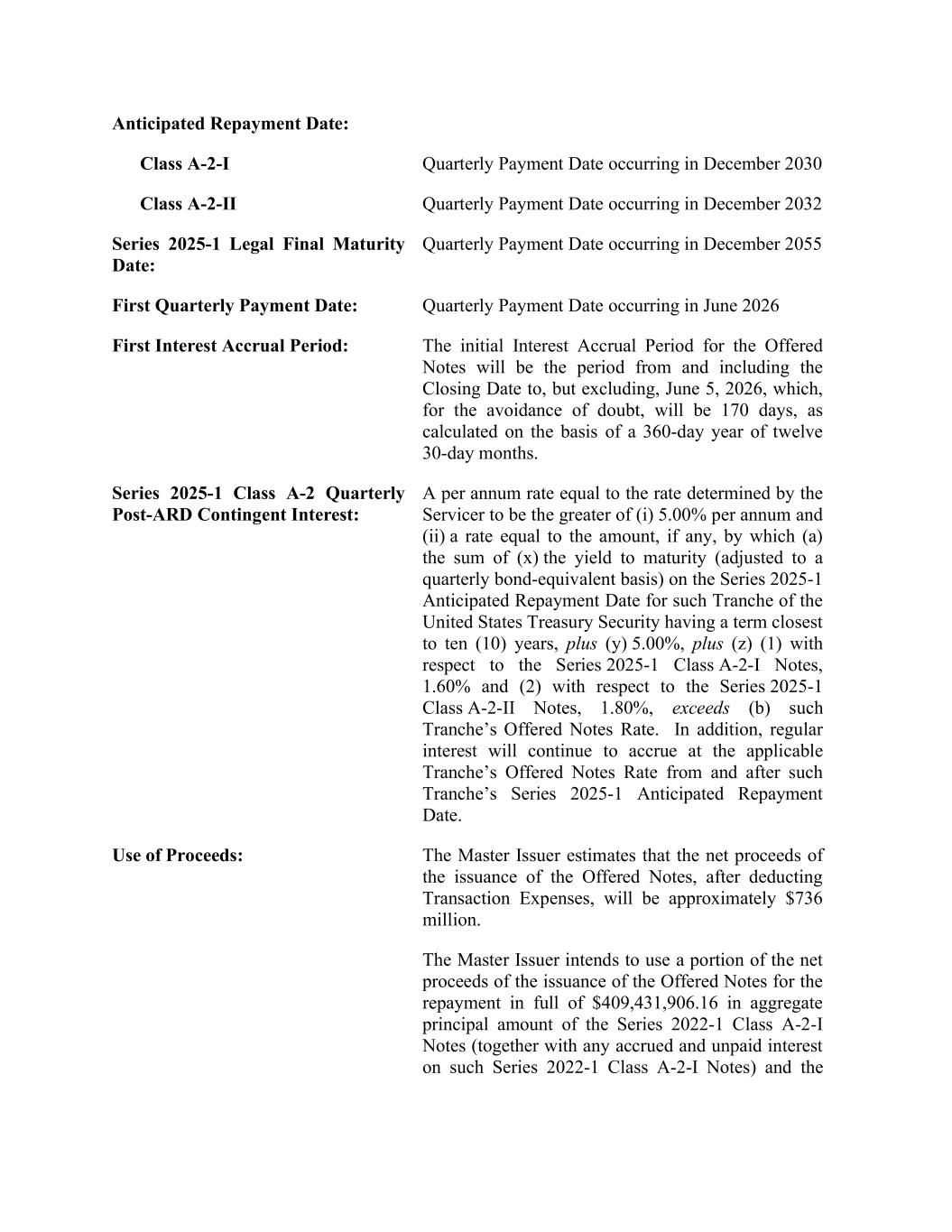Anticipated Repayment Date: Class A-2-I Quarterly Payment Date occurring in December 2030 Class A-2-II Quarterly Payment Date occurring in December 2032 Series 2025-1 Legal Final Maturity Date: Quarterly Payment Date occurring in December 2055 First Quarterly Payment Date: Quarterly Payment Date occurring in June 2026 First Interest Accrual Period: The initial Interest Accrual Period for the Offered Notes will be the period from and including the Closing Date to, but excluding, June 5, 2026, which, for the avoidance of doubt, will be 170 days, as calculated on the basis of a 360-day year of twelve 30-day months. Series 2025-1 Class A-2 Quarterly Post-ARD Contingent Interest: A per annum rate equal to the rate determined by the Servicer to be the greater of (i) 5.00% per annum and (ii) a rate equal to the amount, if any, by which (a) the sum of (x) the yield to maturity (adjusted to a quarterly bond-equivalent basis) on the Series 2025-1 Anticipated Repayment Date for such Tranche of the United States Treasury Security having a term closest to ten (10) years, plus (y) 5.00%, plus (z) (1) with respect to the Series 2025-1 Class A-2-I Notes, 1.60% and (2) with respect to the Series 2025-1 Class A-2-II Notes, 1.80%, exceeds (b) such Tranche’s Offered Notes Rate. In addition, regular interest will continue to accrue at the applicable Tranche’s Offered Notes Rate from and after such Tranche’s Series 2025-1 Anticipated Repayment Date. Use of Proceeds: The Master Issuer estimates that the net proceeds of the issuance of the Offered Notes, after deducting Transaction Expenses, will be approximately $736 million. The Master Issuer intends to use a portion of the net proceeds of the issuance of the Offered Notes for the repayment in full of $409,431,906.16 in aggregate principal amount of the Series 2022-1 Class A-2-I Notes (together with any accrued and unpaid interest on such Series 2022-1 Class A-2-I Notes) and the