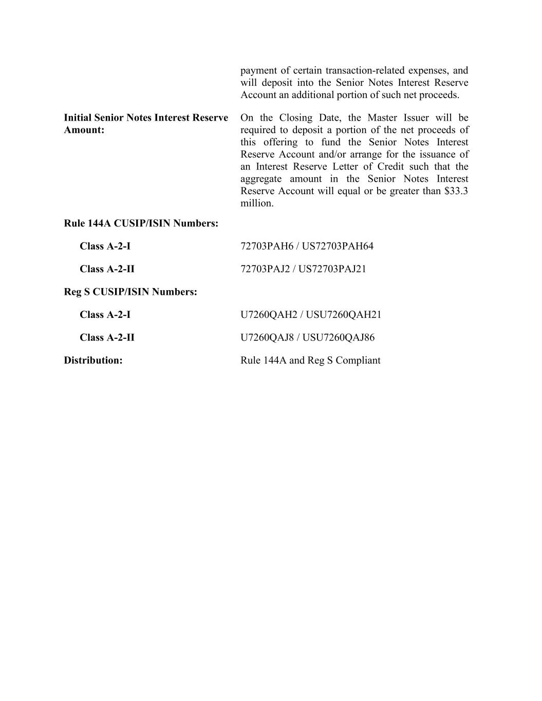 payment of certain transaction-related expenses, and will deposit into the Senior Notes Interest Reserve Account an additional portion of such net proceeds. Initial Senior Notes Interest Reserve Amount: On the Closing Date, the Master Issuer will be required to deposit a portion of the net proceeds of this offering to fund the Senior Notes Interest Reserve Account and/or arrange for the issuance of an Interest Reserve Letter of Credit such that the aggregate amount in the Senior Notes Interest Reserve Account will equal or be greater than $33.3 million. Rule 144A CUSIP/ISIN Numbers: Class A-2-I 72703PAH6 / US72703PAH64 Class A-2-II 72703PAJ2 / US72703PAJ21 Reg S CUSIP/ISIN Numbers: Class A-2-I U7260QAH2 / USU7260QAH21 Class A-2-II U7260QAJ8 / USU7260QAJ86 Distribution: Rule 144A and Reg S Compliant