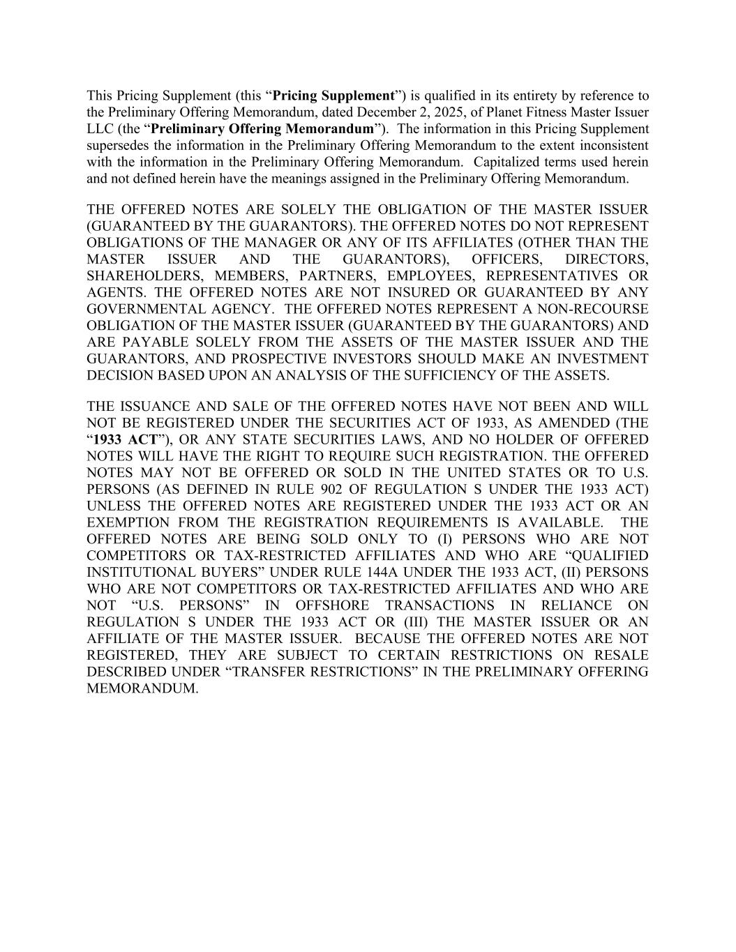 This Pricing Supplement (this “Pricing Supplement”) is qualified in its entirety by reference to the Preliminary Offering Memorandum, dated December 2, 2025, of Planet Fitness Master Issuer LLC (the “Preliminary Offering Memorandum”). The information in this Pricing Supplement supersedes the information in the Preliminary Offering Memorandum to the extent inconsistent with the information in the Preliminary Offering Memorandum. Capitalized terms used herein and not defined herein have the meanings assigned in the Preliminary Offering Memorandum. THE OFFERED NOTES ARE SOLELY THE OBLIGATION OF THE MASTER ISSUER (GUARANTEED BY THE GUARANTORS). THE OFFERED NOTES DO NOT REPRESENT OBLIGATIONS OF THE MANAGER OR ANY OF ITS AFFILIATES (OTHER THAN THE MASTER ISSUER AND THE GUARANTORS), OFFICERS, DIRECTORS, SHAREHOLDERS, MEMBERS, PARTNERS, EMPLOYEES, REPRESENTATIVES OR AGENTS. THE OFFERED NOTES ARE NOT INSURED OR GUARANTEED BY ANY GOVERNMENTAL AGENCY. THE OFFERED NOTES REPRESENT A NON-RECOURSE OBLIGATION OF THE MASTER ISSUER (GUARANTEED BY THE GUARANTORS) AND ARE PAYABLE SOLELY FROM THE ASSETS OF THE MASTER ISSUER AND THE GUARANTORS, AND PROSPECTIVE INVESTORS SHOULD MAKE AN INVESTMENT DECISION BASED UPON AN ANALYSIS OF THE SUFFICIENCY OF THE ASSETS. THE ISSUANCE AND SALE OF THE OFFERED NOTES HAVE NOT BEEN AND WILL NOT BE REGISTERED UNDER THE SECURITIES ACT OF 1933, AS AMENDED (THE “1933 ACT”), OR ANY STATE SECURITIES LAWS, AND NO HOLDER OF OFFERED NOTES WILL HAVE THE RIGHT TO REQUIRE SUCH REGISTRATION. THE OFFERED NOTES MAY NOT BE OFFERED OR SOLD IN THE UNITED STATES OR TO U.S. PERSONS (AS DEFINED IN RULE 902 OF REGULATION S UNDER THE 1933 ACT) UNLESS THE OFFERED NOTES ARE REGISTERED UNDER THE 1933 ACT OR AN EXEMPTION FROM THE REGISTRATION REQUIREMENTS IS AVAILABLE. THE OFFERED NOTES ARE BEING SOLD ONLY TO (I) PERSONS WHO ARE NOT COMPETITORS OR TAX-RESTRICTED AFFILIATES AND WHO ARE “QUALIFIED INSTITUTIONAL BUYERS” UNDER RULE 144A UNDER THE 1933 ACT, (II) PERSONS WHO ARE NOT COMPETITORS OR TAX-RESTRICTED AFFILIATES AND WHO ARE NOT “U.S. PERSONS” IN OFFSHORE TRANSACTIONS IN RELIANCE ON REGULATION S UNDER THE 1933 ACT OR (III) THE MASTER ISSUER OR AN AFFILIATE OF THE MASTER ISSUER. BECAUSE THE OFFERED NOTES ARE NOT REGISTERED, THEY ARE SUBJECT TO CERTAIN RESTRICTIONS ON RESALE DESCRIBED UNDER “TRANSFER RESTRICTIONS” IN THE PRELIMINARY OFFERING MEMORANDUM.